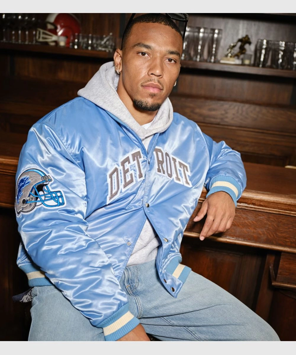 Shop Abercrombie Detroit Lions Blue Satin Varsity Bomber Jacket For Men’s