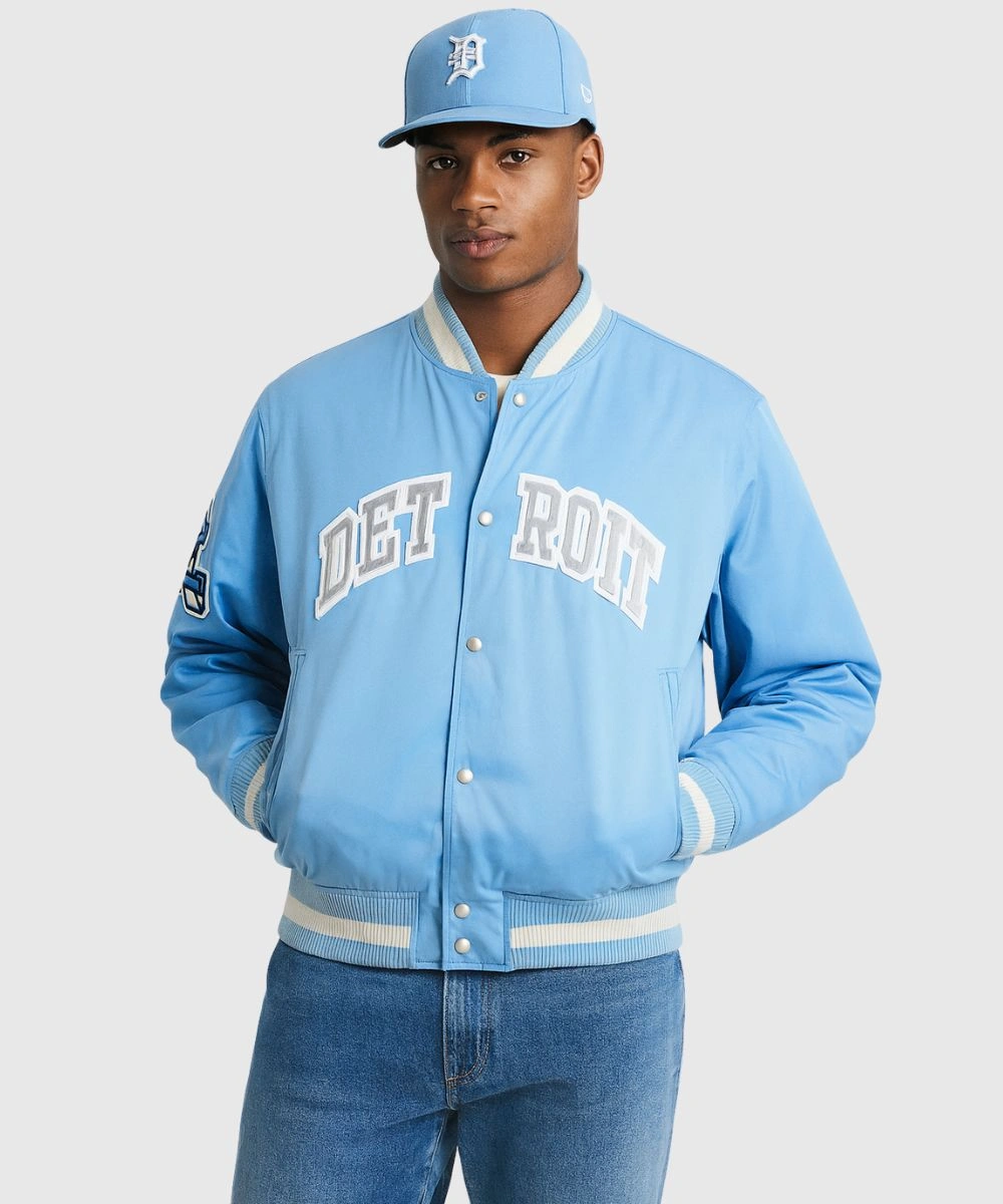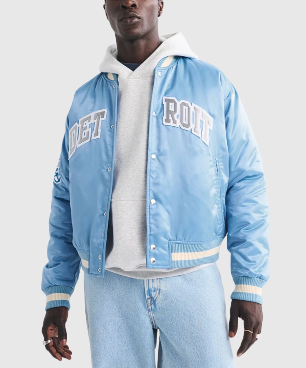 This lightweight and durable jacket allows you to display your team pride wherever you head. Its relaxed fit makes layering simple over your favourite attire. Abercrombie Detroit Lions Satin Varsity Blue Bomber Jacket For Men’s has complementing striped rib knit cuffs and hem to keep the structured silhouette and comfort maintained. The sky blue design is versatile enough to make a standout statement. Whether you need a sporty flair or everyday practicality. Functional side pockets offer cosy space for hands and carrying essentials.