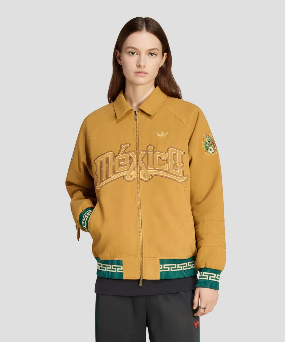 This garment features an embossed MEXICO patch with minimal Adidas trademark branding on the front and sleeves. It has tonal fringe ruffles on the lower side of the sleeves and quilted panels for a rugged look. Finished with ribbed cuffs and a reinforced hemline with a repeating gold geometric pattern for a designer touch. It keeps the sporty fit snug and wraps around the wrists and waist to hold the Adidas Originals FIFA World Cup Mexico 2026 Jacket shape. The front has twin spacious side entry pockets to keep your daily essentials. Ideal for fans who value statements beyond standard sportswear. It has a massive sporting crest at the back to create a bold, “FIFA World Cup” style statement piece. The durability and versatility celebrate the world’s biggest sporting event with high-end materials–Get yours before it is sold out!Â