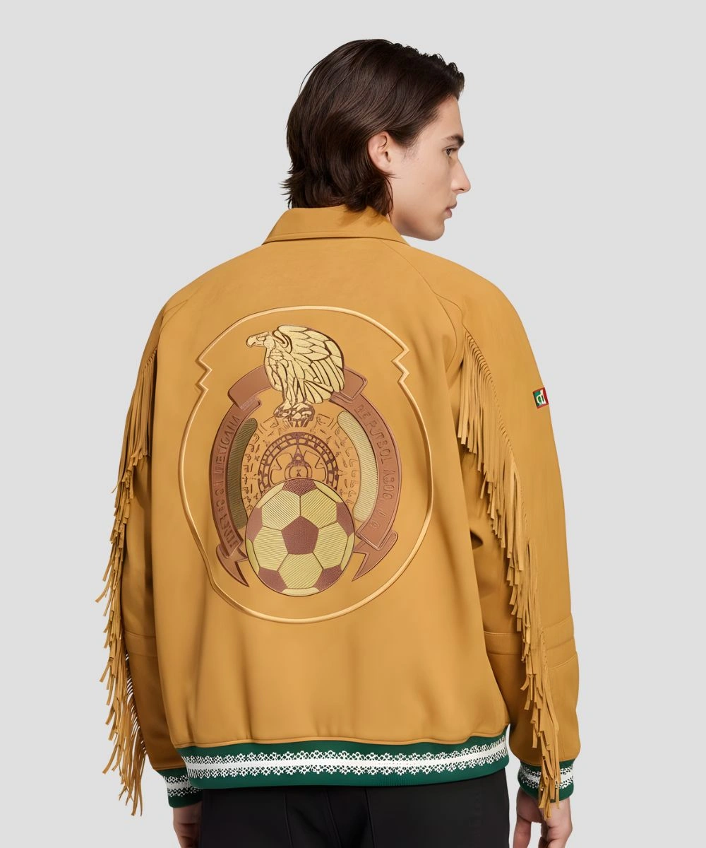 Step onto the pitch with the spirit of football heritage in this FIFA World Cup Mexico 2026 Jacket. This pre-owned piece is defined by its rich suede exterior in a striking mustard hue. The smooth fabric feels good against the skin and keeps you warm during transitional weather. It combines retro designs with sophisticated street style that pays tribute to the upcoming world event. The design features a sharp shirt-style collar paired with a full-length zipper closure to create a more vintage silhouette and allows for easy layering.Â