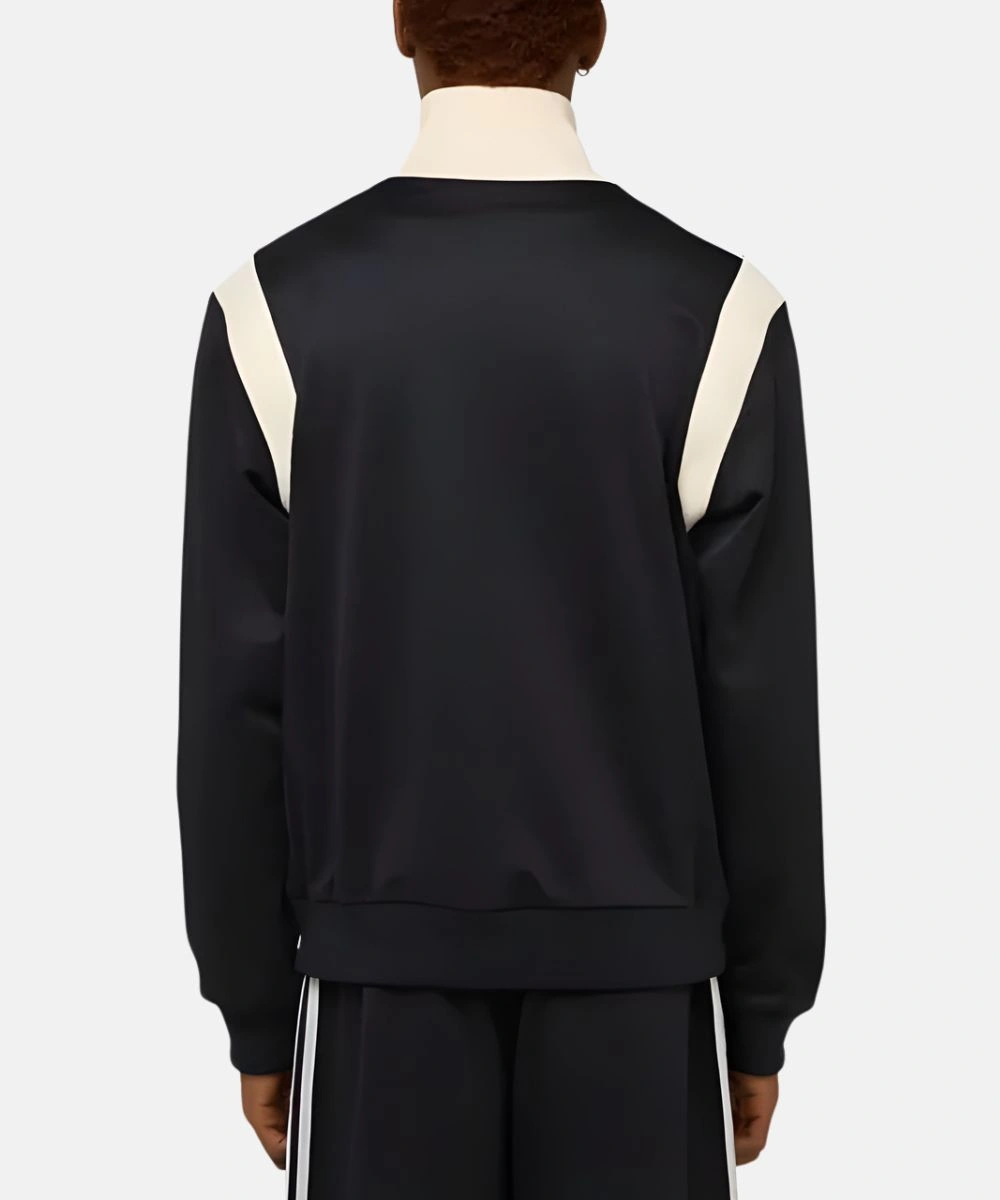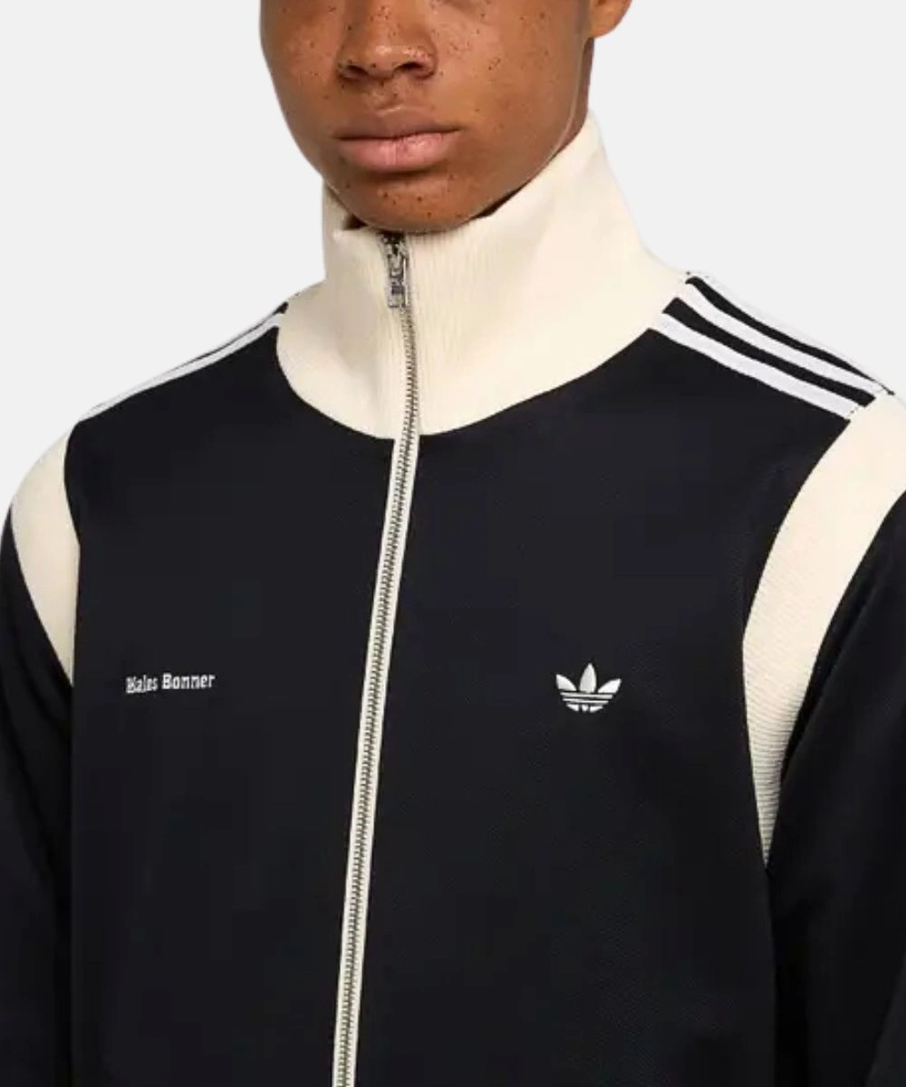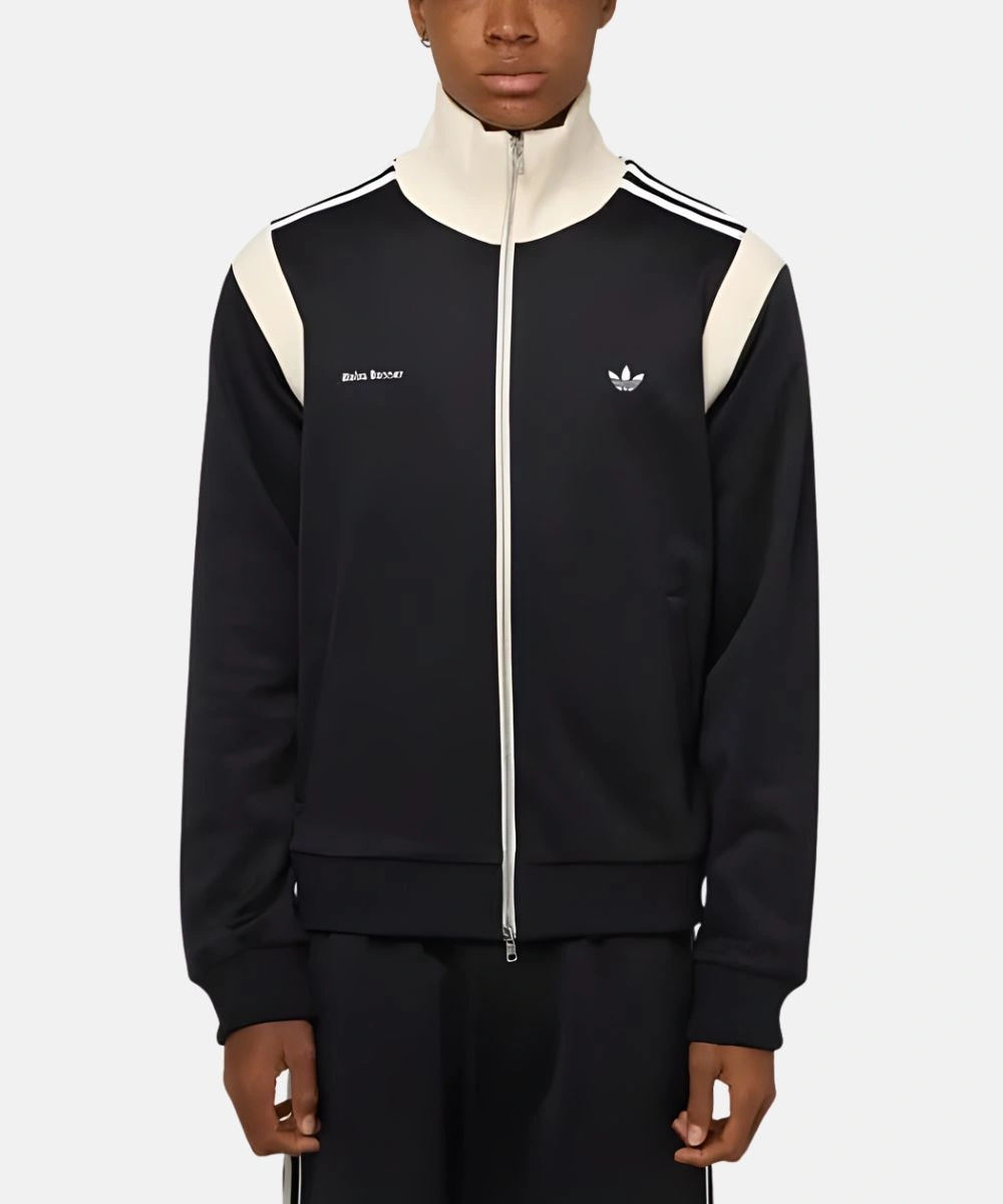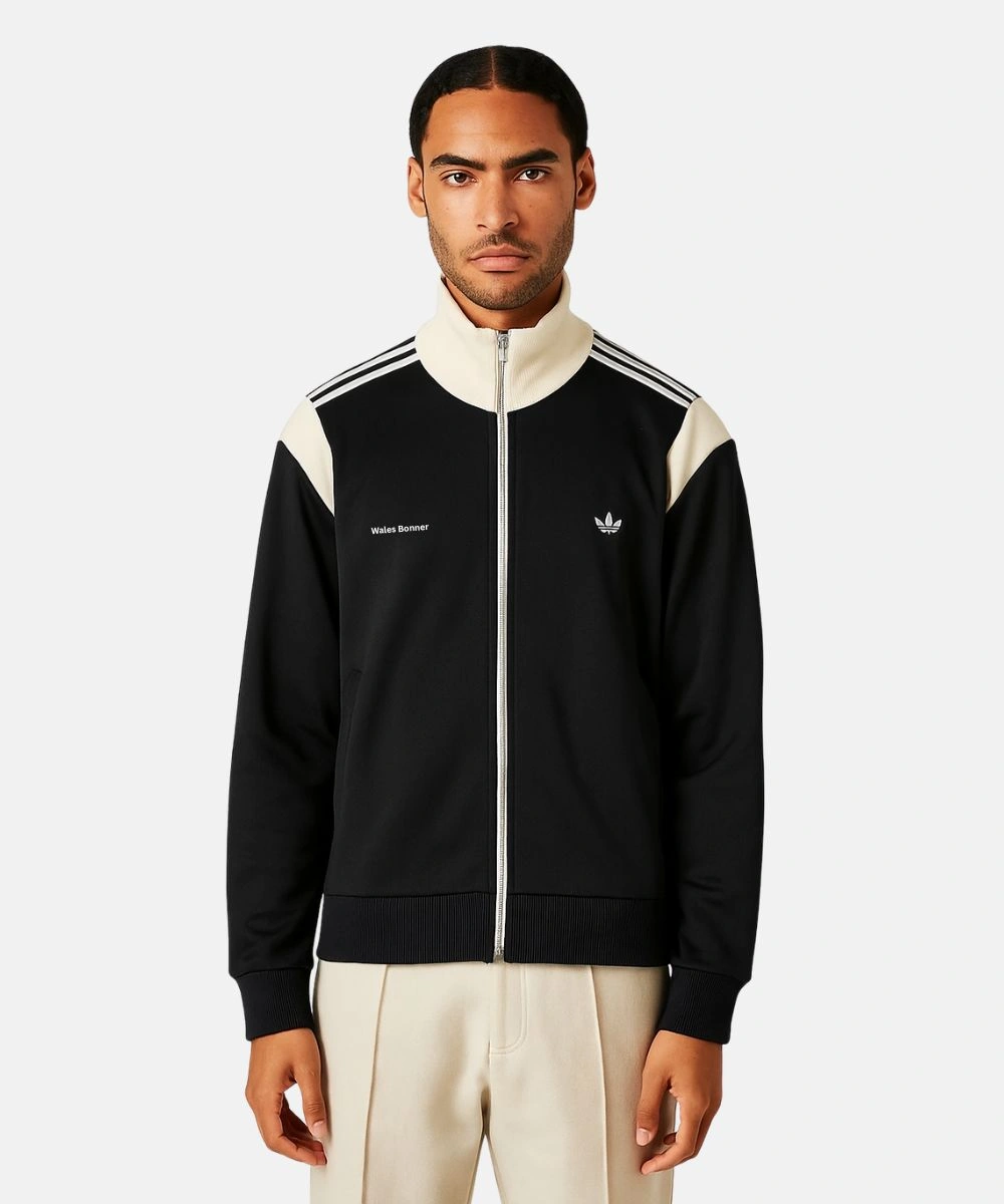 Step into a fresh take on trackwear with this Adidas Wales Bonner track jacket. A fleece built design that adapts to your mood and makes it more than standard sportswear. It has a bold black base with a contrasting ribbed stand-up collar for neck coverage and an athletic look. Raglan sleeves carry the signature stripes for a subtle branding.