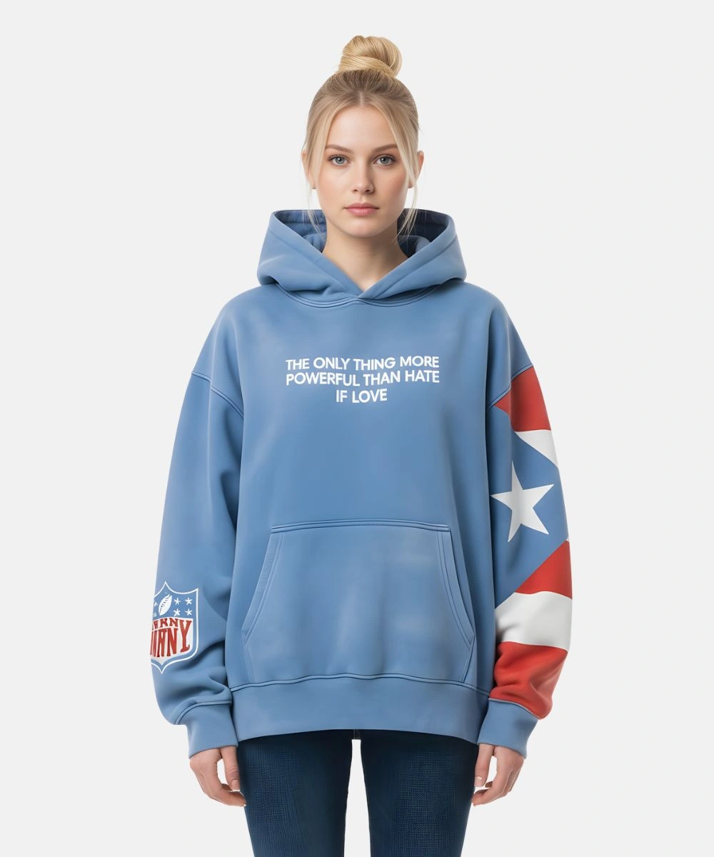 Shop Bad Bunny 2026 Puerto Rico Flag The Only Thing More Powerful Than Hate Is Love Hoodie – Blue