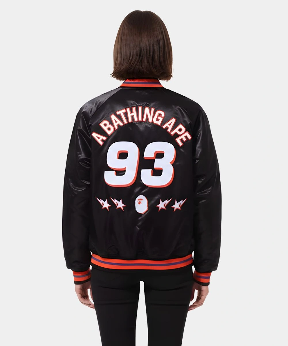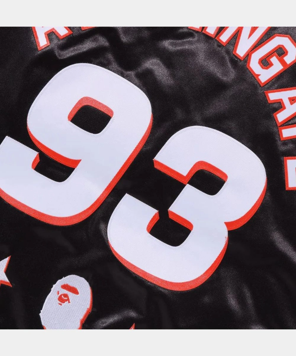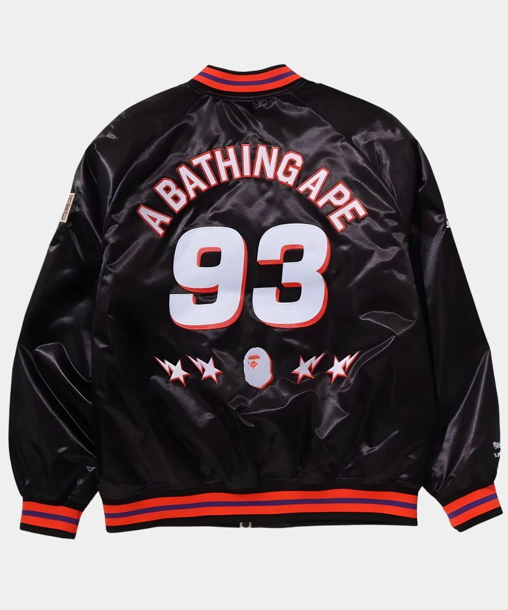 Experience court-ready style that stands out beyond game day in this NBA collab BAPE x M&N Bomber Jacket. The satin built design combines a soft lining that brings together a high fashion grit and soft comfort. The cozy wear is a limited edition design from Bape and M&N, crafted by Taylor Jon. It brings together streetwear swagger and camo aesthetic together in one piece.Â