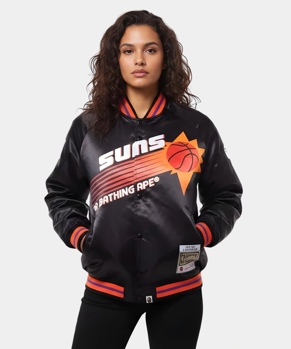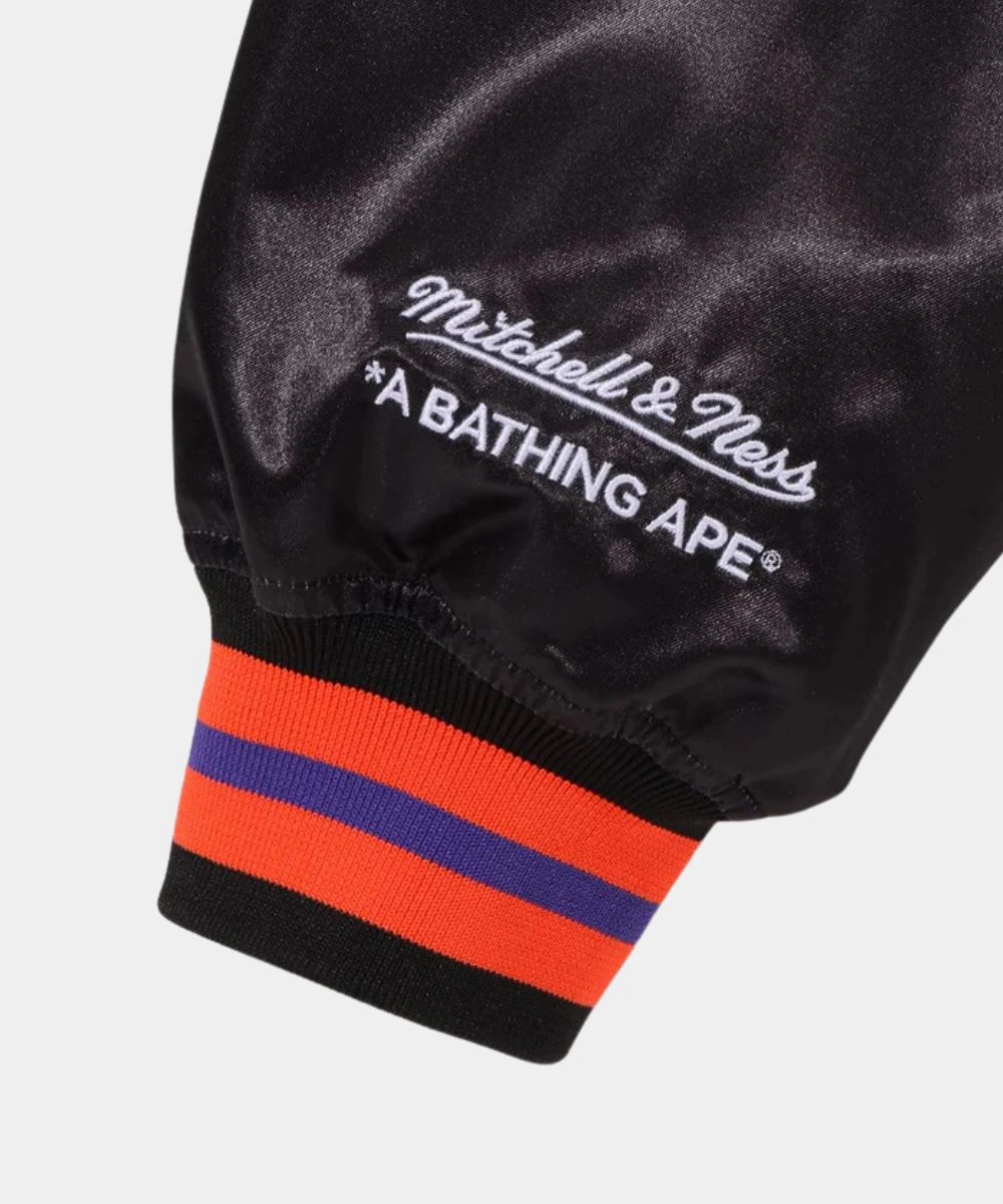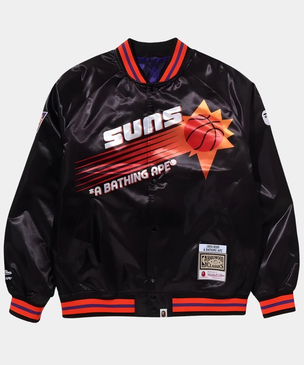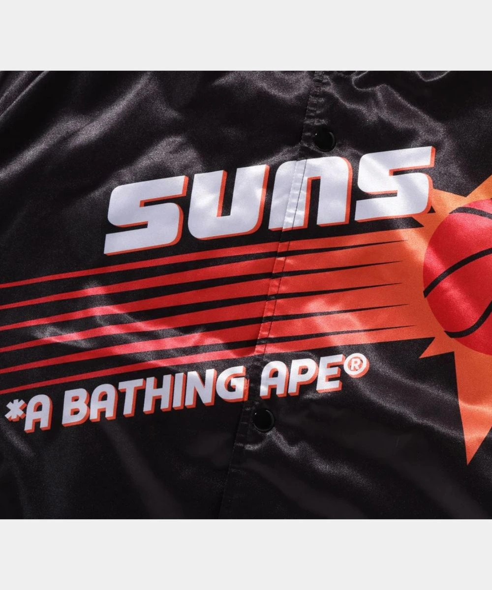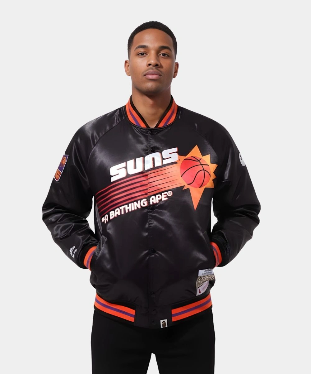 Shop BAPE x M&N NBA 2025 Phoenix Suns Black Satin Bomber Jacket