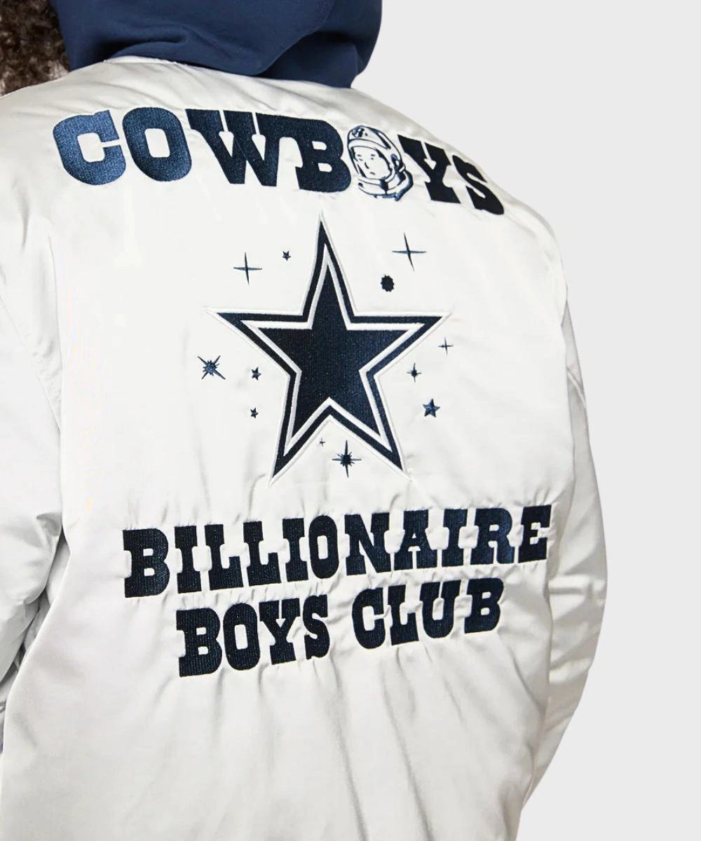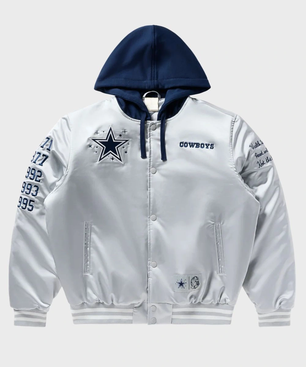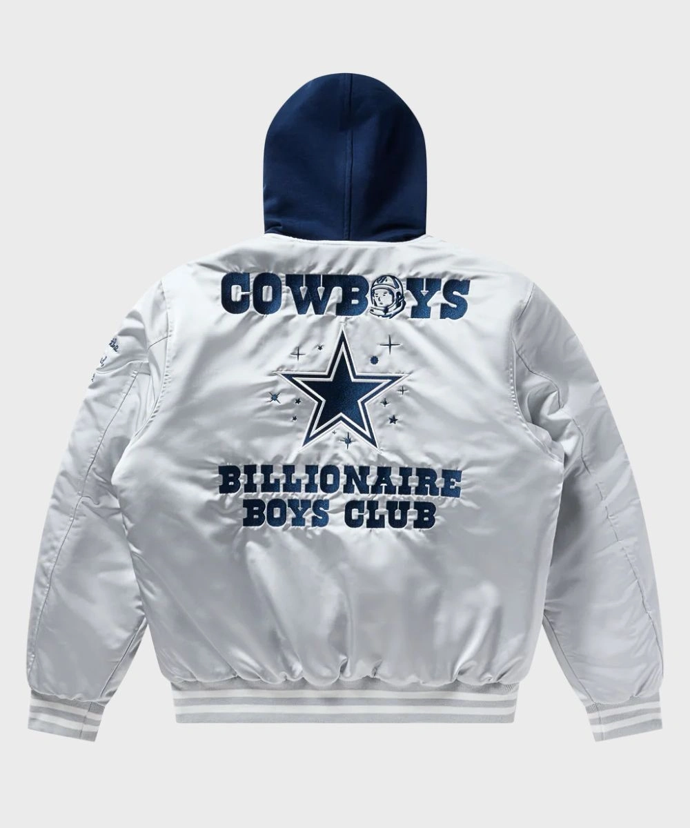 Shop Unisex Billionaire Boys Club x Dallas Cowboys 2025 Hooded Satin Bomber Jacket – Grey & Blue