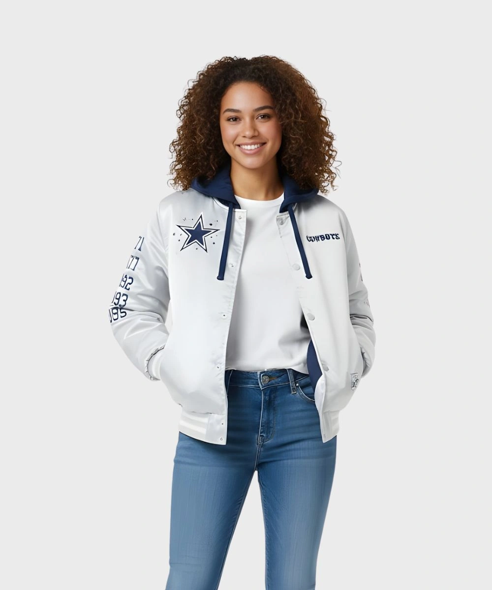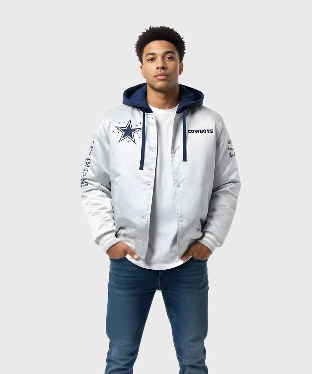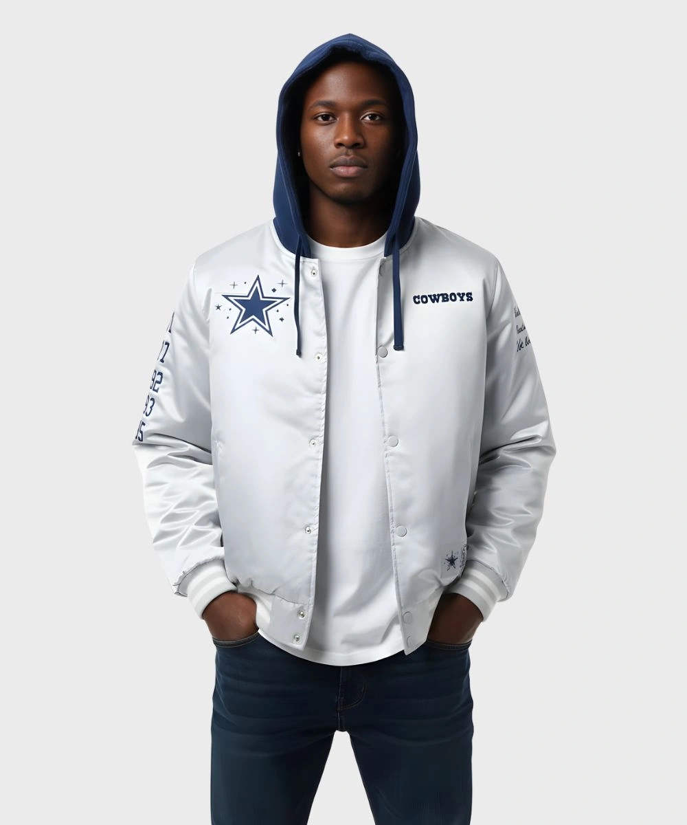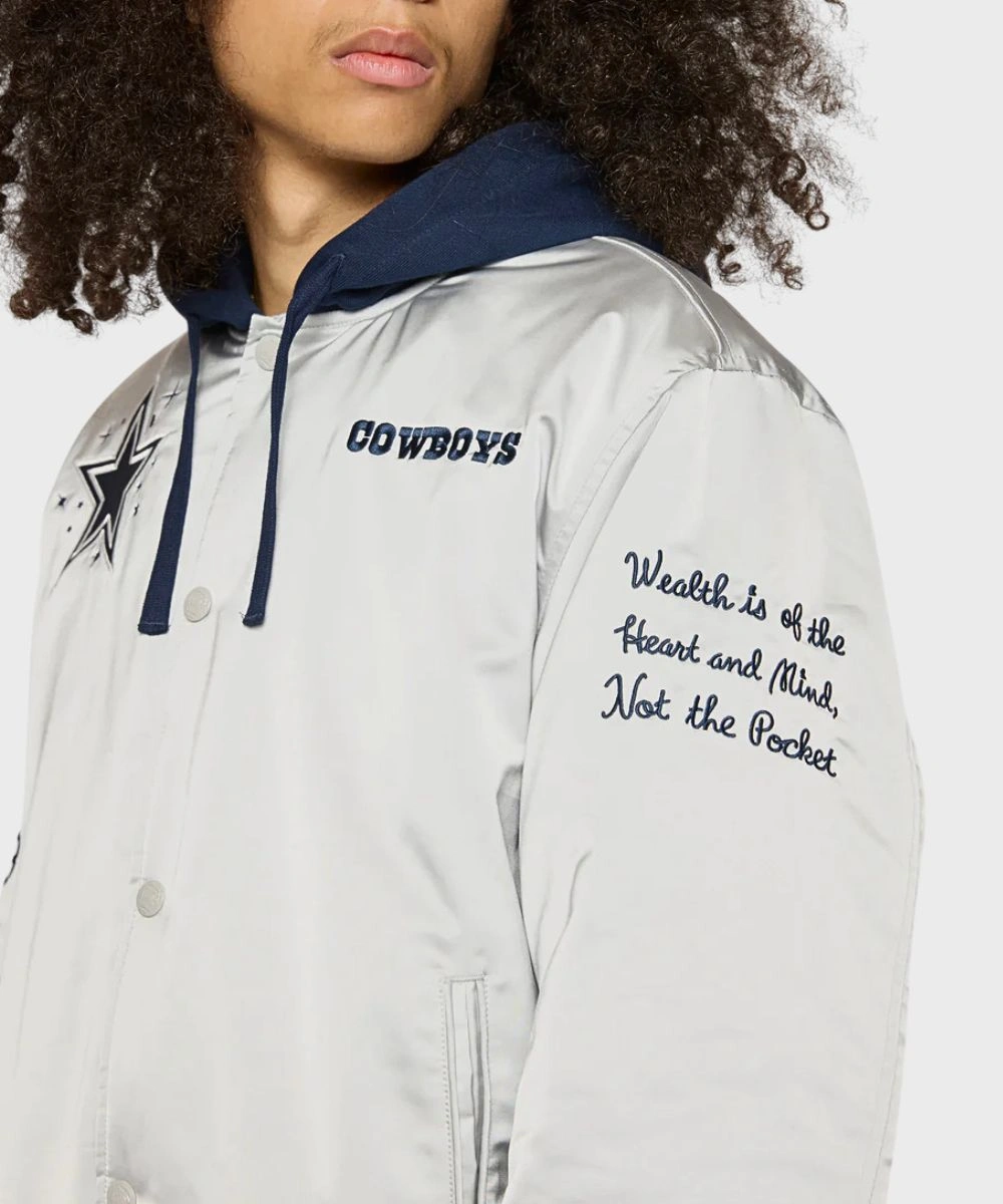 Shop Unisex Billionaire Boys Club x Dallas Cowboys 2025 Hooded Satin Bomber Jacket – Grey & Blue