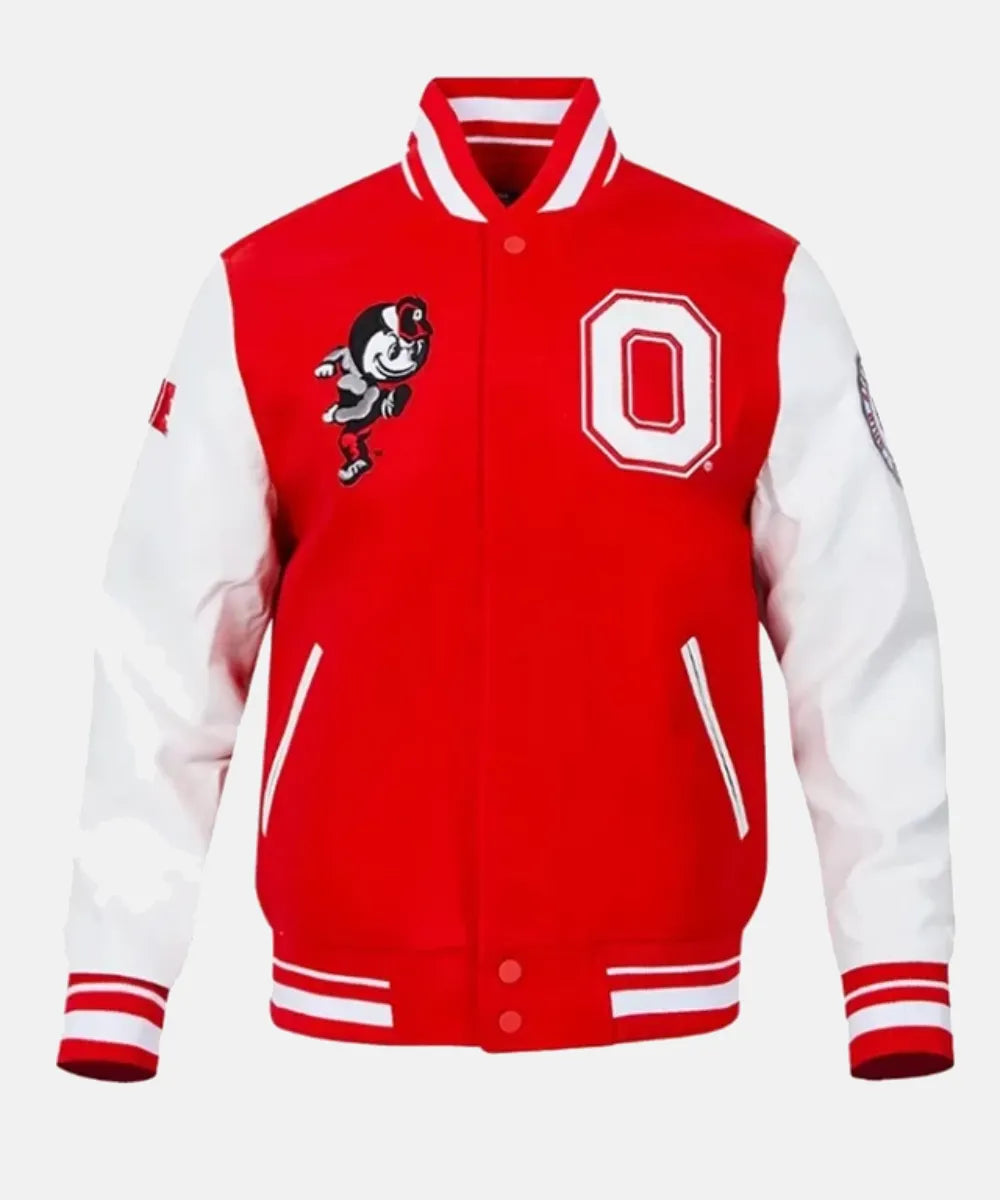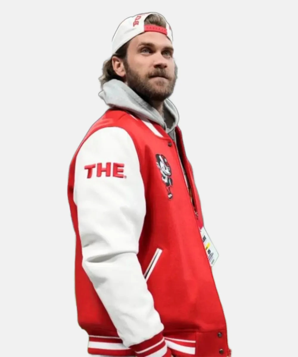 Looking to show off your Buckeye pride with excellence? Then, you need this Bryce Harper Ohio State University Varsity Jacket. The athletic spirit combined with collegiate style is ideal for game days and everyday looks. Crafted with top-tier wool and leather, it ensures style and comfort that turn heads. The rich texture of the leather adds an edge while the smooth texture of wool keeps the body relaxed. It has an inner soft liner of viscose to provide body warmth and comfort during cold match days and winter tide. Bryce Harper Ohio State University Red and White Varsity Jacket With Leather Sleeves has sophistication and contrast that instantly upgrade your fashion and complements different looks. The front features the Ohio state Initial patch and a cartoon patch at the chest that adds a personalized element.