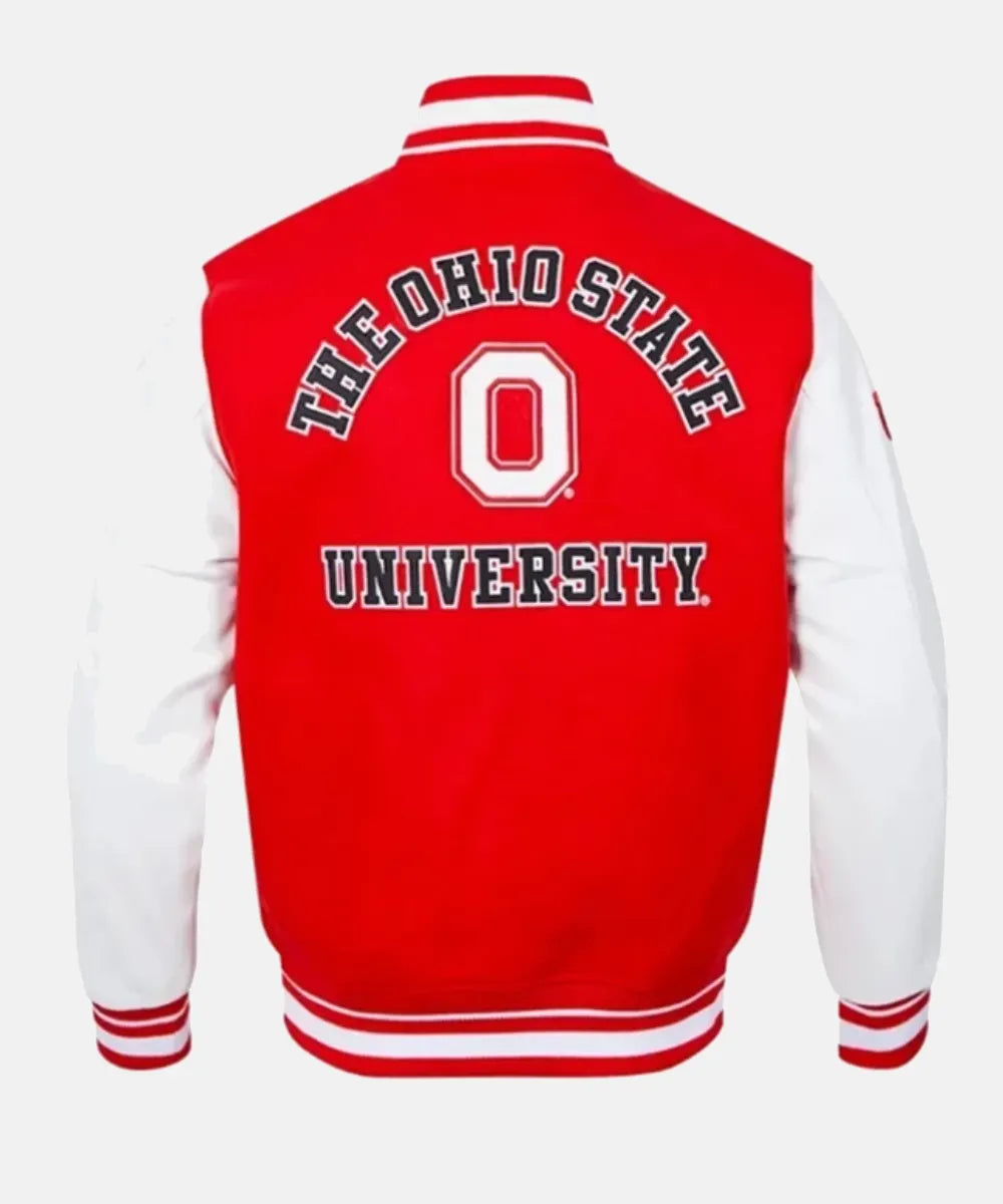 Ohio State University Bryce Harper Red and White Varsity Jacket With Leather Sleeves has a classic rib knit style collar, cuffs and hemline with red striped design. It enhances style and warmth. The jacket features “ The Ohio State University” embroidered patch on the back with an “O” in between. The front has a snap-tab buttoned closure giving a custom fit, while the full-length sleeves carry patches and give a relaxed fit. It allows for easy layering. The varsity jacket also comes with two side welt pockets with white accents around