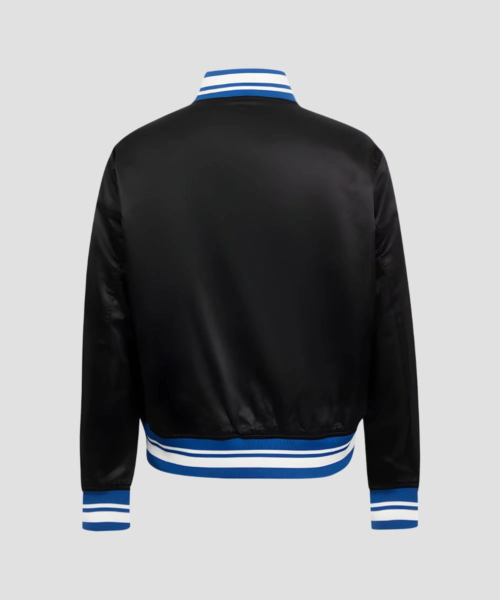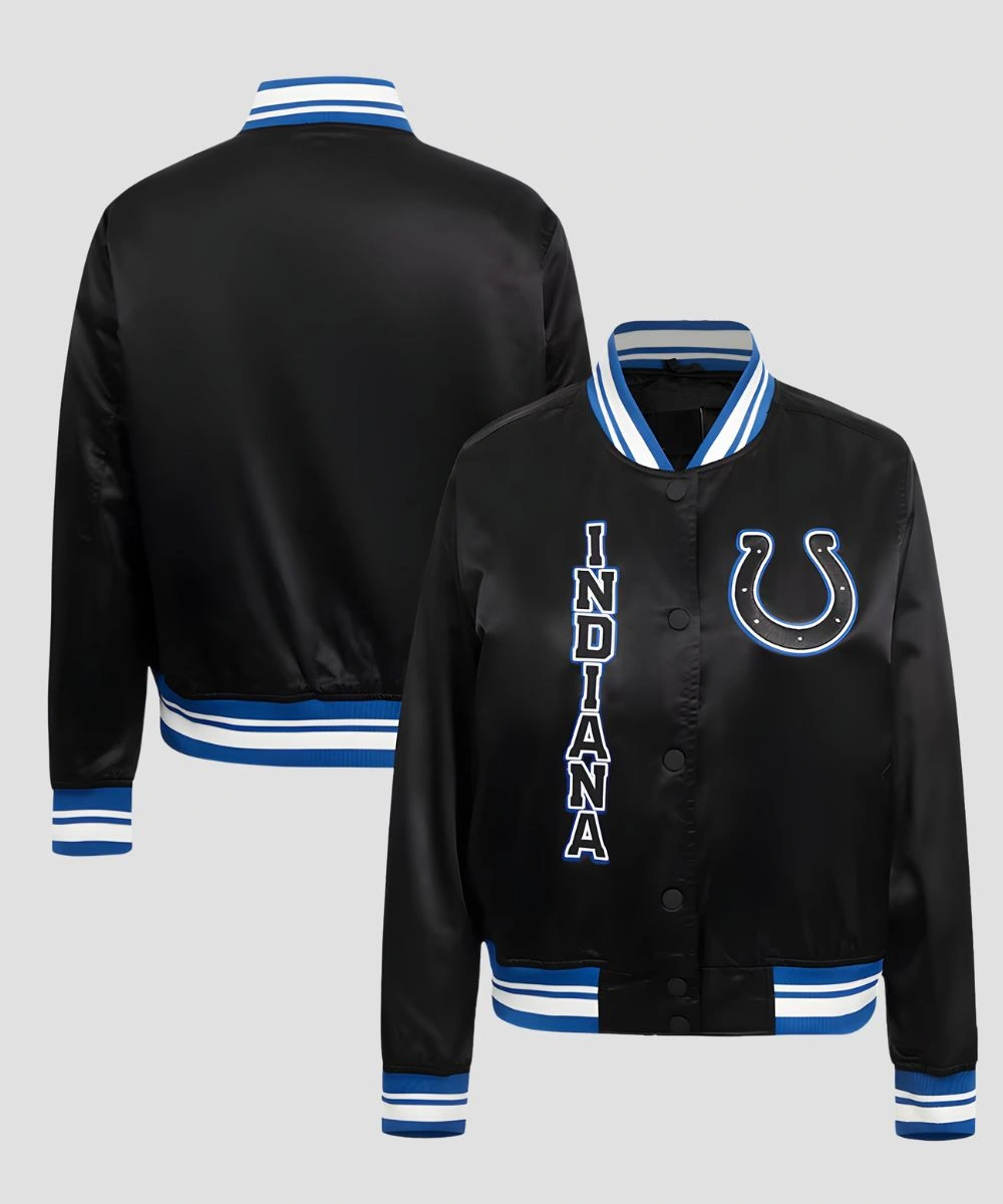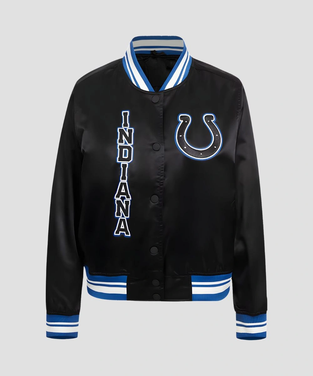 Wear Your Colts Pride Loud and Clear In Timeless Black Satin Energy. This Carlie Irsay-Gordon Indianapolis Colts Black Satin Bomber Jacket is a perfect way to bring pride into your daily wardrobe. Its striking design is built from premium satin that feels soft and offers comfort. Design includes ribbed collar, cuffs and hem to keep classic bomber silhouette and maintain snugness. The front features bold embroidered team-inspired patches to give your style energy and personality. Striped details on the collar enhance the details and athletic spirit.Â