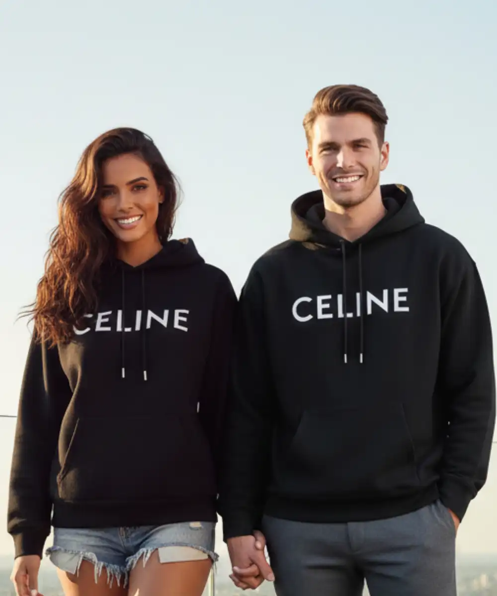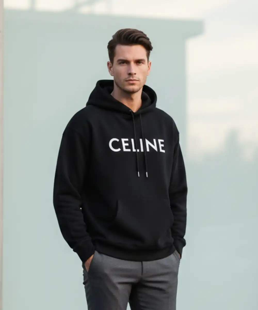 Shop Celine Black Hoodie For Men’s And Women’s, a flawless blend of minimalist design and refined luxury. Designed with a sleek pullover closure that slips on with ease and gives you a timeless appeal. The loose fit maintains structure and warmth with rib knit cuffs and hemline. The cosy hood allows customised coverage and adds a modern streetwear edge. It has kangaroo-style pockets for storage and keeping hands cosy. It is an essential addition to your collection for those who seek luxury and functionality.