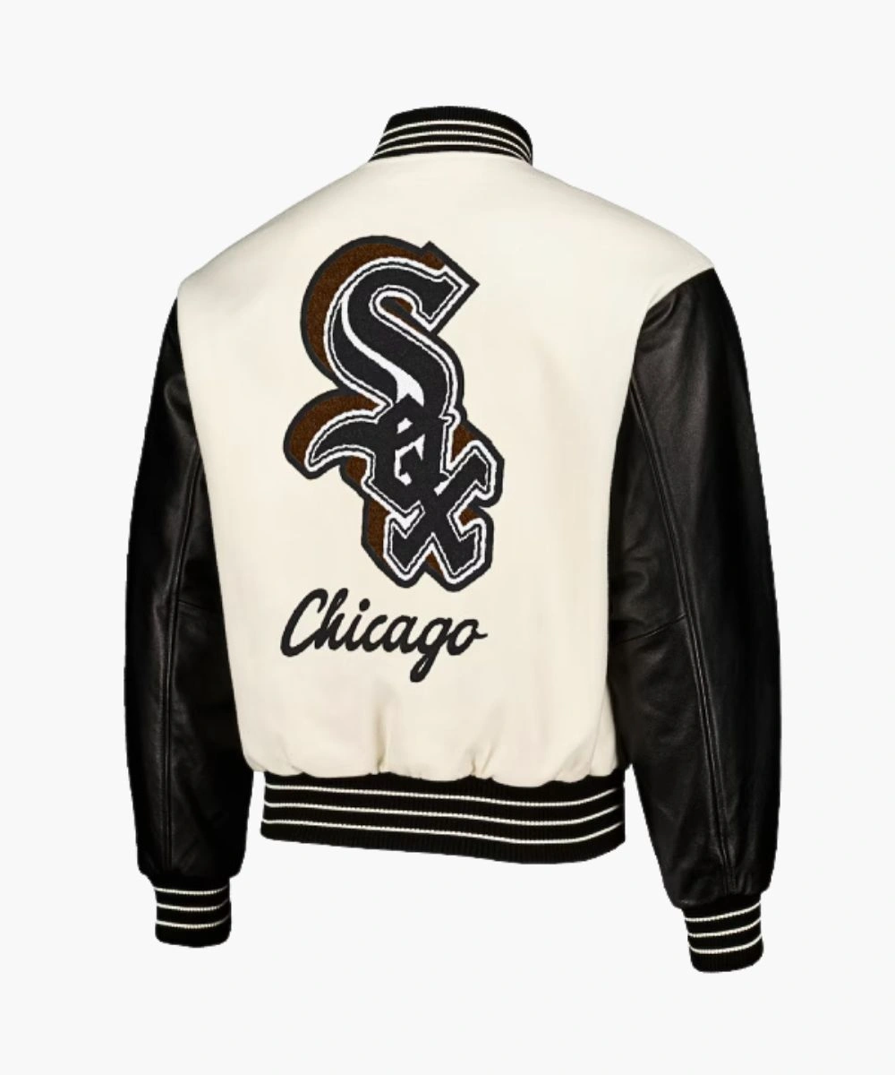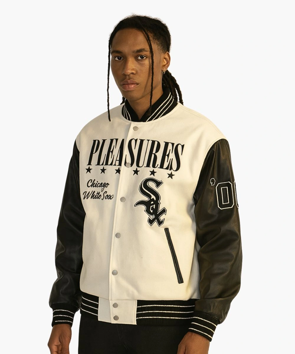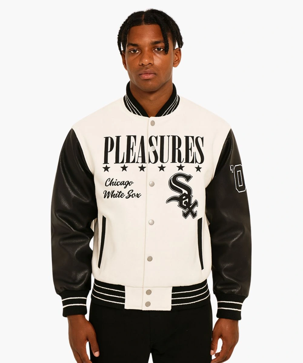 Shop Chicago White Sox PLEASURES Full-Snap Bomber Varsity Jacket – White And Black – RECREATION