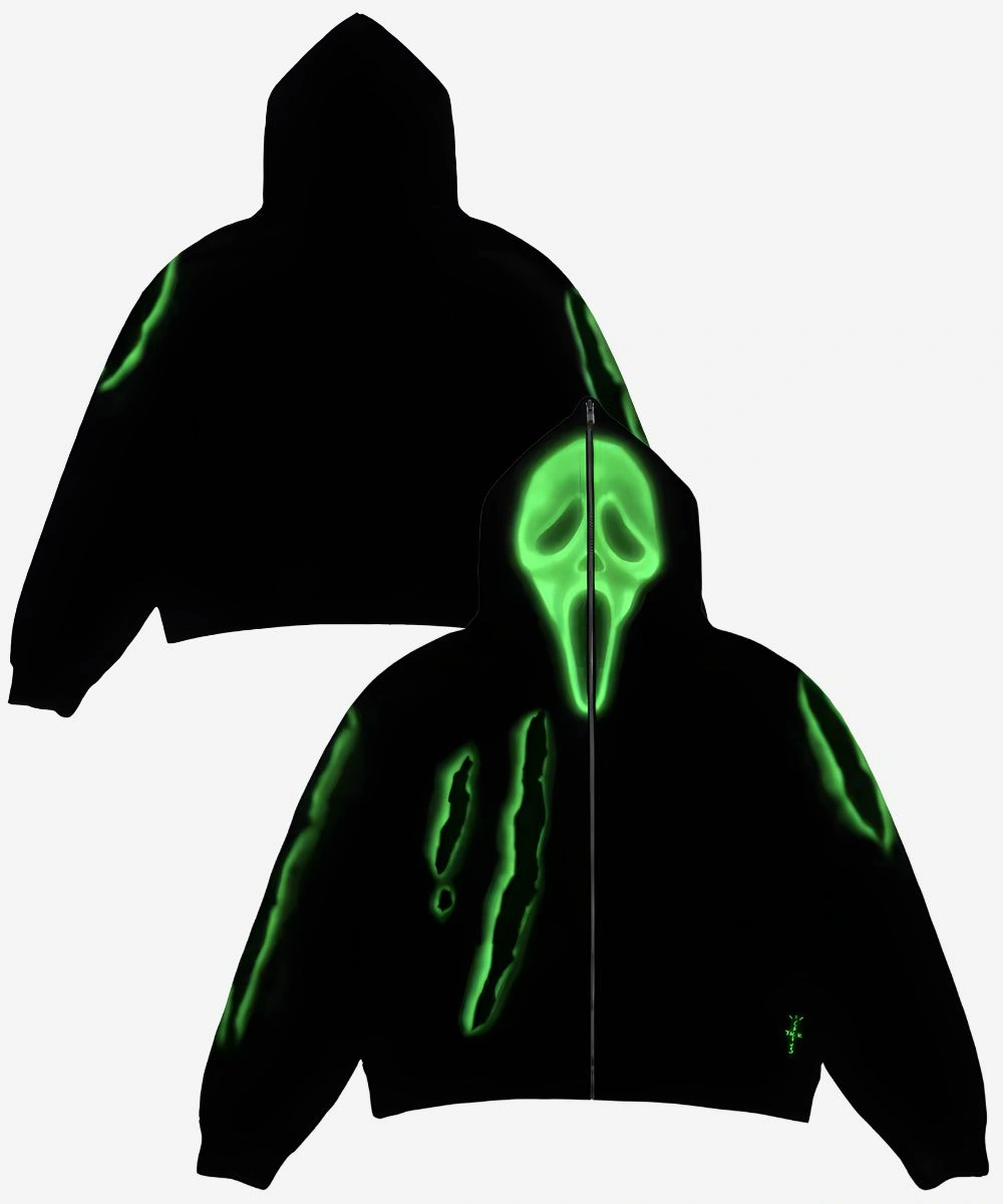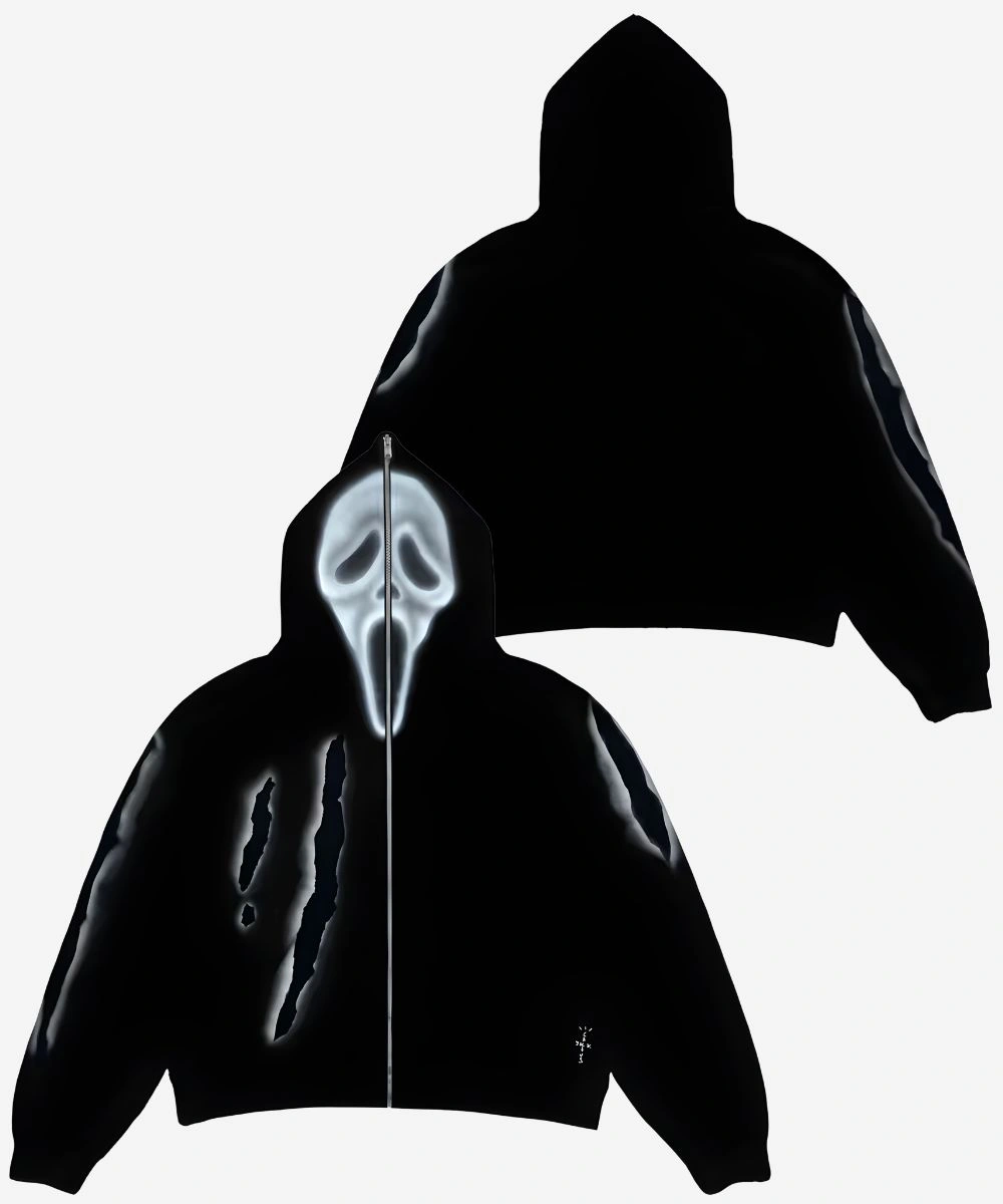 Step into the dark and experimental world of psych rock rap in this Don Toliver x Scream x CJ Slasher Hoodie. This piece blends horror film aesthetics and Cactus Jack grit that makes a bold impression. The construction focuses on a heavy-duty fleece material that provides substantial insulation and a soft yet street-ready drape. Its deep black fleece serves as a high contrast canvas for the vibrant ghost face screen printed that appears to “slash” across the torso and sleeves.