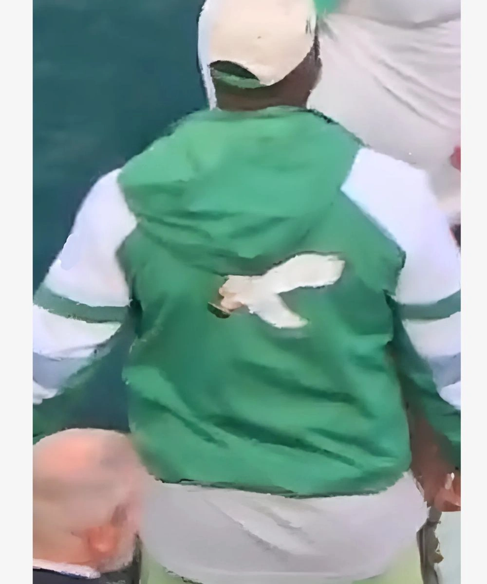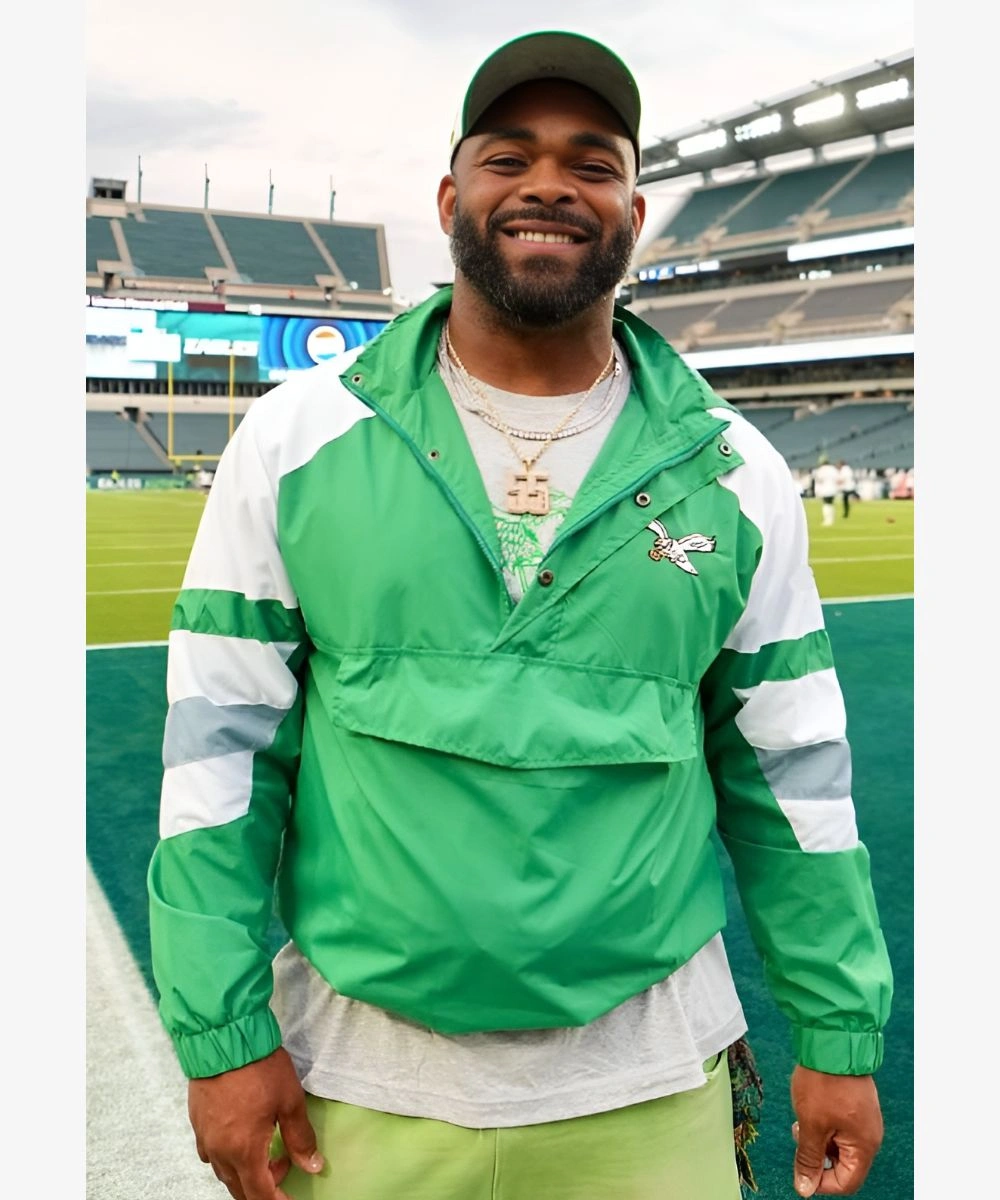 Bring Super Bowl swagger and street-ready style to your everyday look in the Brandon Graham Eagles Varsity Jacket. Designed with a durable polyester in a green and white palette, it blends team spirit and refined simplicity. The front showcases a subtle Eagles patch for a team-spirited aesthetic. The Brandon Graham Eagles Jacket – Green And White features a half zip closure with a sleek stand-up collar and snap buttons in a storm flap design. It gives a clean look and allows for easy styling versatility. This Eagles jacket is perfect for those who like modernity mixed with tradition.Â