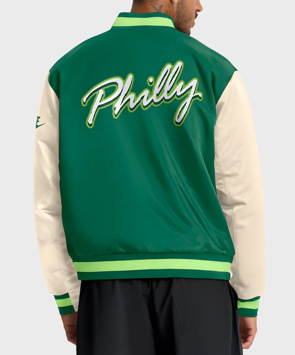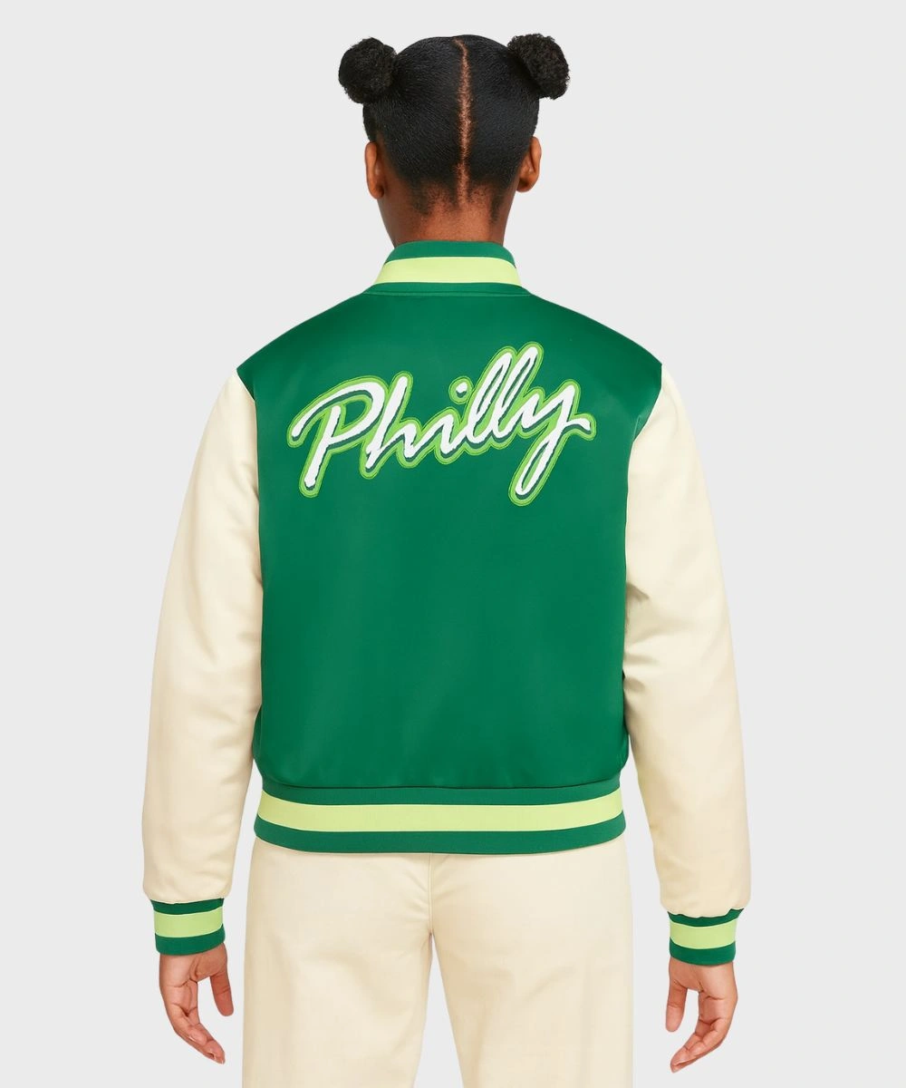 Step up your fan wear game with classic style and vintage-inspired confidence in the Eagles Nike Rewind Legacy Bomber Jacket. It is made of satin fabric for a cosy feel and a bomber silhouette that gives a sporty energy. This jacket has a two-tone design in team colors for a standout blend of heritage and style. It has a ribbed collar and a front buttoned closure to give you a secure fit and easy layering. You can style the Unisex Philadelphia Eagles Nike Rewind Legacy Full-Snap Bomber Jacket – Green And Cream for game days to casual nights, or a true swagger style. It works for every style and mood and unlocks effortless wearability.