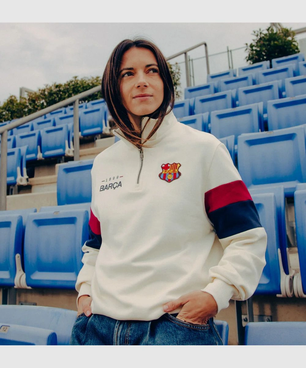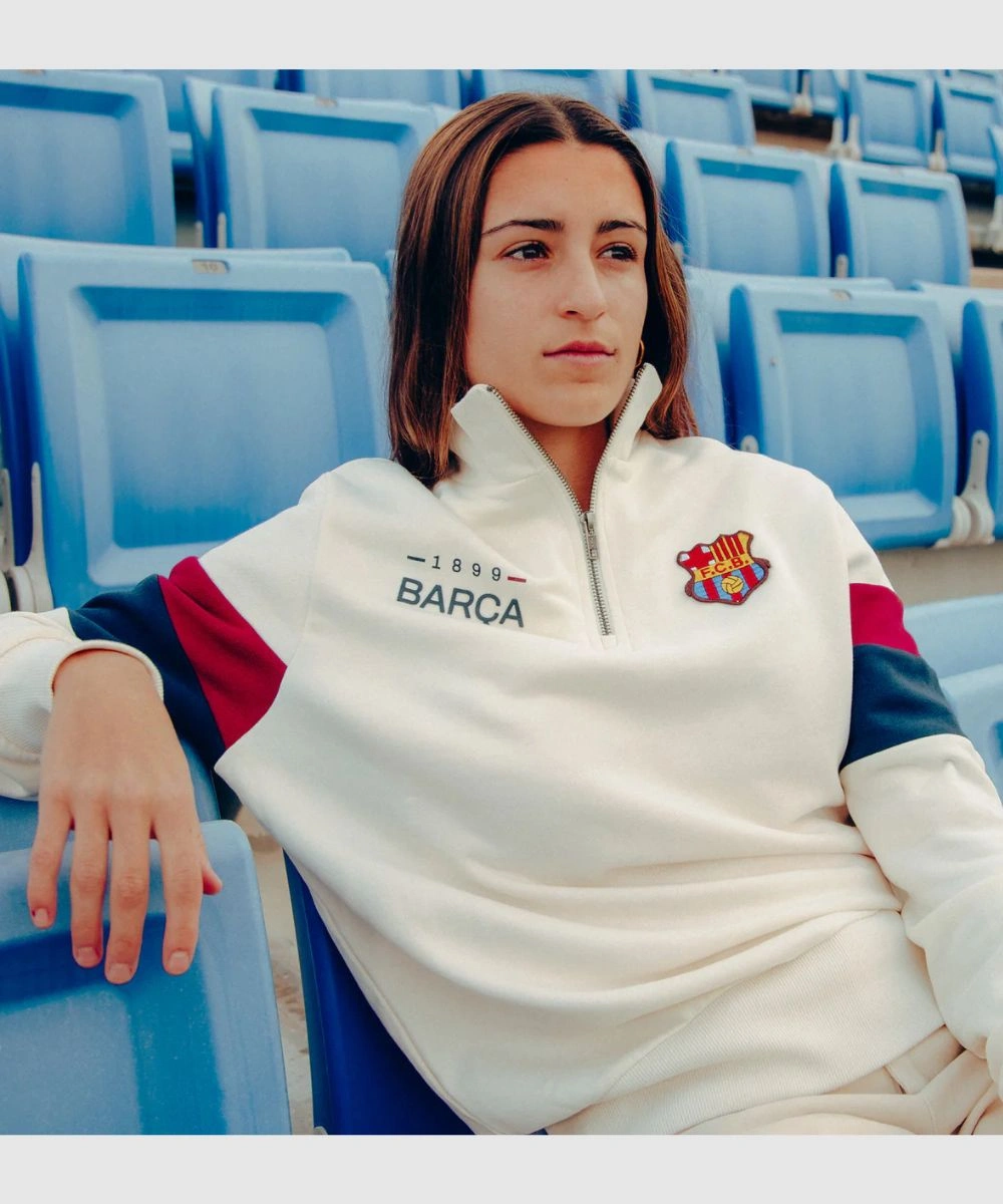 The FC Barcelona Retro 1899 Half Zip White Sweatshirt – Unisex is a perfect ready-to-wear statement. It gives a simplistic and clean, professional finish to every outfit. The upper chest carries the Barcelona 1899 and FC Club badge. It can be worn zipped up for structure and slightly open for a laid-back style.