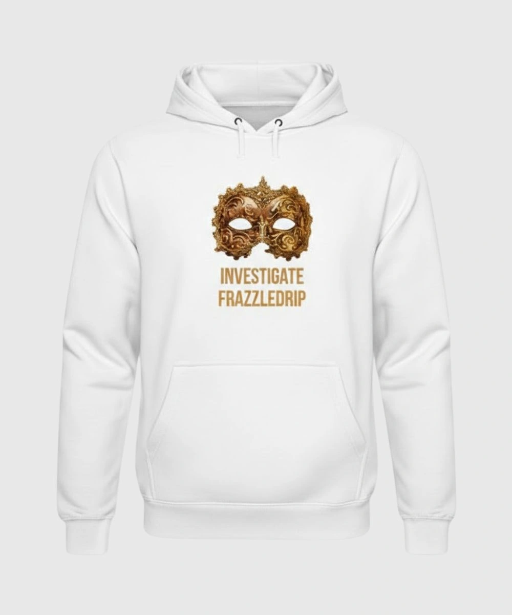 The design stands out beautifully on both the black and white versions and enhances the rich mask graphic in its own bold way. The clean backdrop allows the intricate detailing and striking “Investigate Frazzledrip” text to command attention instantly. It showcases a classic pullover with a casual fit that provides all-day comfort. The spacious hooded collar offers an adjustable layer of additional warmth.