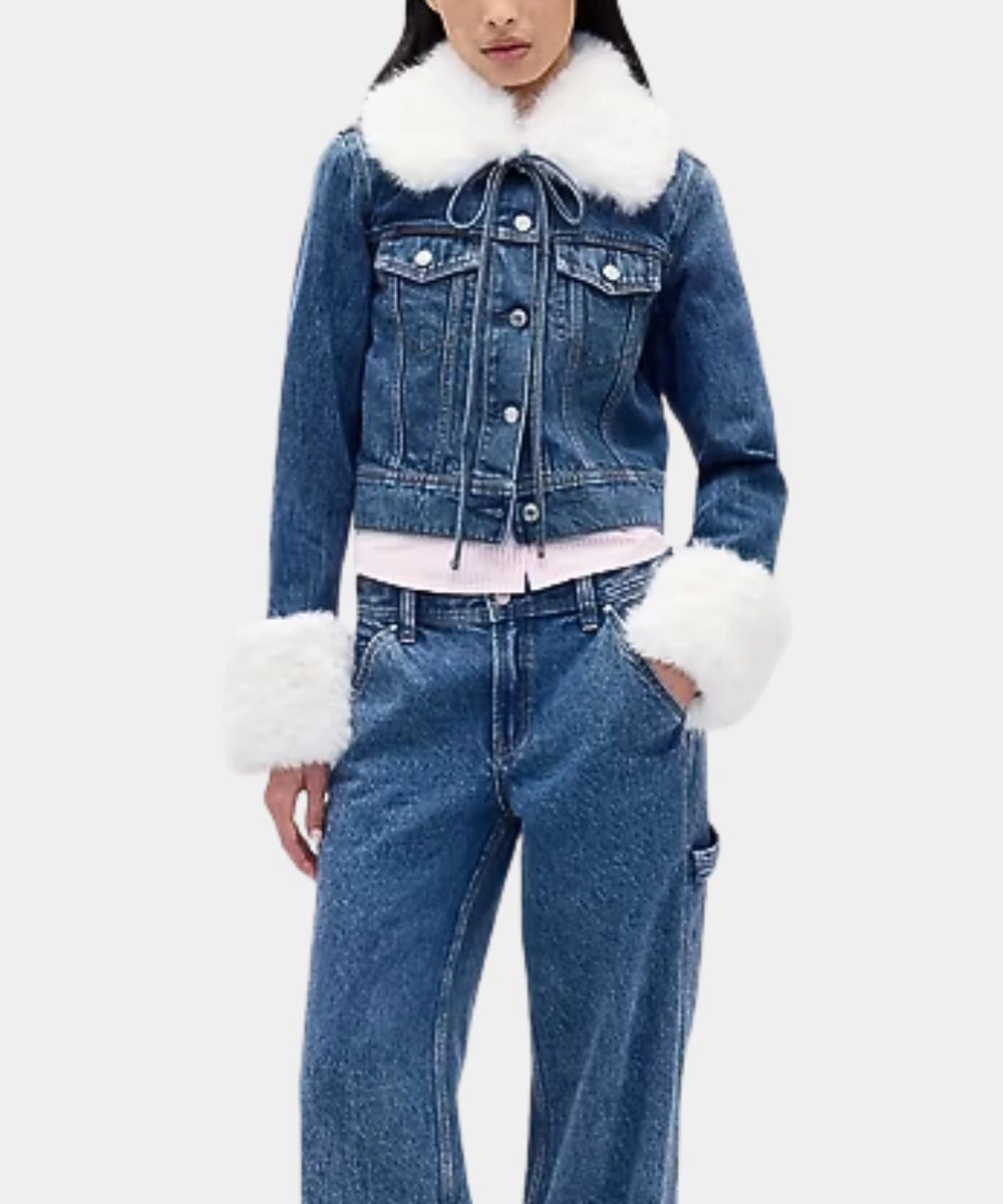 Shop Gap x Sandy Liang Vegan Fur Cropped Denim Jacket For Women’s and make a statement with effortless cool and a cozy twist. It features a belt closure and drawcords on the collar for additional flair and customization. It features fur round cuffs for extra warmth and a more luxurious vibe as well as two buttoned flap pockets for storage.