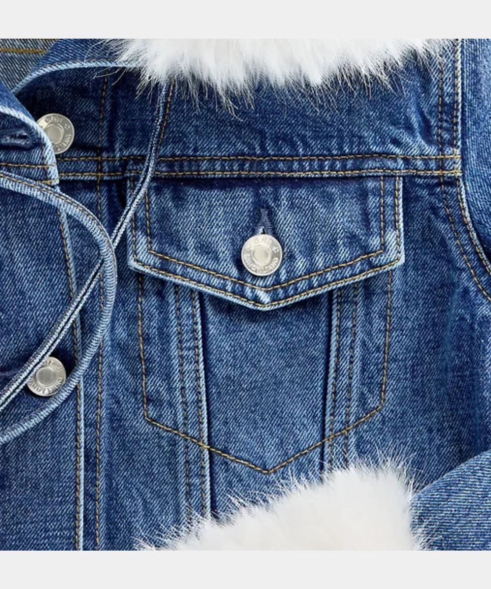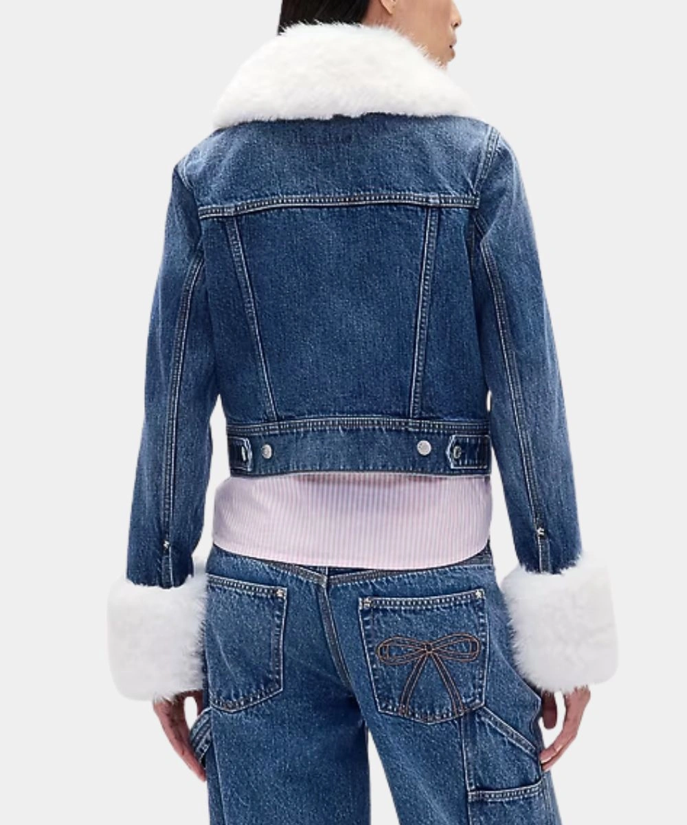 The GAP × Sandy Liang Vegan Fur Crop Denim Jacket blends classic denim charm with a touch of soft luxury. Crafted with a cropped fit for a flattering style and fur details that add warmth and texture. It has soft denim with mid-blue wash that fits seamlessly into existing wardrobes. Viscose inside adds a smooth layer of warmth to the style. The Gap x Sandy Liang Vegan Fur Cropped Denim Jacket For Women’s features a classic button front closure for easy wear and effortless layering. It adds structure and a vintage charm to every ensemble. The oversized fur collar gently hugs you and instantly elevates your style. Its soft texture feels cozy and adds warmth on chilly days.