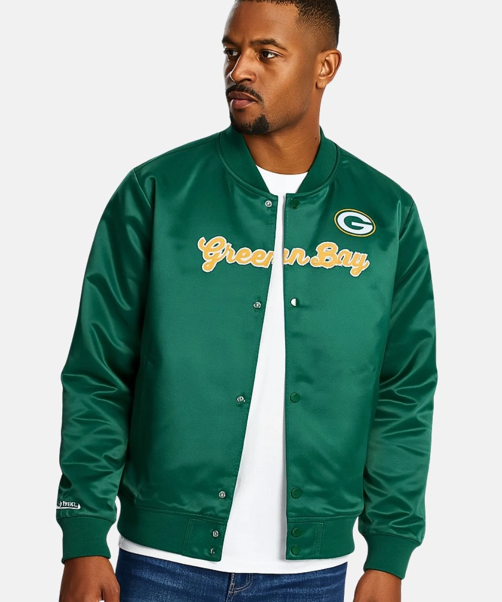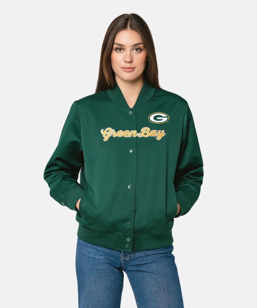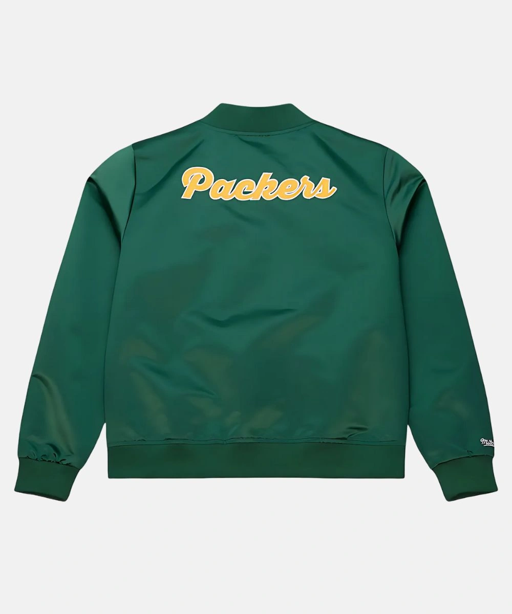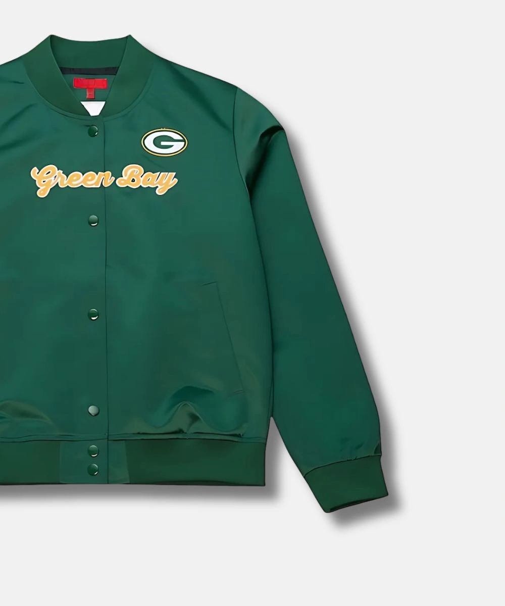 The Green Bay Packers Vintage Satin Full-Snap Jacket is your ultimate cold-weather upgrade, blending team pride with unmatched comfort. The jacket shines with its premium satin exterior and classic Packers green base. It has a soft viscose interior that balances lightweight warmth with all day comfort. The jacket features a bold gold Green Bay Packers team patch across the chest. Mitchell & Ness Green Bay Packers Vintage Green Full-Snap Satin Jacket For Women’s features a classic rib knit collar that stays snug around the neck. Front snap buttons add a retro touch and allow easy and secure closure.Â