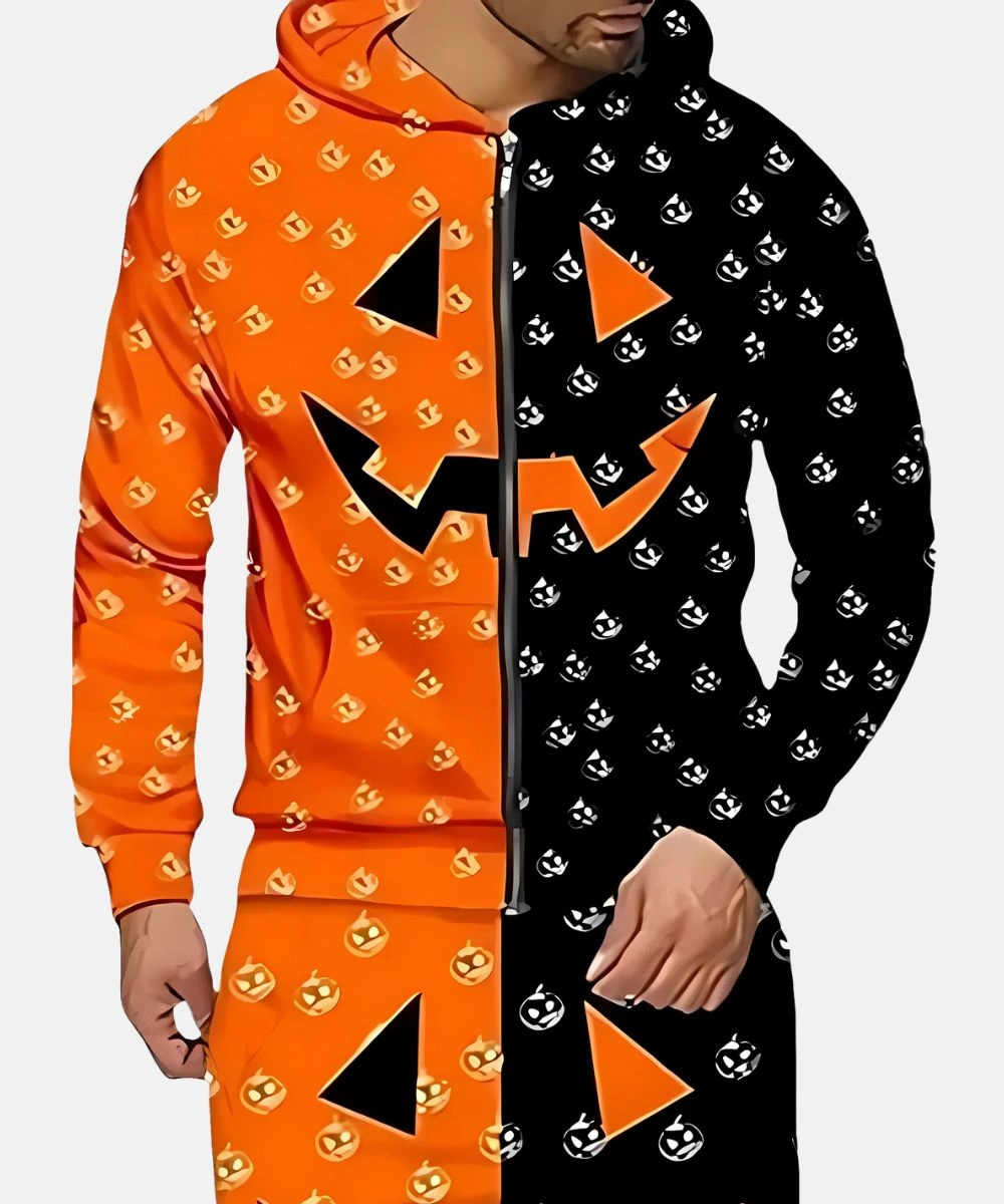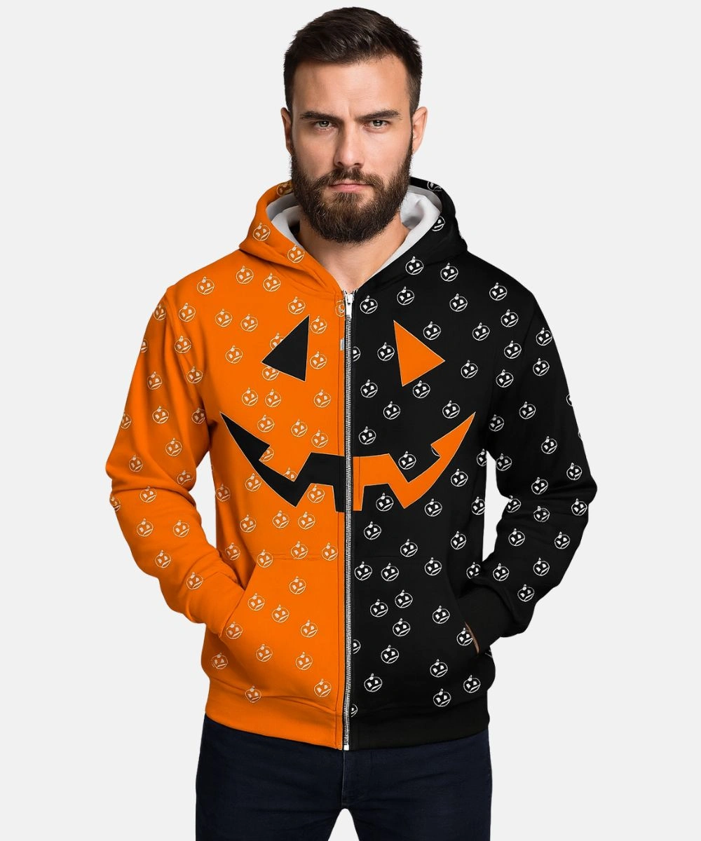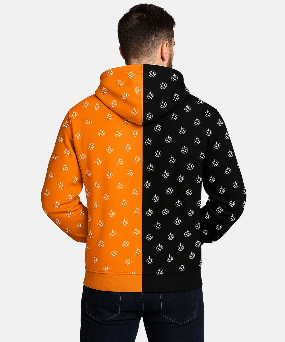 Step into the spooky season in style with the Halloween Orange & Black Pumpkin Hoodie. This hoodie is a blend of modern twist with a classic traditional jack o’ lantern vibe to add a festive touch to your look. Premium fleece is tailored with a two tone look and playful pumpkin graphics that create a striking contrast. Its bold color scheme and cosy design make it a must have for Halloween enthusiasts. The Unisex Halloween Pumpkin Hoodie – Orange And Black features a front zipper and an attached hood. It allows you to pair with multiple fits and prevents cold from sneaking in.
