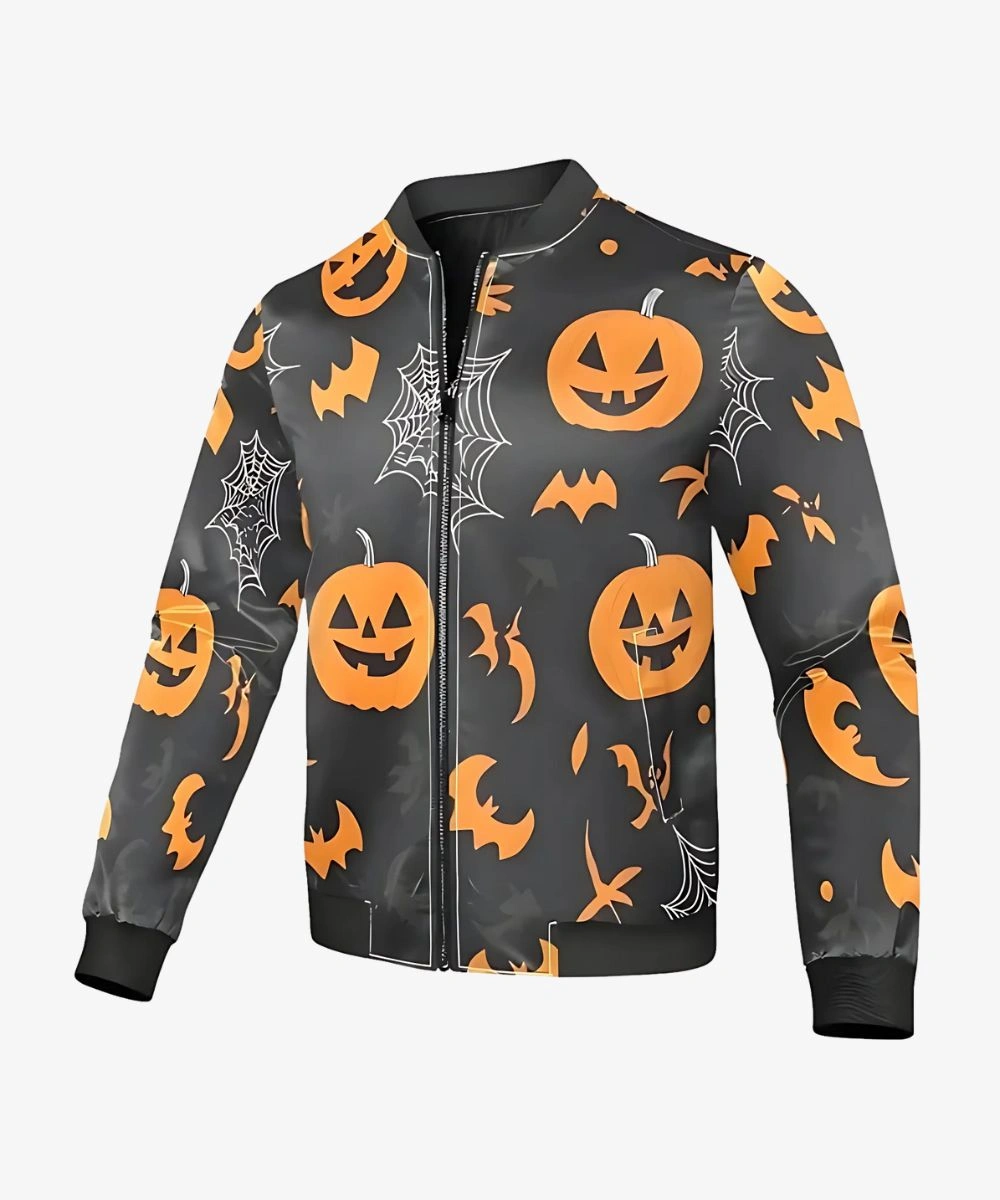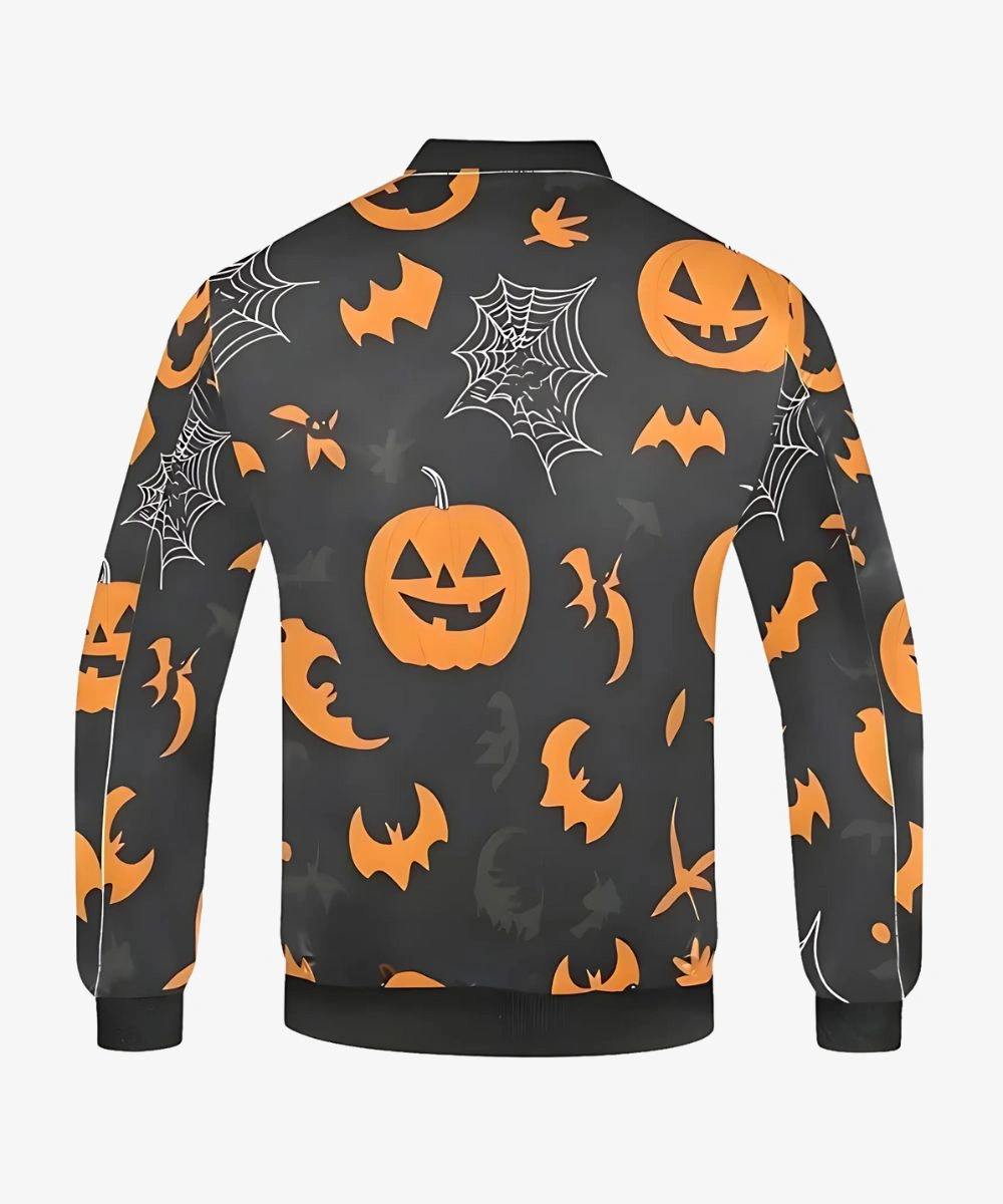 Embrace the festive spirit in style with the exclusive Halloween Pumpkin Black Bomber Jacket. It has a timeless bomber cut and a striking pumpkin pattern to maintain an eerie appearance effortlessly. Premium polyester and soft viscose lining keep you comfortable and warm all season. This bomber jacket design includes a rib knit collar for a sleek yet structured appearance. Front full zip closure ensures a modern look and provides you a secure fit.