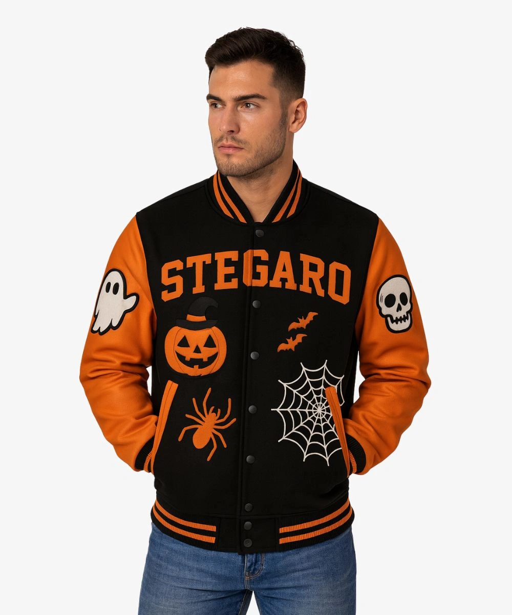 The soft viscose lining inside provides breathability, insulation and a luxurious feel. The jacket has rib trims and a black wool body with leather sleeves that contrast. Front button fasteners make styling quick and versatile. It has a ghost and skull on the sleeves, while the back showcases an oversized pumpkin face and a Halloween text patch. Shop Halloween Pumpkin Varsity Bomber Jacket – Black And Orange for seasonal statement and spooky energy in one standout piece. It has roomy welt pockets designed for carrying daily essentials safely.