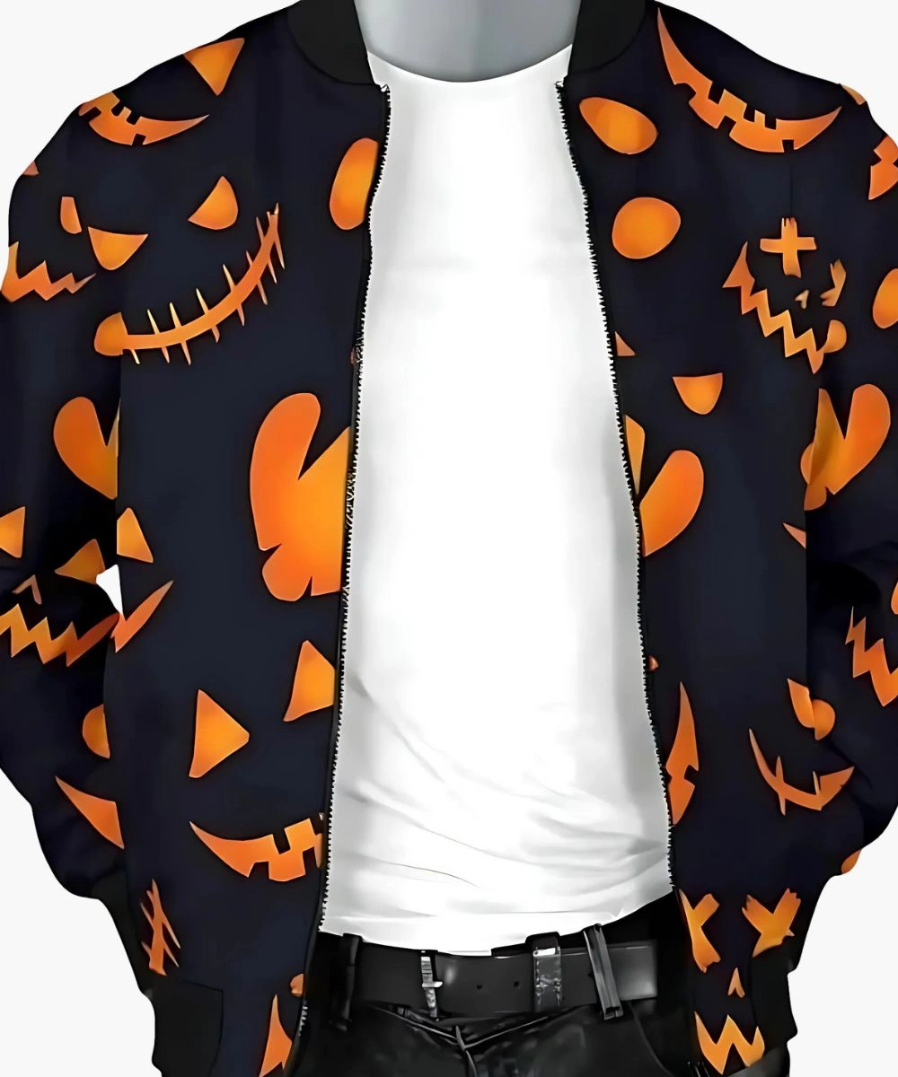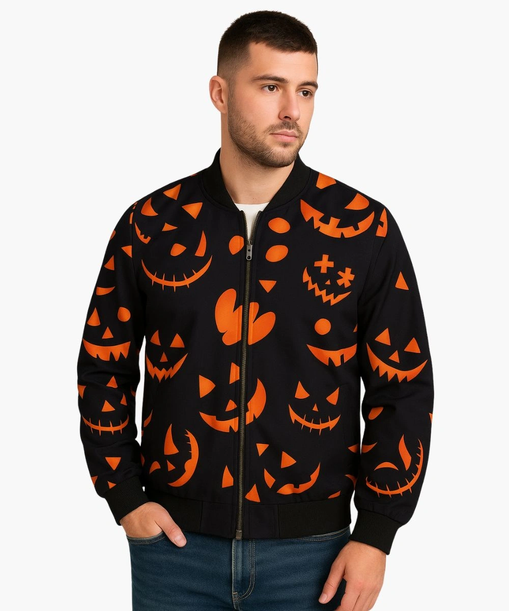 Light up the night with pumpkin power in classic streetwear style. The Halloween Pumpkin Bomber Jacket is a statement piece that gives your spooky look a glow-up. It is constructed from black satin fabric and bright orange pumpkin motifs for a dramatic yet eye-catching look. Its glossy finish and bright contrast enhance everyday wearability and make a lasting impact. The soft lining inside adds a smooth feel and keeps you comfortable all day.