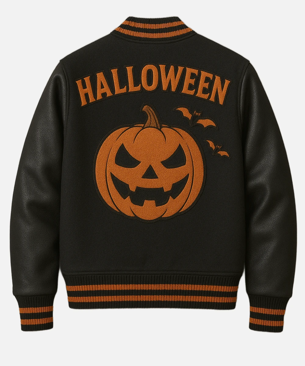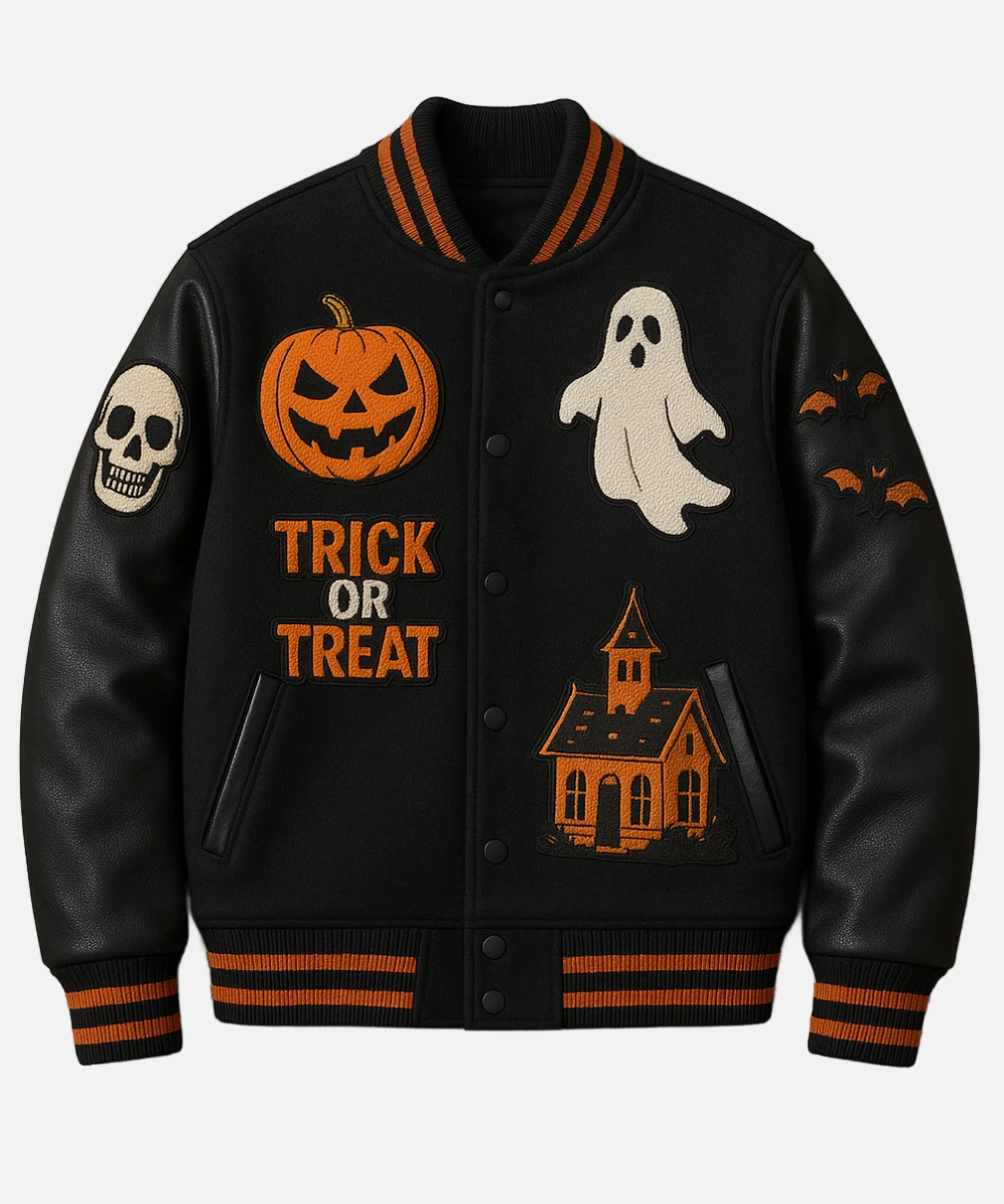 Command the night with a premium edge in this Halloween Wool and Leather Black Jacket. It has a spooky design constructed from wool and leather for that perfect festive look and comfort together. The timeless fusion and bold colorways set the stage and make a statement everywhere you go. It has a black backdrop featuring various eerie motifs at the front for a complete Halloween vibe. It includes a ghost, a pumpkin and a haunted house, complemented with a Trick or Treat patch. The Halloween Wool & Leather Black Bomber Jacket works well as a transitional piece between seasons. Its plush lining delivers comfort and warmth in cool evenings or brisk air.