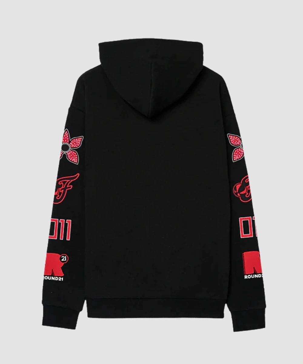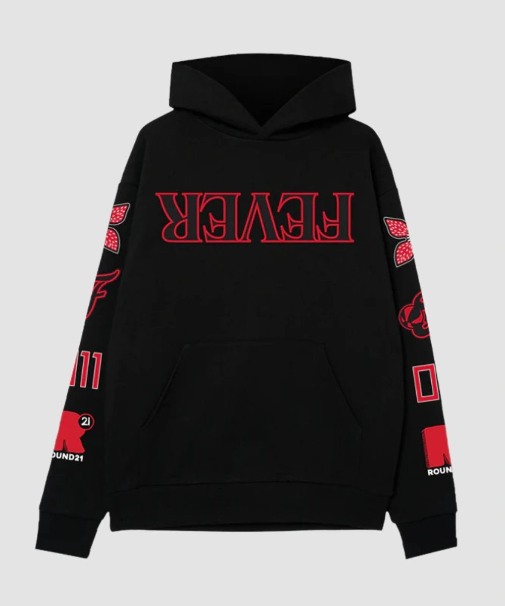 Shop Unisex Indiana Fever WNBA x Round21 Stranger Things Parallel Pullover Fleece Hoodie in Black for a fresh twist on fandom expression. The oversized fit features a pullover style to create a clean, uninterrupted look. It provides warmth around the neck, while the integrated hood offers protection from cold breeze making it a seamless part of the jacket.Â