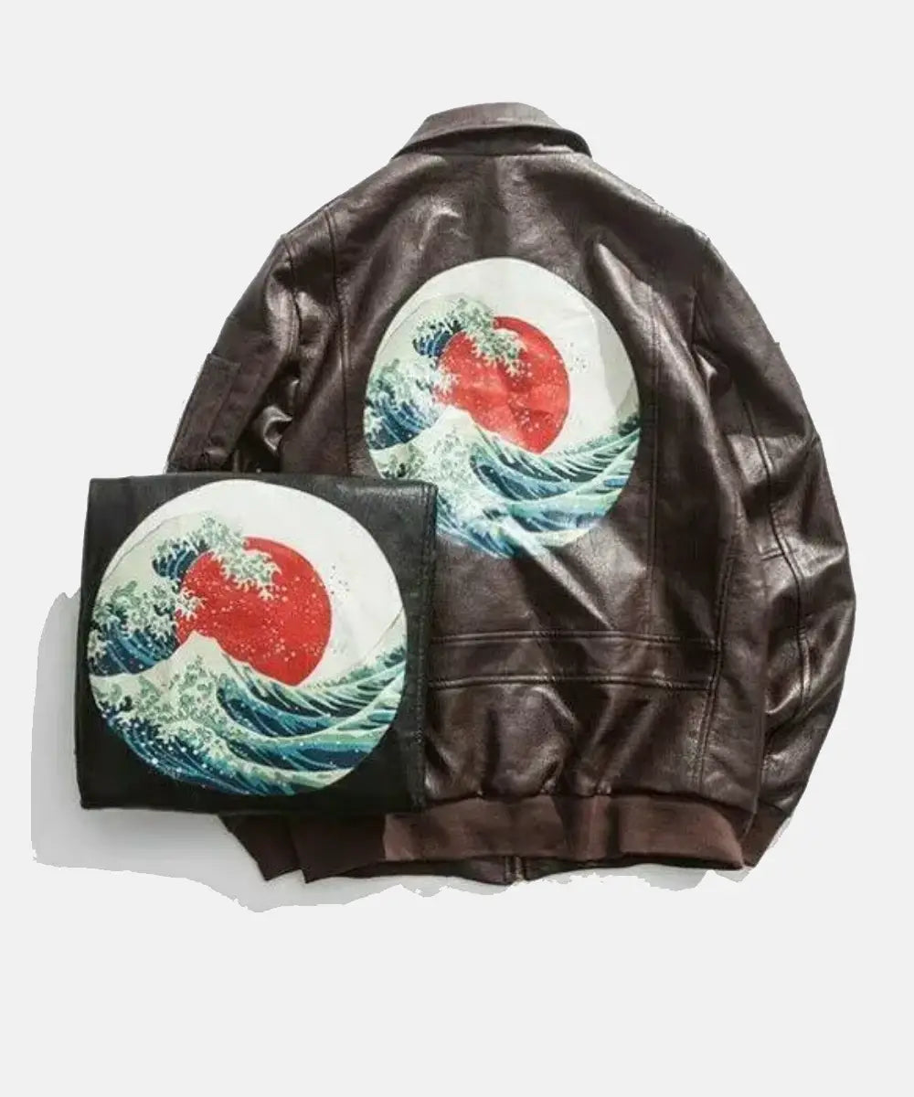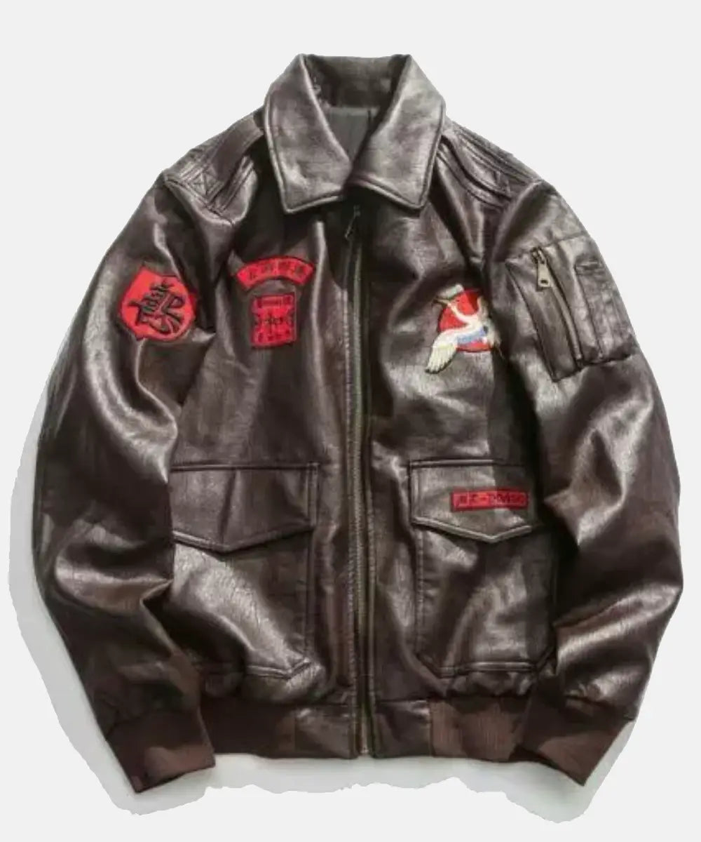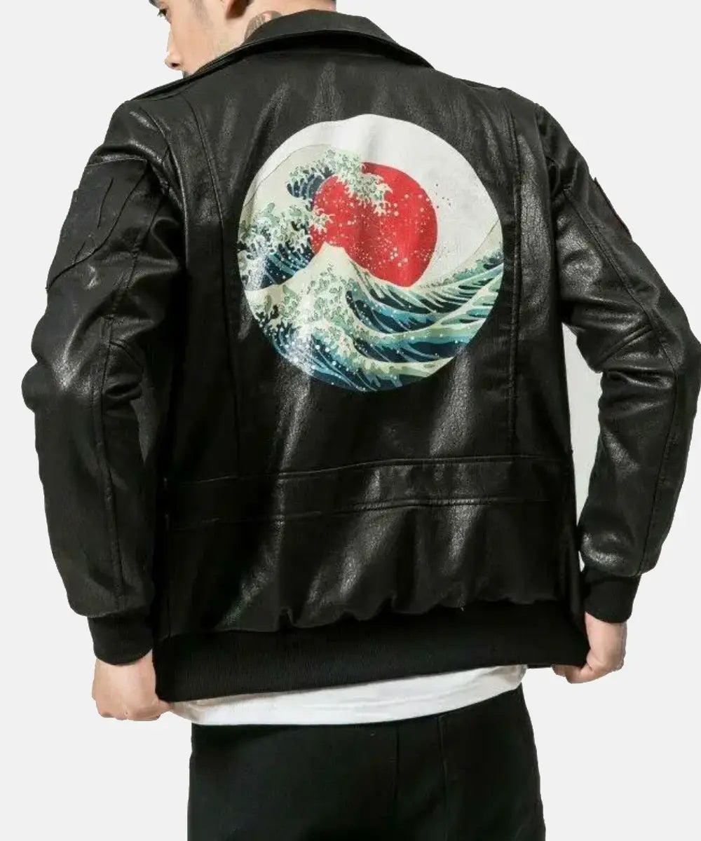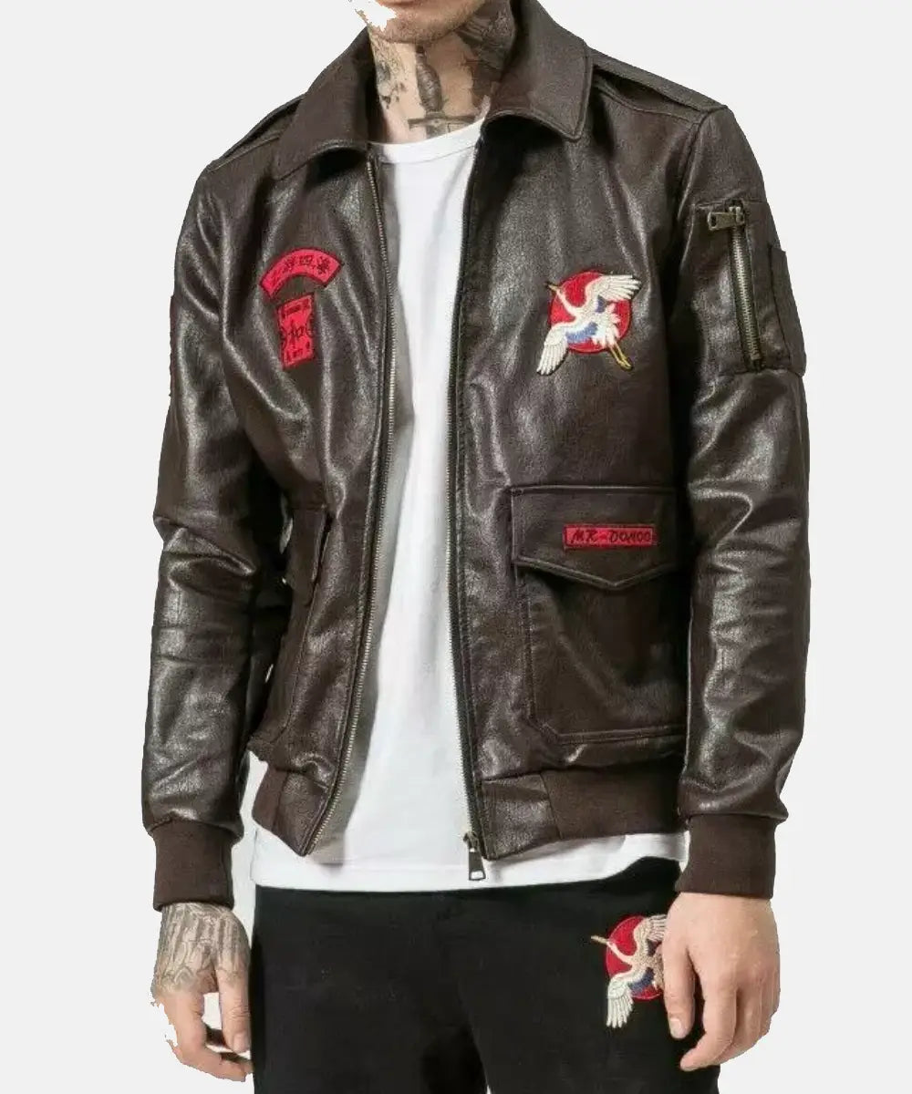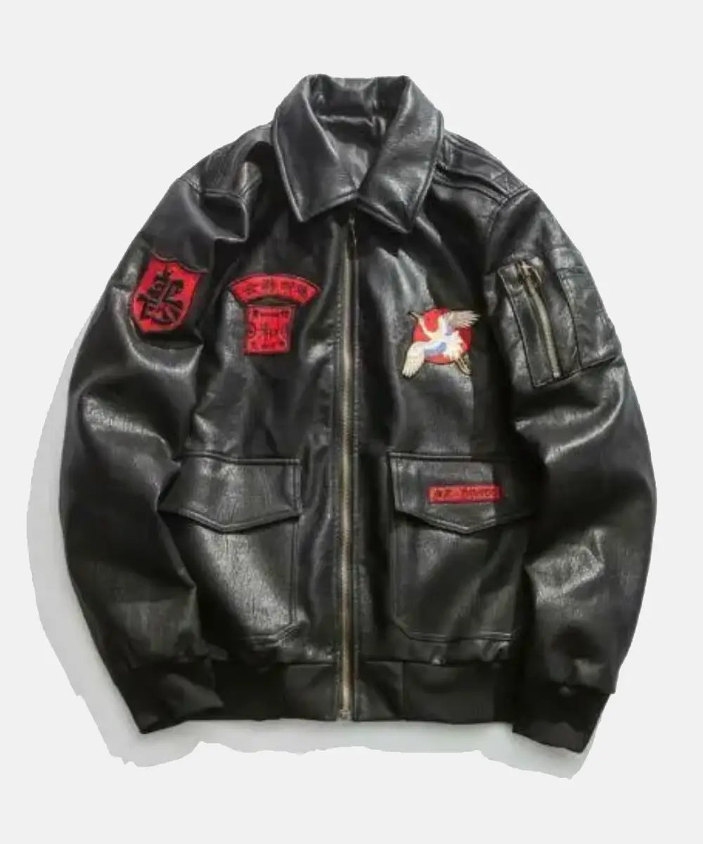 It is a Japanese warrior varsity jacket in black that will give you a stylish look. It has two embroidered logos on the leather jacket, two open pockets, and large sleeves with a cotton border. It’s high time to wear the leather jacket in winter for a blend of warmth and elegance.