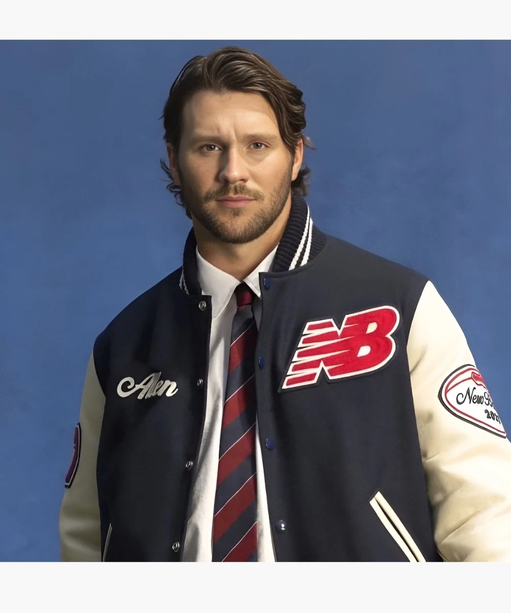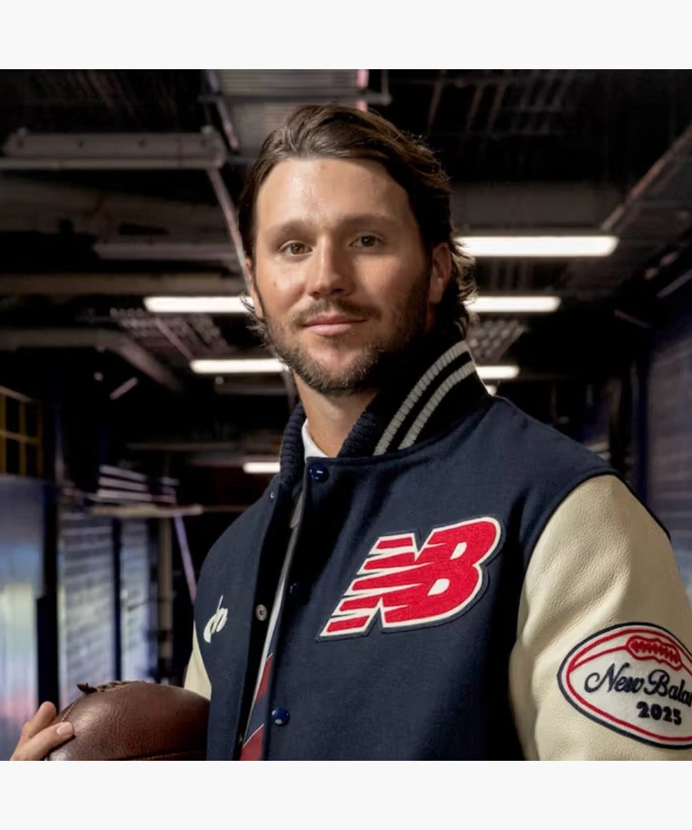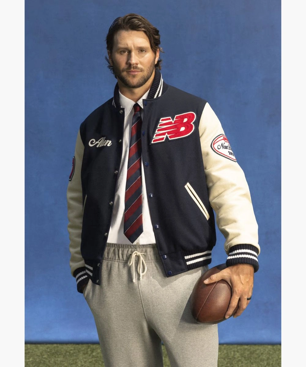 Step into excellence with game day energy turned into everyday style in this Josh Allen New Balance Varsity Jacket. A premium sports craftsmanship in a striking navy blue and crisp white palette. It has a rich wool body and contrasting leather sleeves featuring New Balance and Josh Allen patches across the chest. The soft fabric feels cosy and keeps you warm during chilly weather. The Josh Allen New Balance Blue & White Varsity Bomber Jacket has a snap button front and a collar with striped rib trim. It keeps its sleek appearance while providing an ideal mix of comfort and structure. Â