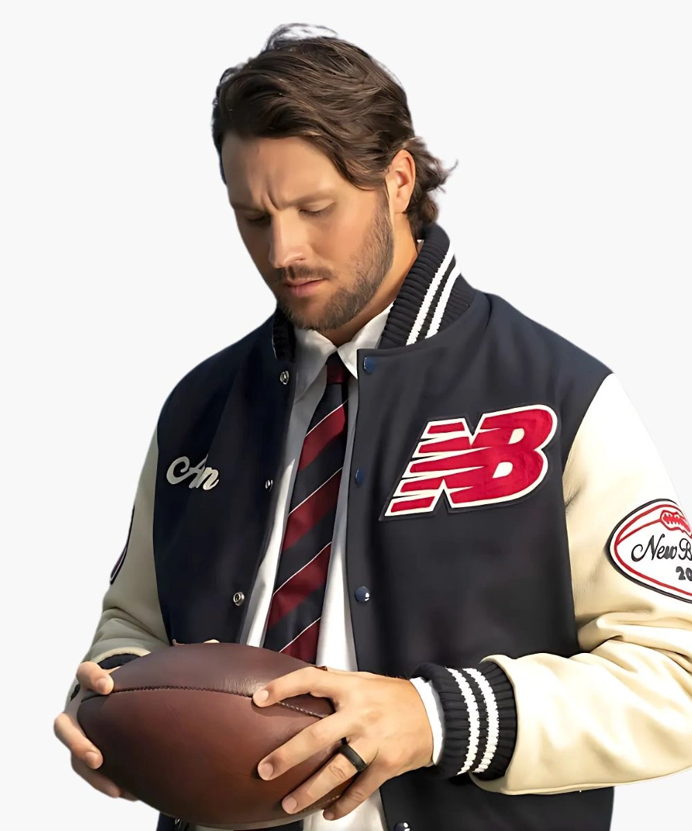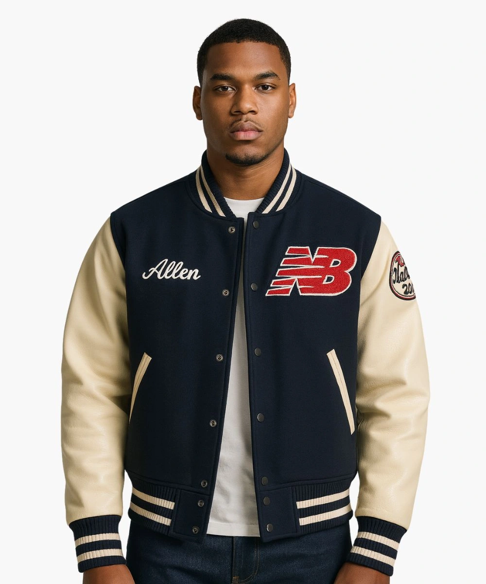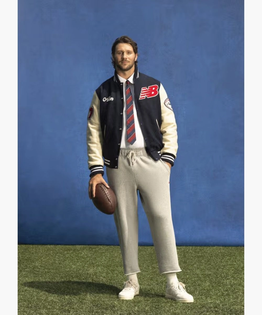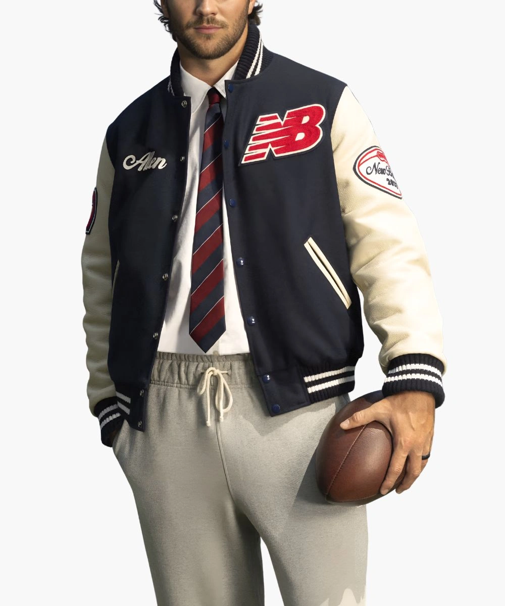 Step into excellence with game day energy turned into everyday style in this Josh Allen New Balance Varsity Jacket. A premium sports craftsmanship in a striking navy blue and crisp white palette. It has a rich wool body and contrasting leather sleeves featuring New Balance and Josh Allen patches across the chest. The soft fabric feels cosy and keeps you warm during chilly weather. The Josh Allen New Balance Blue & White Varsity Bomber Jacket has a snap button front and a collar with striped rib trim. It keeps its sleek appearance while providing an ideal mix of comfort and structure. Â