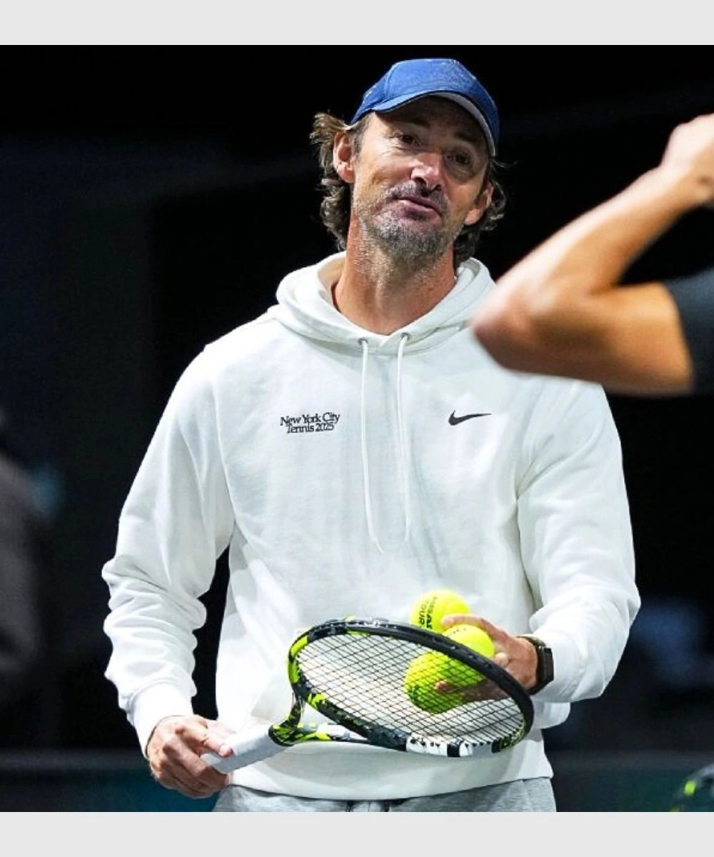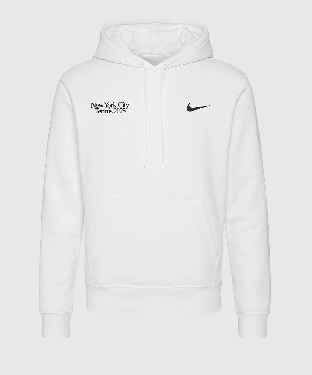 This Juan Carlos Ferrero Rolex Paris Masters white hoodie has a New York City Tennis 2025 typography in black and a Nike logo print across the chest. The crisp white piece and tailored look boast a clean silhouette, making it a versatile wardrobe wear. A front kangaroo pocket adds everyday utility with flair. You can wear it solo or beneath a bomber for a layered finish. Upgrade your style with this hoodie that’s as comfortable as it is stylish–Place your order now!