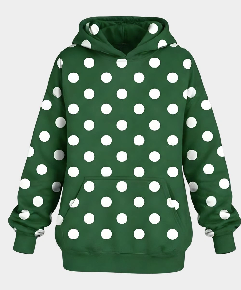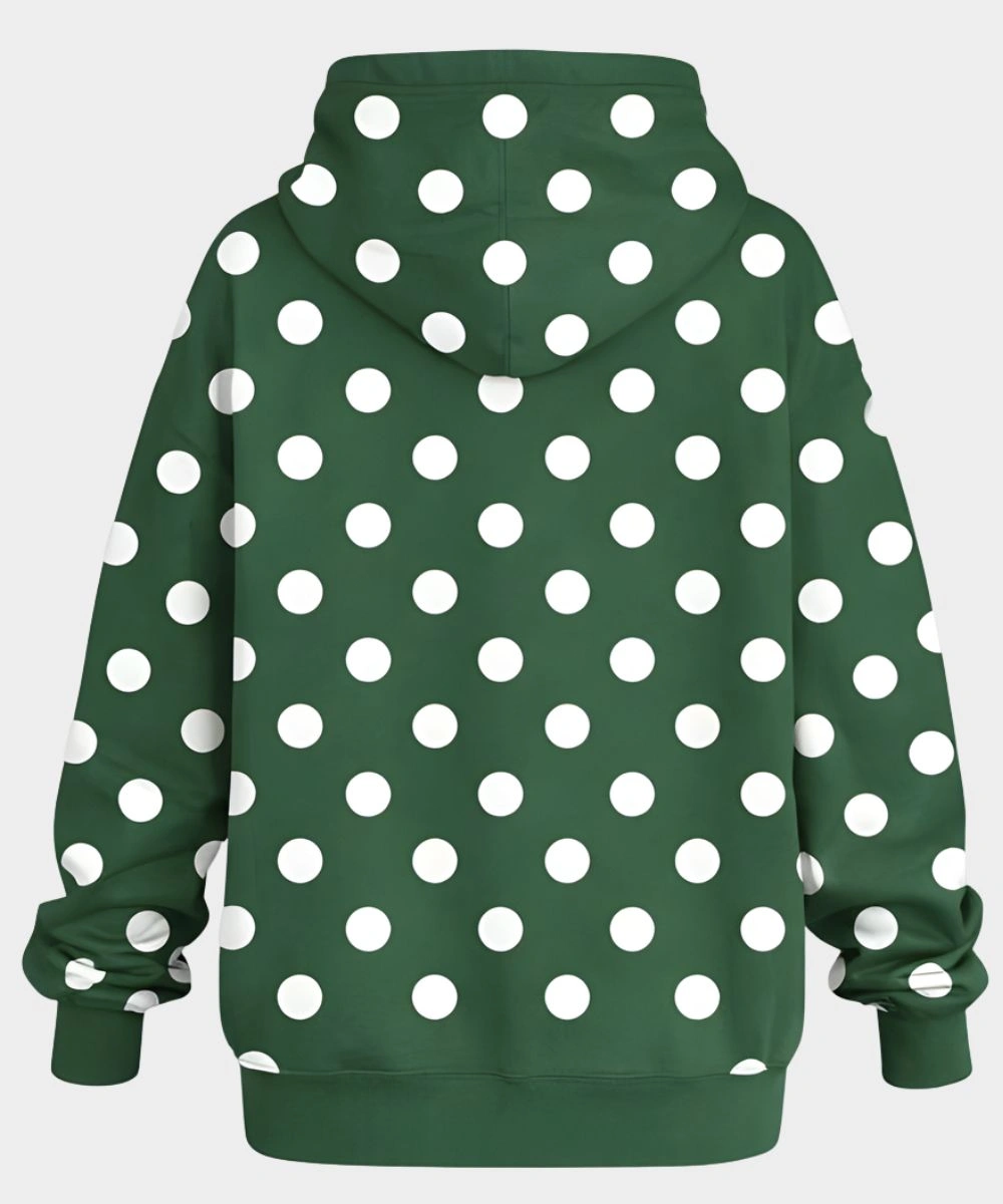 Defined by a functional hooded collar that offers a deep and protective fit against the elements. Its classic pullover closure gives a streamlined look and effortless wear. The striking emerald green has a distinctive white polka dot pattern in a visual rhythm that remains consistent throughout the design. It has rib knit cuffs and hemline to secure a snug fit and structure. This garment’s versatility allows the wearer to shift from a striking statement garment in a city environment to a highly comfortable layer. It delivers a durable and artist-inspired aesthetic that celebrates individuality and the craft of modern streetwear, while featuring a roomy kangaroo pocket that provides handy storage for your necessities.