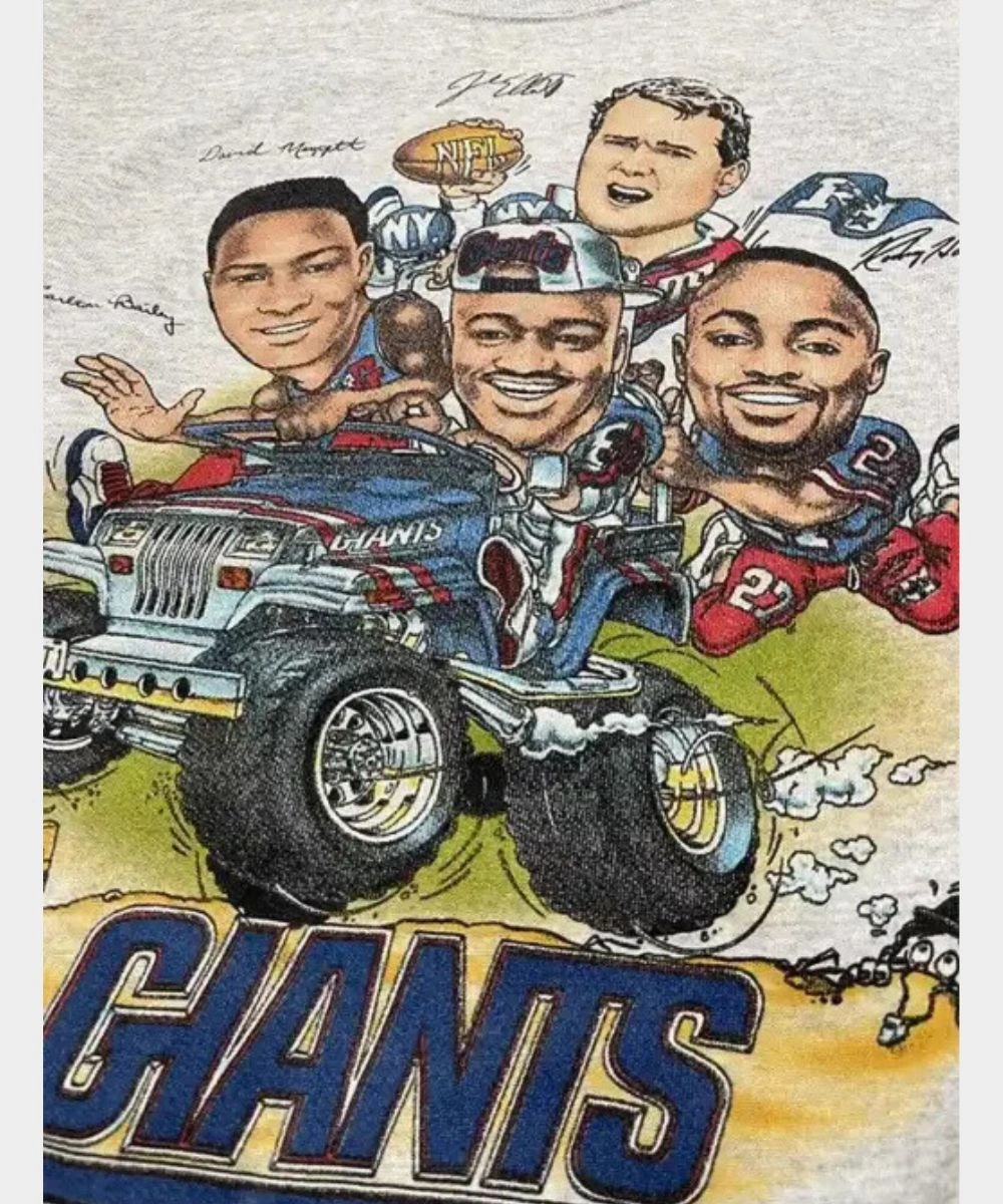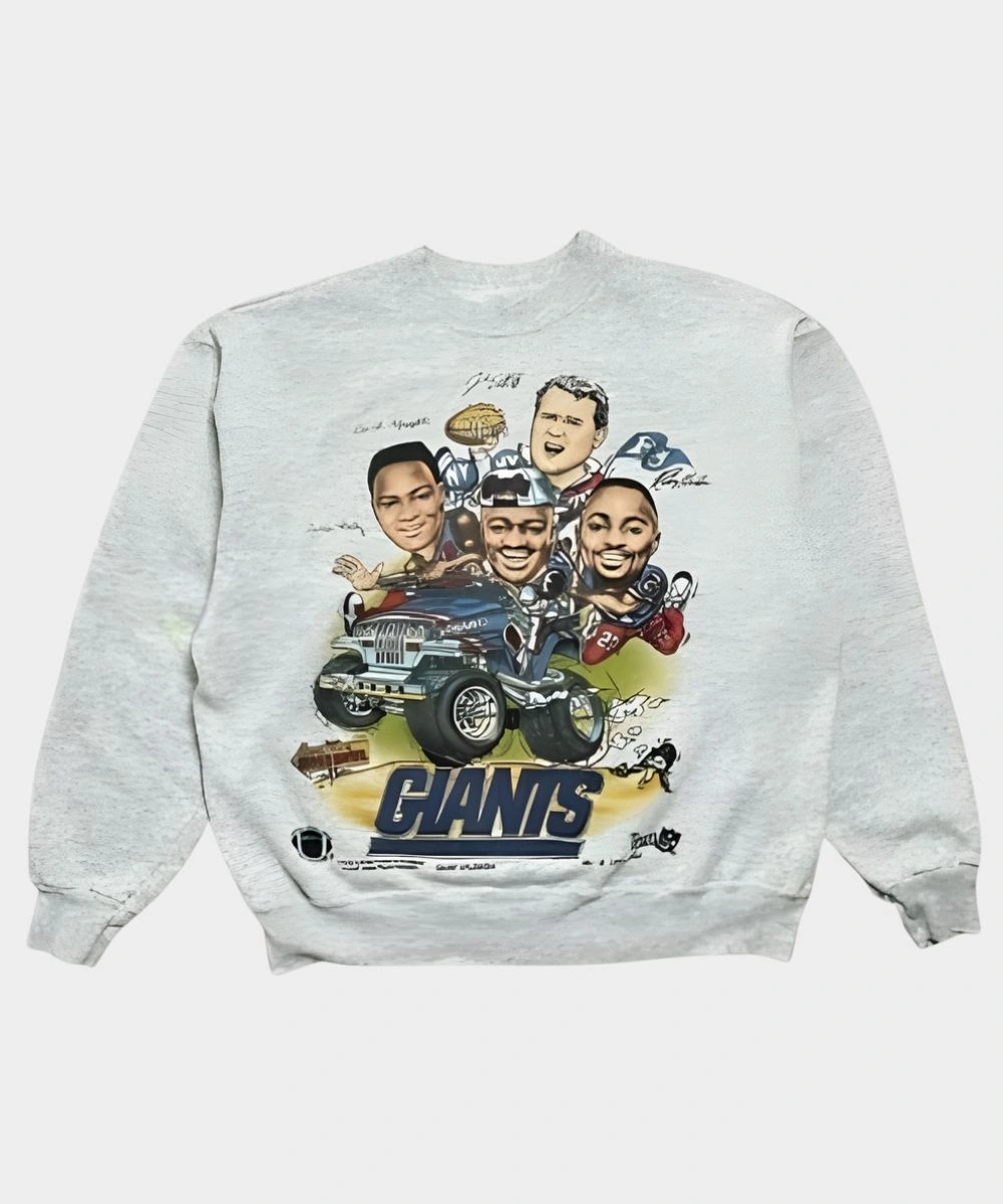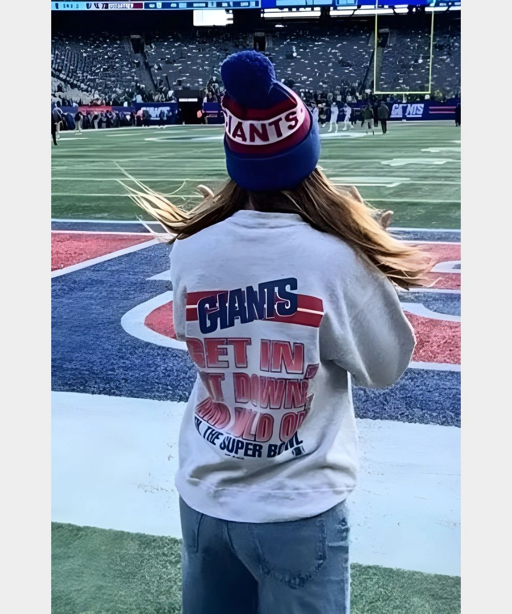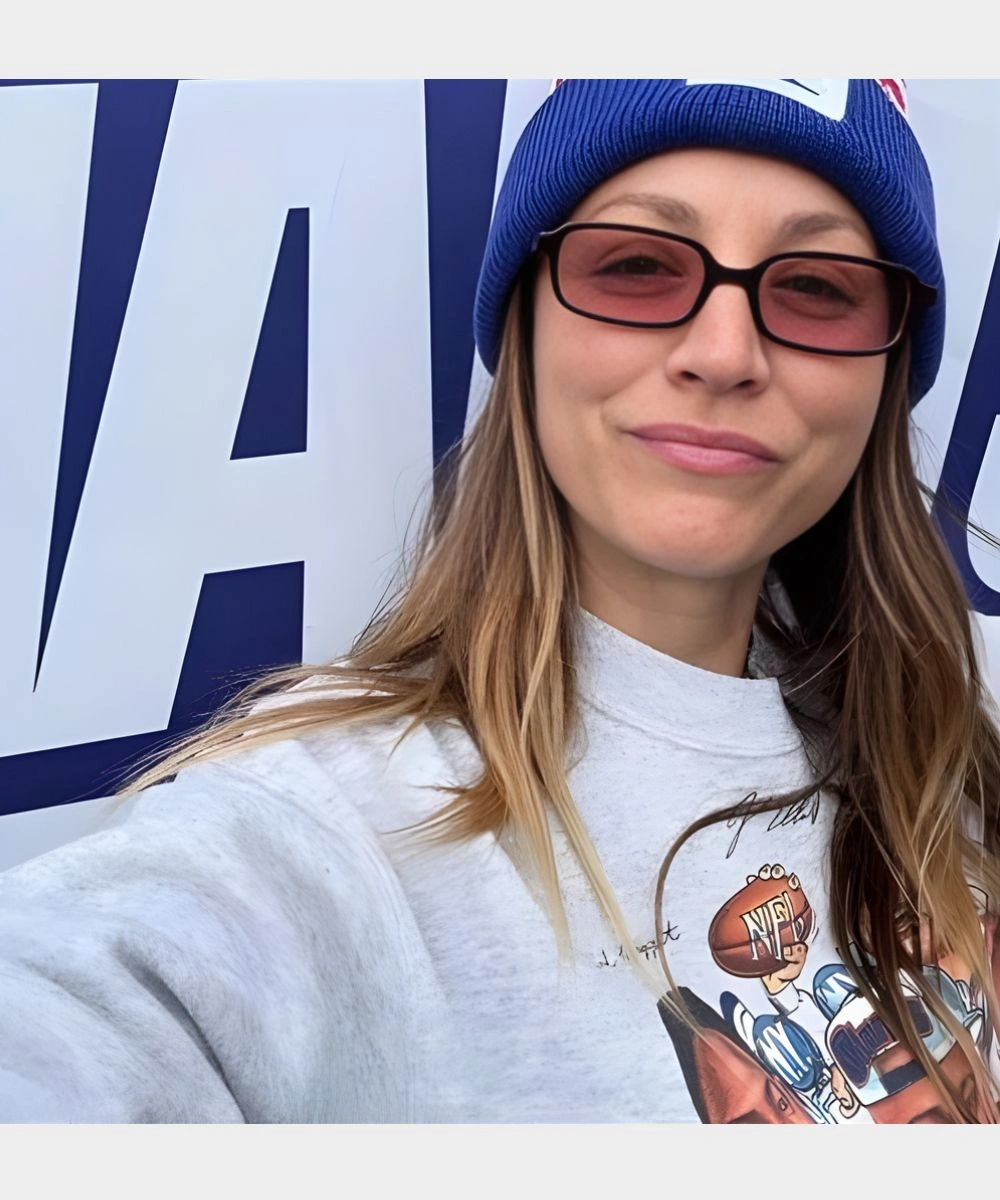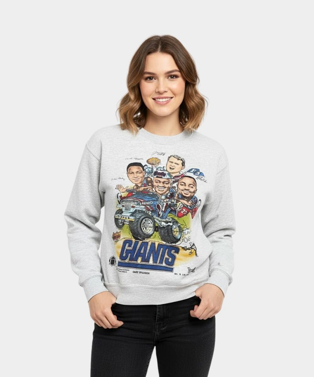 Rock your Giants pride with bold energy everywhere you go in the Kaley Cuoco 2025 Giants Caricature Sweatshirt. This piece represents the popular The Big Bang Theory star Kaley Cuoco’s playful style and gives a fan friendly appeal. It is made from fleece in a grey shade with striking graphics that add Giants imagery, star power and sports fandom. The soft fabric offers a plush and comfortable feel. It is perfect to add to everyday style or layer when the temperature dips. The crew round neckline gives a minimal yet timeless look. It keeps things snug and in place. The front features a cartoon illustration and the back is finished with an eye catching game day slogan.Â