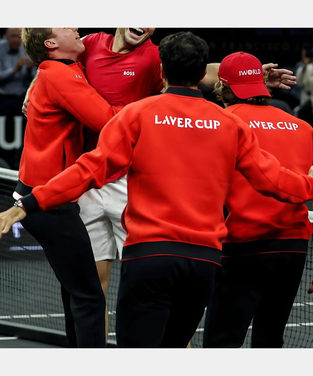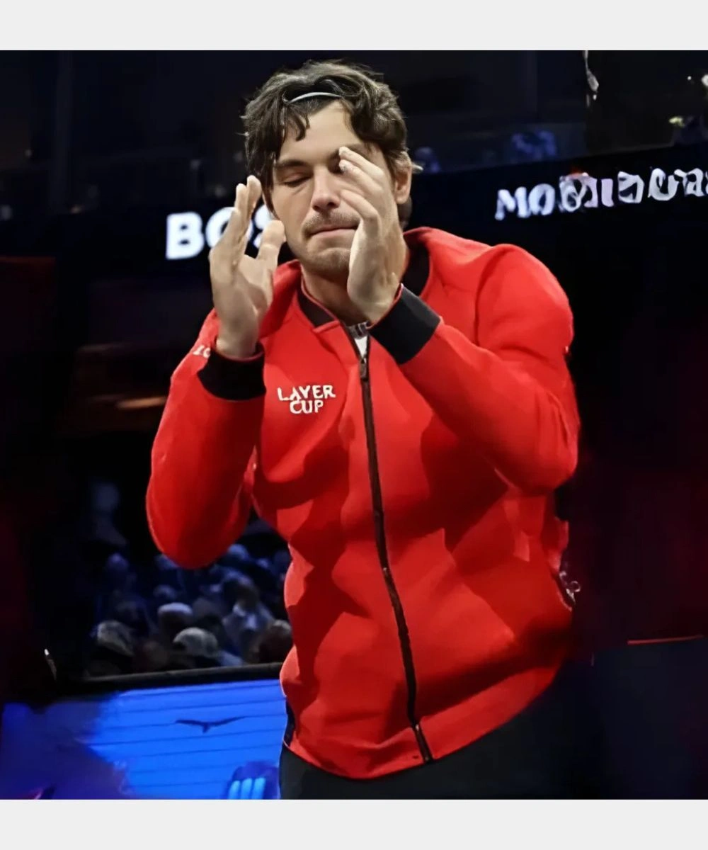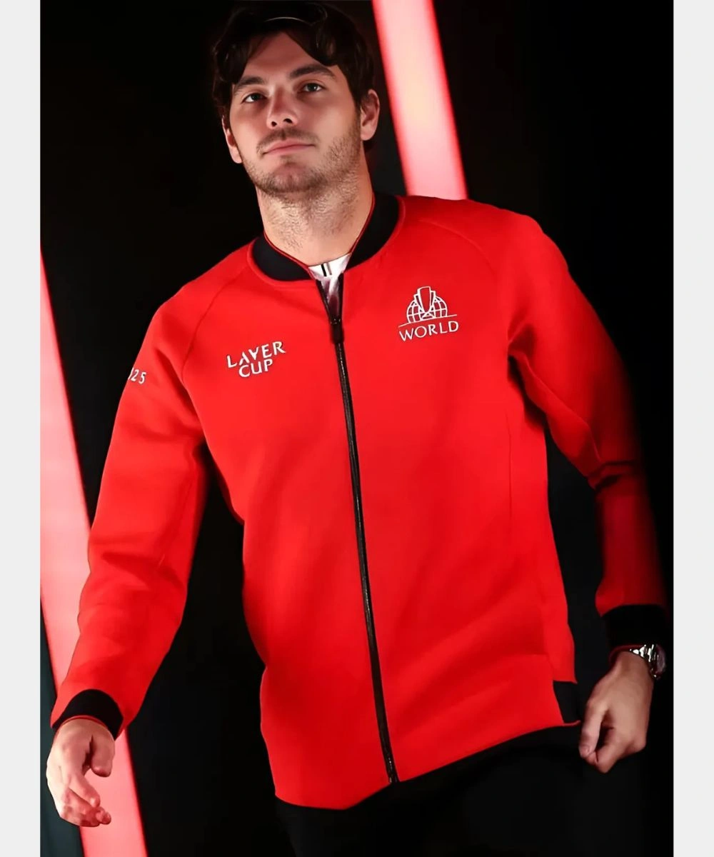 Ignite your style and performance with the Laver Cup 2025 Taylor Fritz Red Jacket. Made from fleece with a vivid red hue that delivers an instant impact. Its smooth, structured fabric holds its shape yet allows you to move comfortably. The design includes a rib knit collar and zip front closure for a sleek look. It balances both power and polish with sharp tailoring and a contemporary vibe. Shop Laver Cup 2025 Taylor Fritz Zip-Up Red Bomber Jacket to raise your style game instantly. It has a Laver Cup branding across the chest and on the back.Â