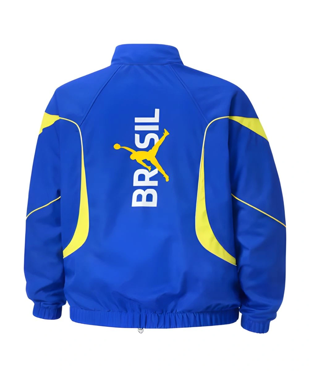 Channel the samba beat and high octane energy of South American street culture with this Ludmilla Rio Carnival Jordan Brazil Jacket. This piece is a true style standout of athletic heritage and carnival vibrance, inspired by the iconic presence of Ludmilla. The construction utilizes a high-end polyester fabric for a lightweight, wind-resistant shield. Its deep royal blue body serves as a bold canvas for the striking contrast panelling in neon yellow that curves along the sides and sleeves.Â