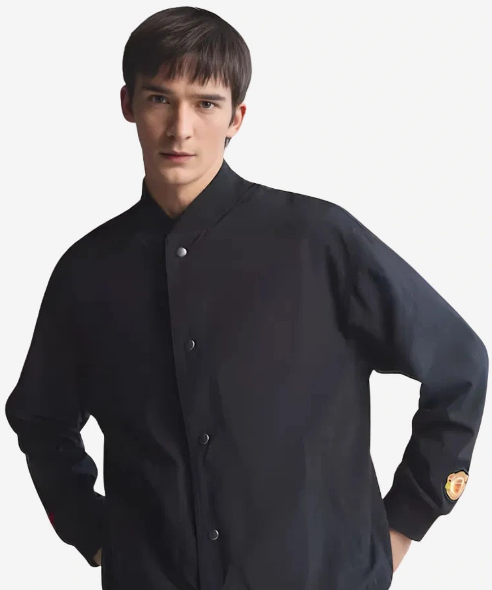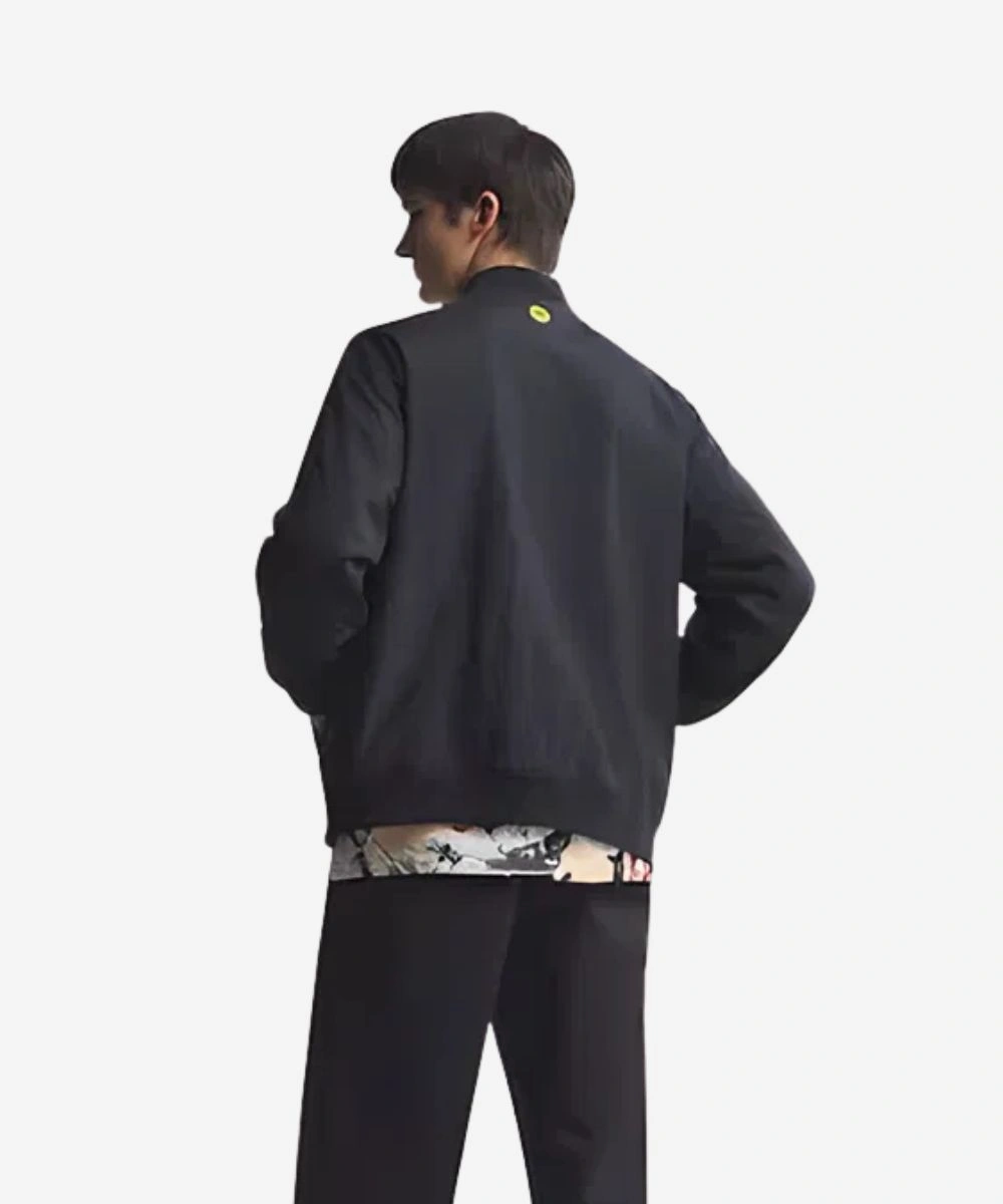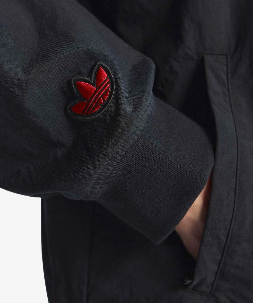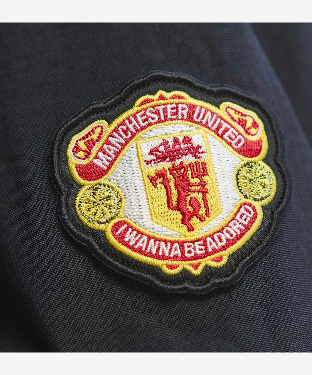 Stay warm with the spirit of Britpop energy and football culture edge in this Manchester United x Adidas Stone Roses Jacket. Designed with a durable black polyester in a sleek black tint that provides a satin-like feel and pure comfort. This Adidas jacket pays tribute to the Manchester era that functions as both a nostalgic tribute for fans and a high-fashion statement. It has a ribbed collar and a front button fastening that enhances the traditional varsity vibe. A bold “I Wannabe Adored” artistic graphic patch brings legendary club pride to the front. It also features the signature Stone Roses lemon symbol at the back of the neck and a small adidas patch on the sleeves.