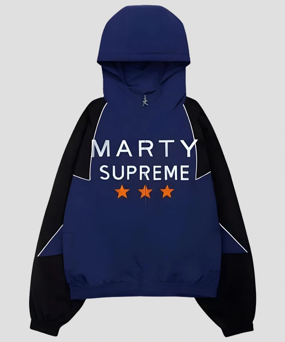Design includes a seamless zipper for optimal functionality and a hood collar that protects from the elements. The Marty Supreme Blue & Black Hooded Jacket has sharp color blocking of a deep blue shade intersected by a solid black section. A high definition Marty supreme graphic print is integrated at the front centre. It creates a streamlined look and makes it a collectable piece for every wardrobe. The casual cut has elastic cuffs and a hem to highlight the athleticism. It includes two side pockets for holding daily items on the go.
