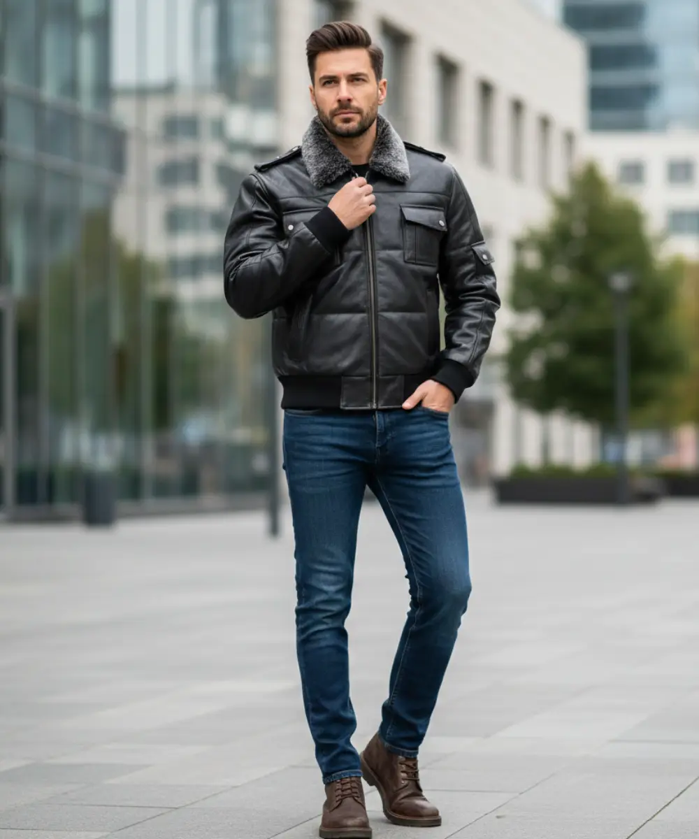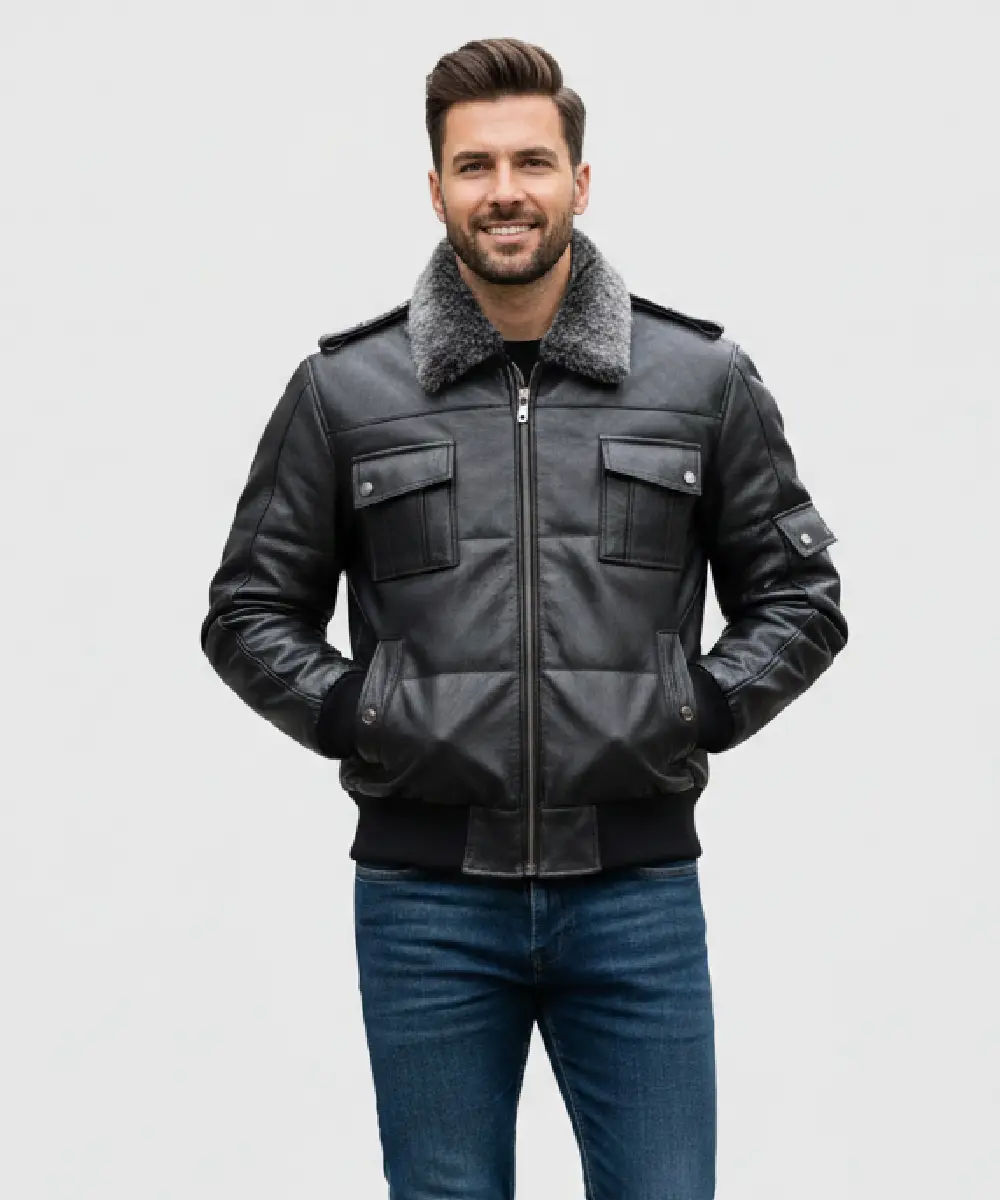 You can wear side pockets having features zipper closure on a winter leather jacket. You can wear a skin pilot flying a brown winter bomber-style coat. You can wear a winter leather jacket with side pockets that have features like a rust-resistant zipper designed for premium lambskin pilots.