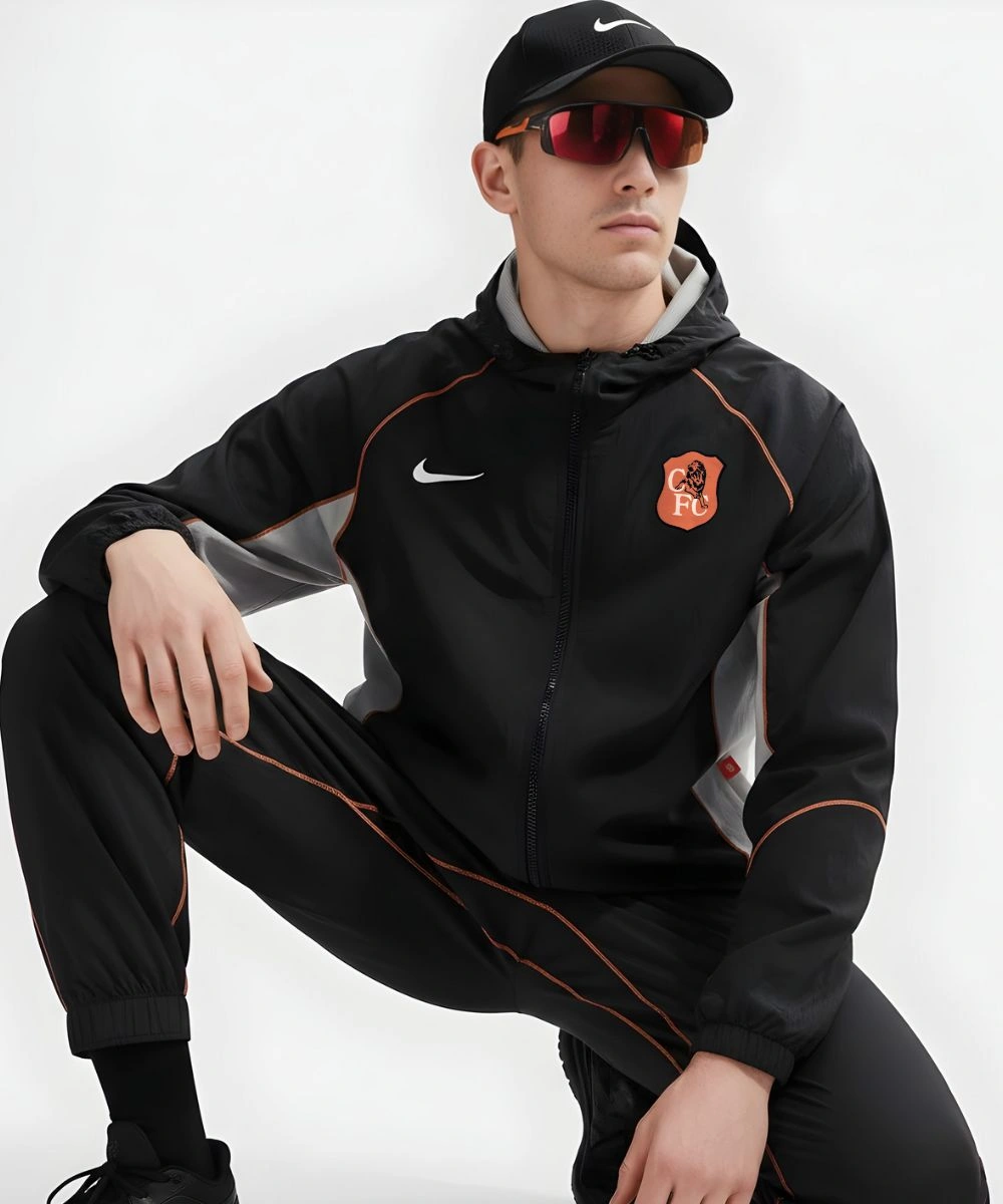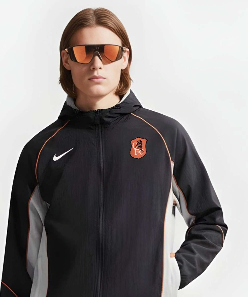The full-length zipper and elastic cuffs add a streamlined fit. They ensure a quick and secure look that moves with you. Designed for those who need a blend of professional sportswear and premium urban streetwear. The technical design and functionality of this Chelsea Nike Repel Strike Hooded Jacket withstand the elements. It has a Nike graphic across the chest and dual side pockets for keeping essentials.Â