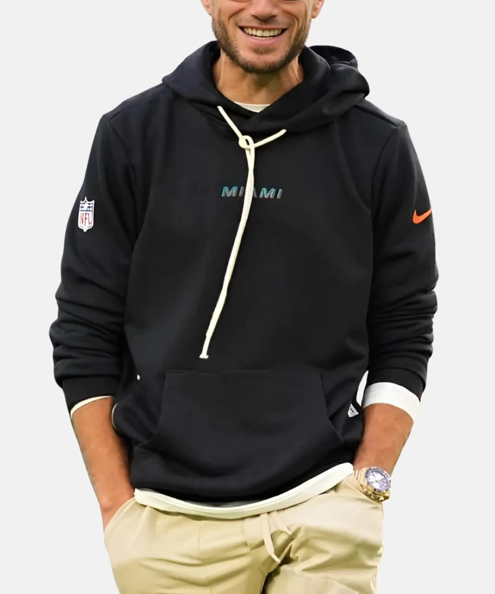 Shop Mike Mcdaniel Miami Dolphins Nike 2025 Rivalries Sideline Dri-FIT Hoodie – Navy Blue and wear your fandom loudly and proudly. The cut is relaxed to layer yet structured enough to wear solo. Ribbed cuffs and hemline hold the shape season after season. The full-length sleeves feature an NFL patch and Nike branding, while kangaroo pockets are perfect for your everyday essentials.