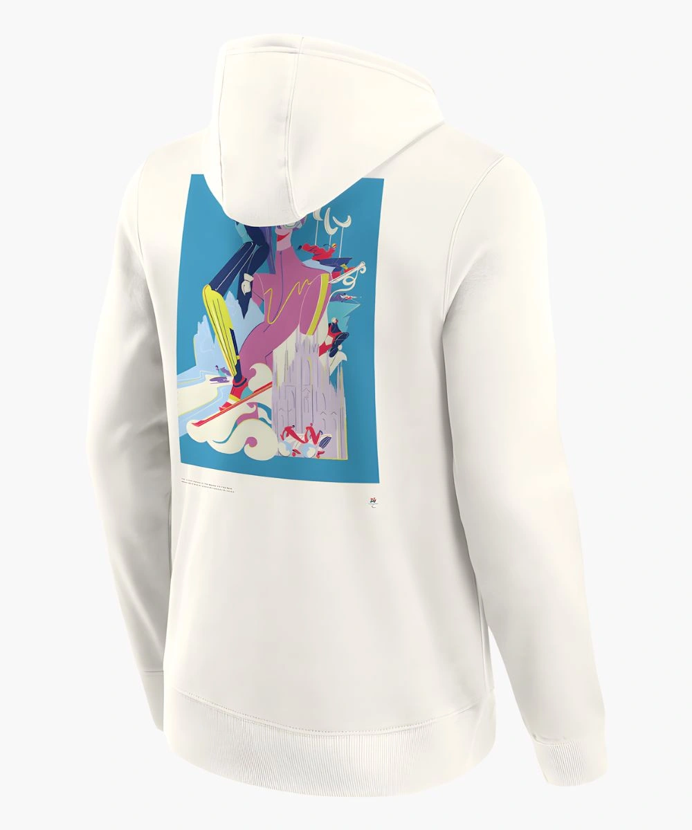 The pullover style has a practical hood and rib knit cuffs to deliver a structured silhouette and retain its shape for years. The design is centred around the iconic poster graphic detail that represents Milano Cortina energy, printed with precision to ensure longevity. It has a complementary Paralympic branding on the chest to add a layer of authenticity for collectors and fashion enthusiasts.Â