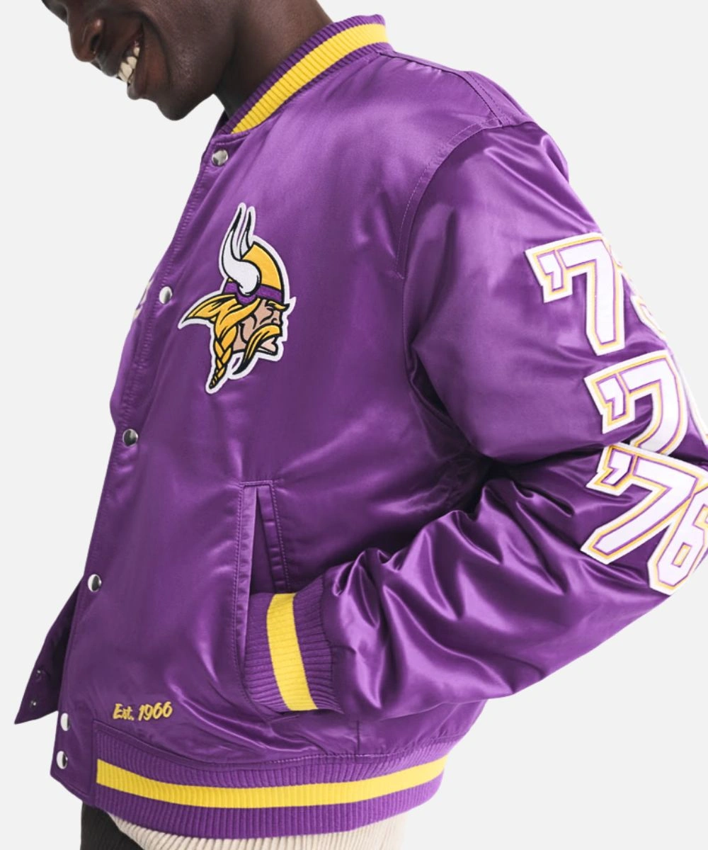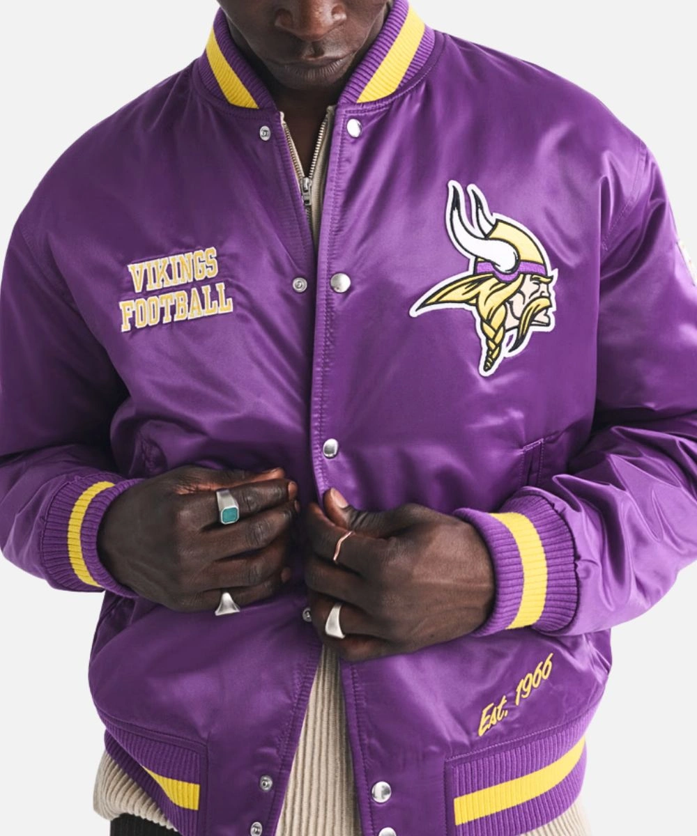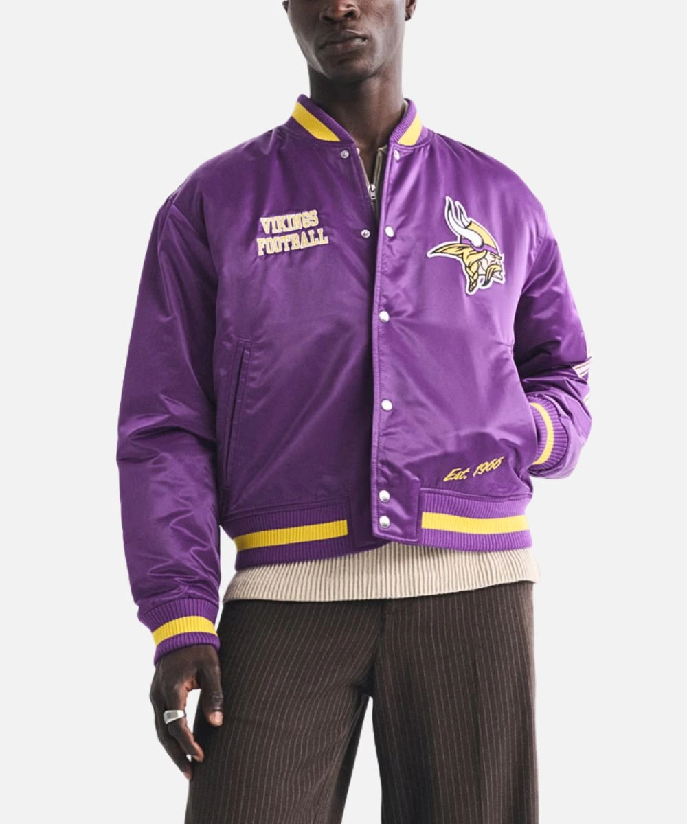 Exhibit your Vikings pride with timeless varsity style in the Minnesota Vikings Purple Varsity Jacket. Constructed from luxurious satin with a loose silhouette for comfort, clarity and fan aesthetics. It has Minnesota Viking patches across the chest that swipe right into your team pride. The rich finish adds a sleek, standout edge. Men’s Abercrombie Minnesota Vikings Varsity Bomber Jacket In Purple features a rib knit collar, cuffs and hemline for a textured finish. It enhances the varsity aesthetic and adds cosy warmth.Â