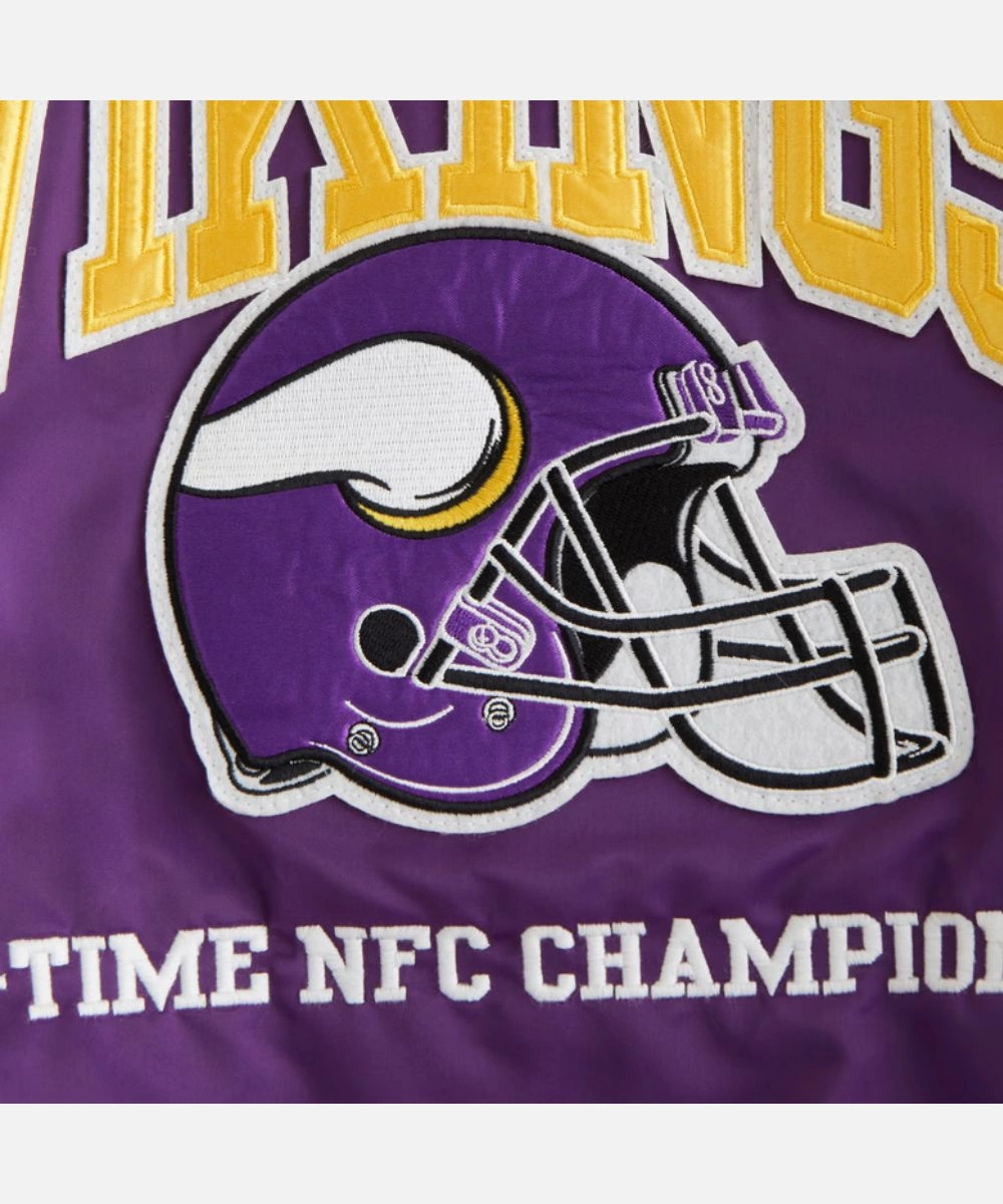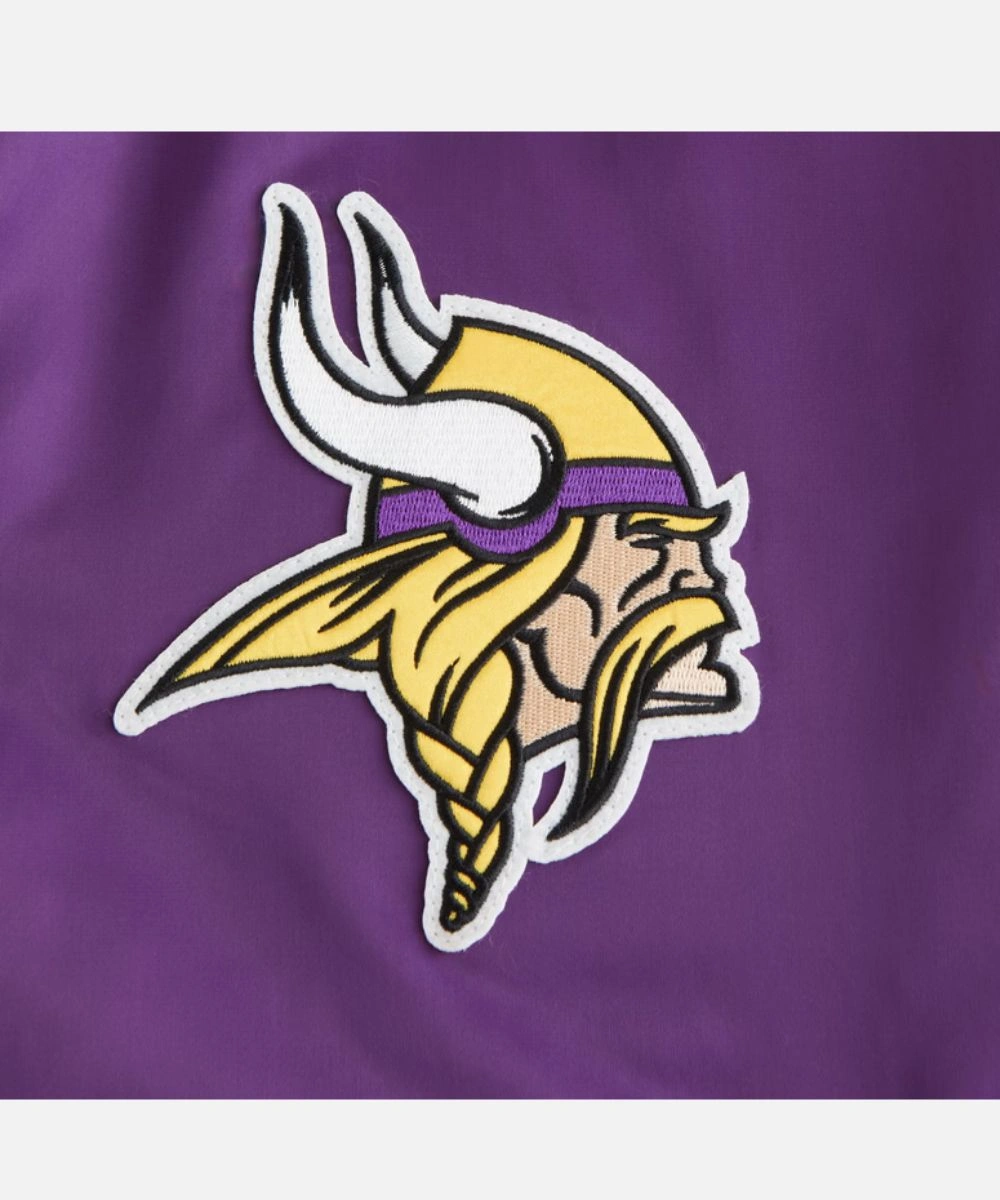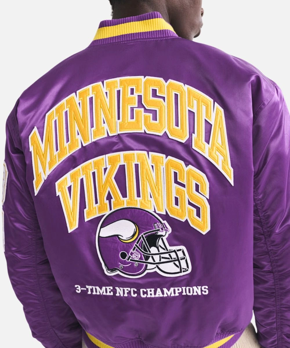 Exhibit your Vikings pride with timeless varsity style in the Minnesota Vikings Purple Varsity Jacket. Constructed from luxurious satin with a loose silhouette for comfort, clarity and fan aesthetics. It has Minnesota Viking patches across the chest that swipe right into your team pride. The rich finish adds a sleek, standout edge. Men’s Abercrombie Minnesota Vikings Varsity Bomber Jacket In Purple features a rib knit collar, cuffs and hemline for a textured finish. It enhances the varsity aesthetic and adds cosy warmth.Â