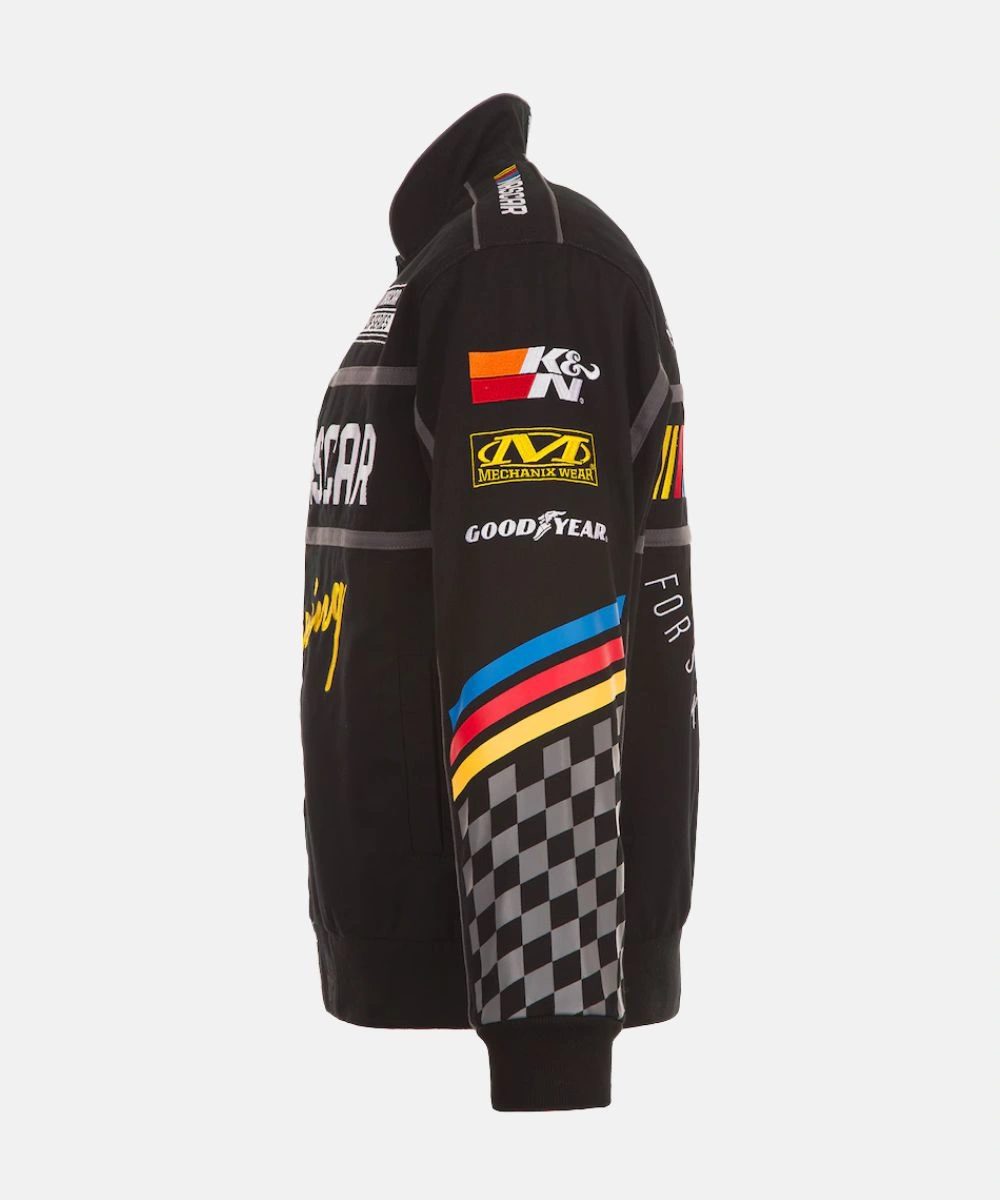 The Black Twill NASCAR JH Design Full Snap Jacket is perfect for both men and women. It is a statement that goes beyond casual and works for track days and weekend rotation. The relaxed silhouette is easy to layer but retains a sharp outline when worn on its own. This jacket has multiple racing emblems that give a graphic impact. You can get a NASCAR Racing print on both sides, and the back also has a National Association for Stock Car Auto Racing print. Rib knit cuffs and hemline ensure a cosy fit and keep the cold air out. Shoulder features epaulette and full-length sleeves have checkered details for style enhancement. The jacket also has two side pockets for storage convenience and cosy hand space. Get ready for the moment–Shop Today!