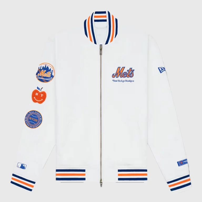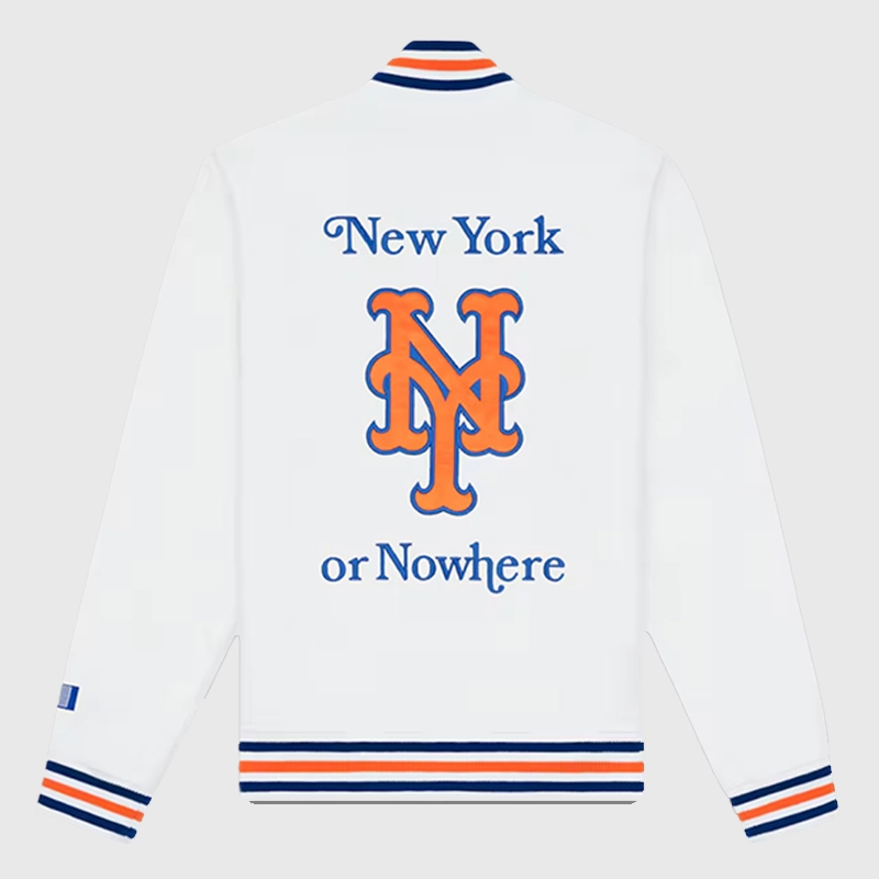 The New York Mets New York or Nowhere x New Era White NYON x MLB Full-Zip Moto Varsity Jacket has soft lining for everyday comfort and warmth during cooler days. It has a striped collar that adds a snug fit and keeps your neck warm. The front features stylized logos embroidered in team colours—the “Mets and New York Nowhere”.