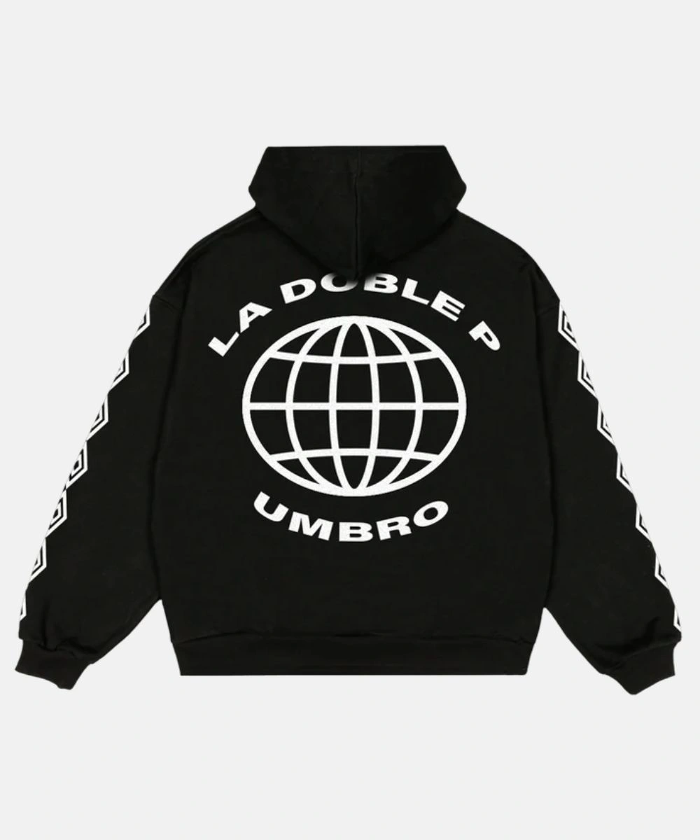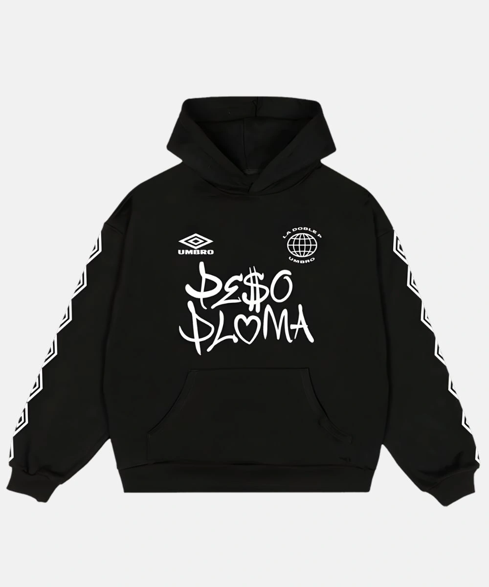 This Peso Pluma x Umbro Hoodie displays striking graphics that merge Peso Pluma with Umbro’s sporty logo prints. It is ideal for layering or wearing alone. The colour way keeps things clean and brings style with purpose. It is more than just a hoodie, but a statement that drops the mark–Don’t miss out!