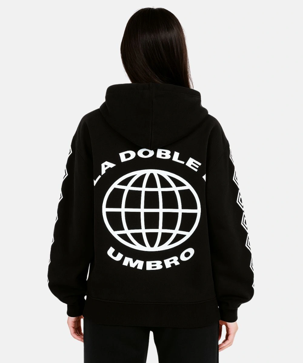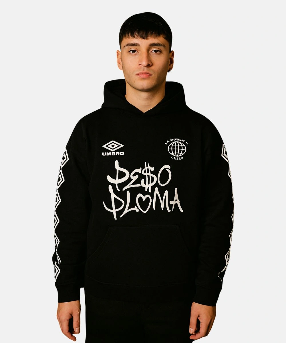 Redefine your streetwear style with Black Pullover Peso Pluma x Umbro Hoodie. It has a fusion of music culture flair with football heritage that delivers both attitude and comfort. Functional features include a roomy hood that feels soft inside and allows you to adjust the look with drawcords. It has a vibrant black base that is constructed from premium fleece and a relaxed silhouette. The rich texture feels expensive and offers pure comfort throughout the year. Rib knit cuffs and hem hold the fit close without feeling tight, and the kangaroo pockets offer cosy space for keeping your hands and carrying essentials.Â