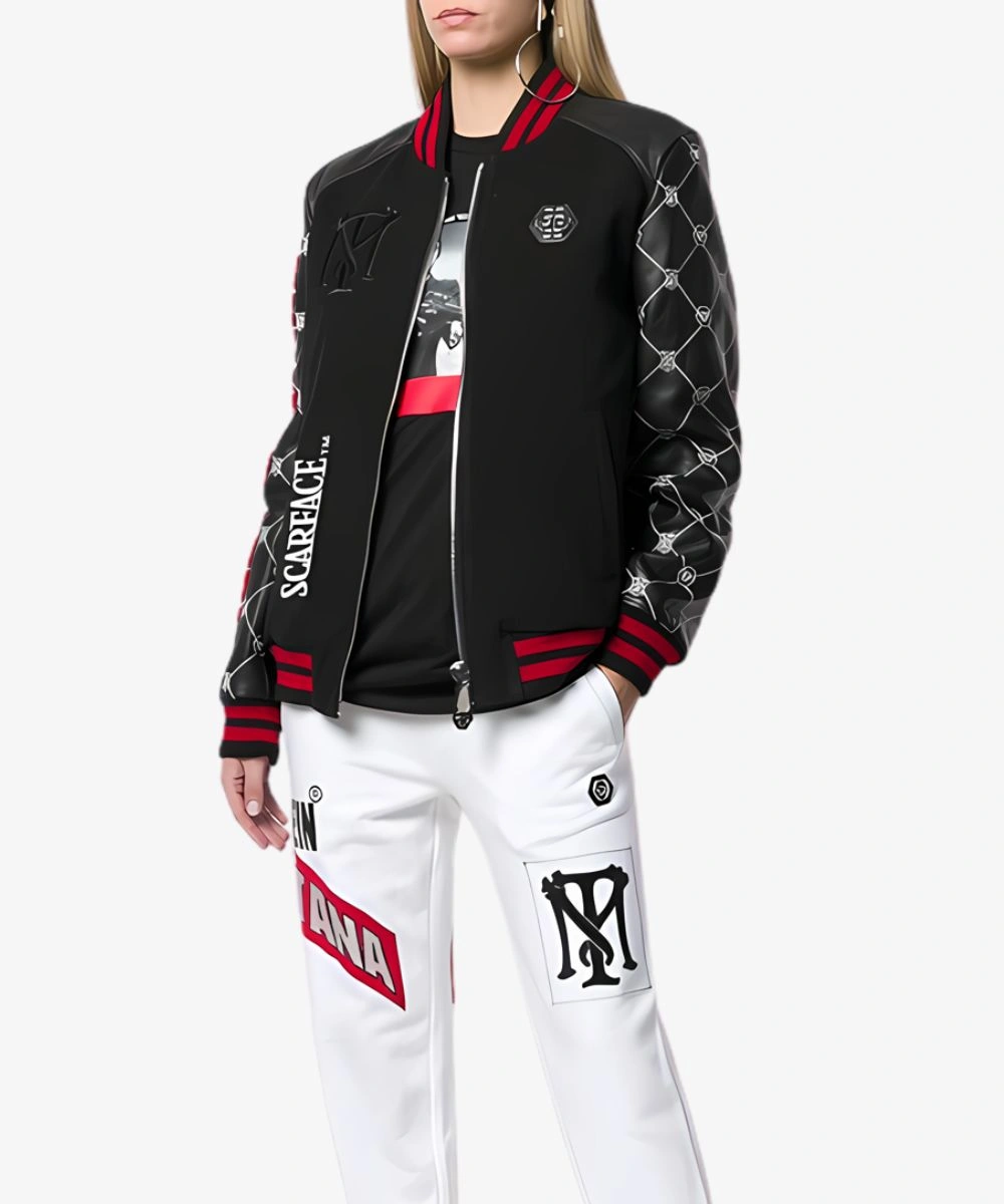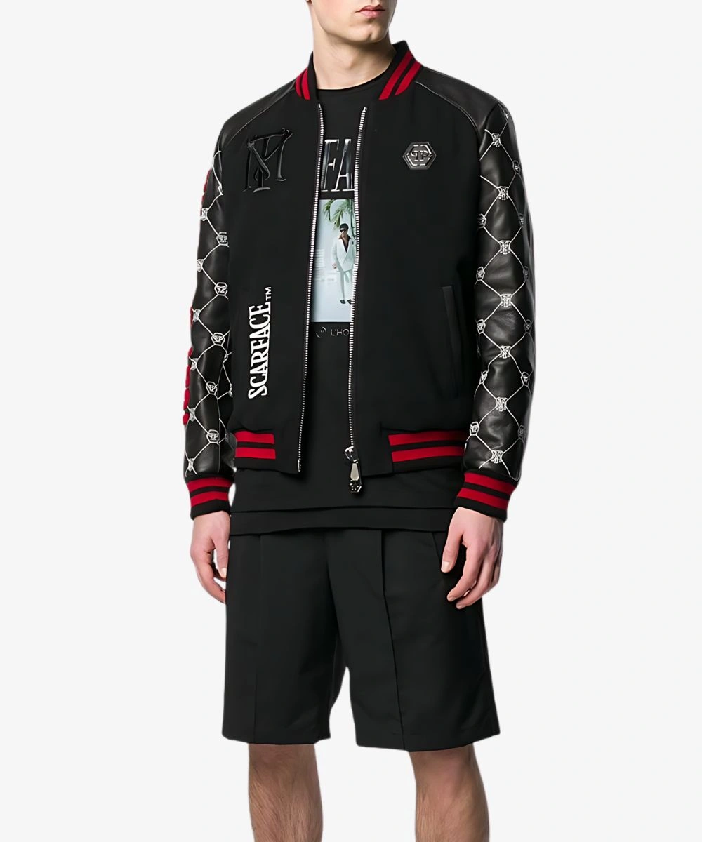 The Unisex Philipp Plein Tony Montana Leather Bomber Scarface Jacket – Black And Red is easy to style. Its sturdy front zipper shines through and ensures you stay cosy. It features a Tony Montana print with high contrast Philipp Plein Scarface embroidery at the back. Perfect for adding a cinematic energy to your looks, this jacket is lightweight yet offers a sharp fit. Whether you like a minimalist silhouette or a casual look, this jacket works with different styles. It has loose sleeves featuring the Tony Montana Lettering motif and two external pockets for storage, and a crisp white Scarface logo.